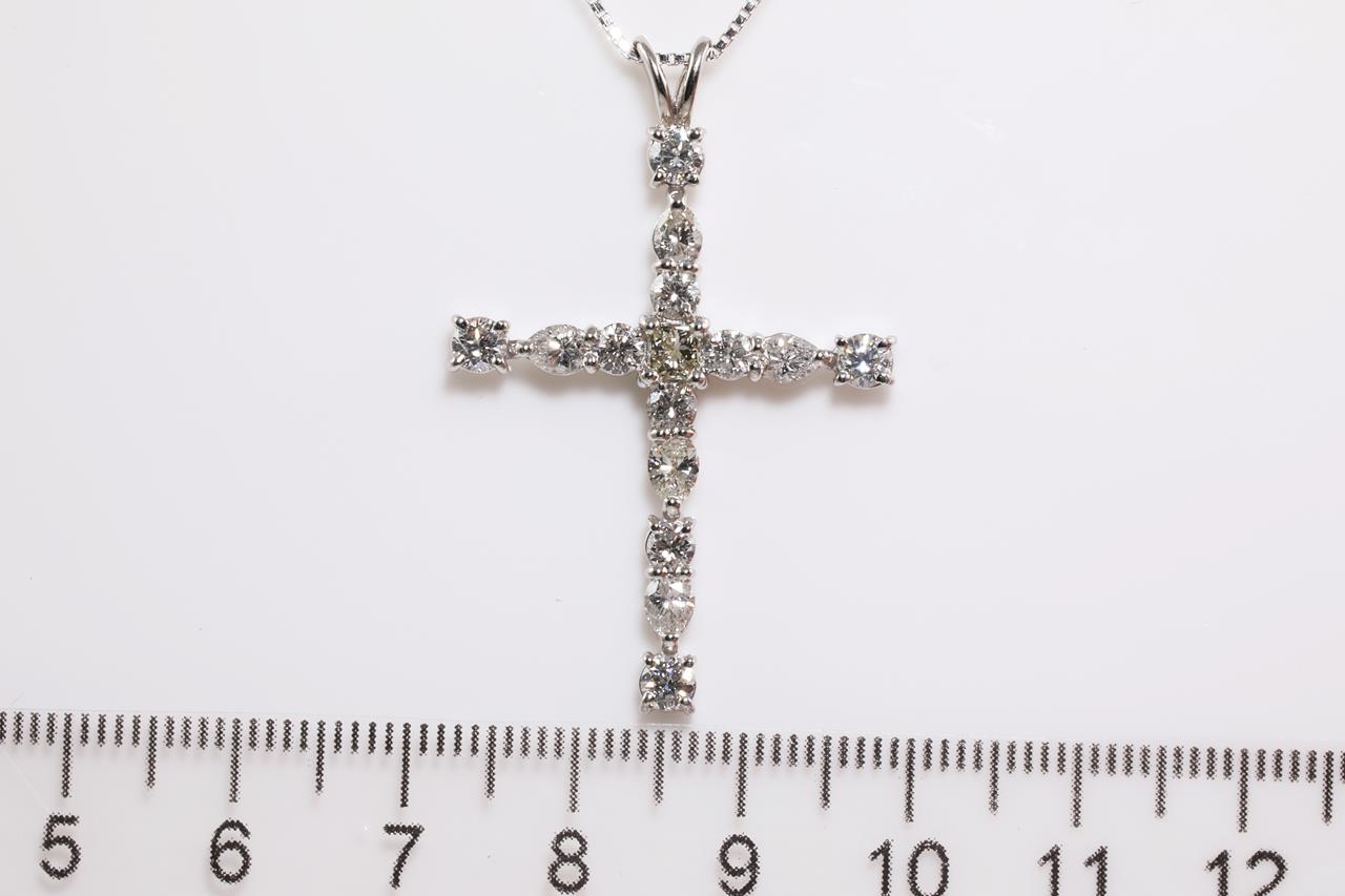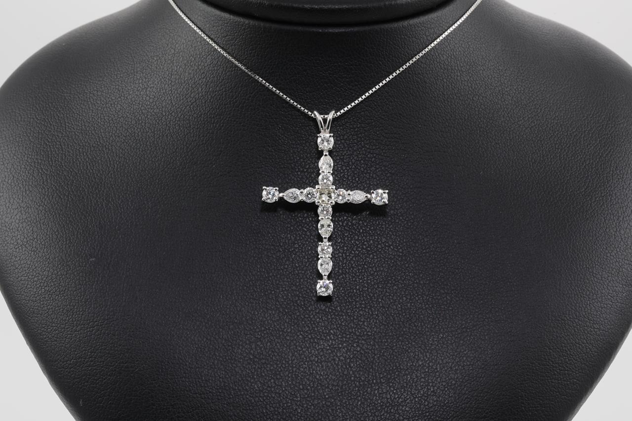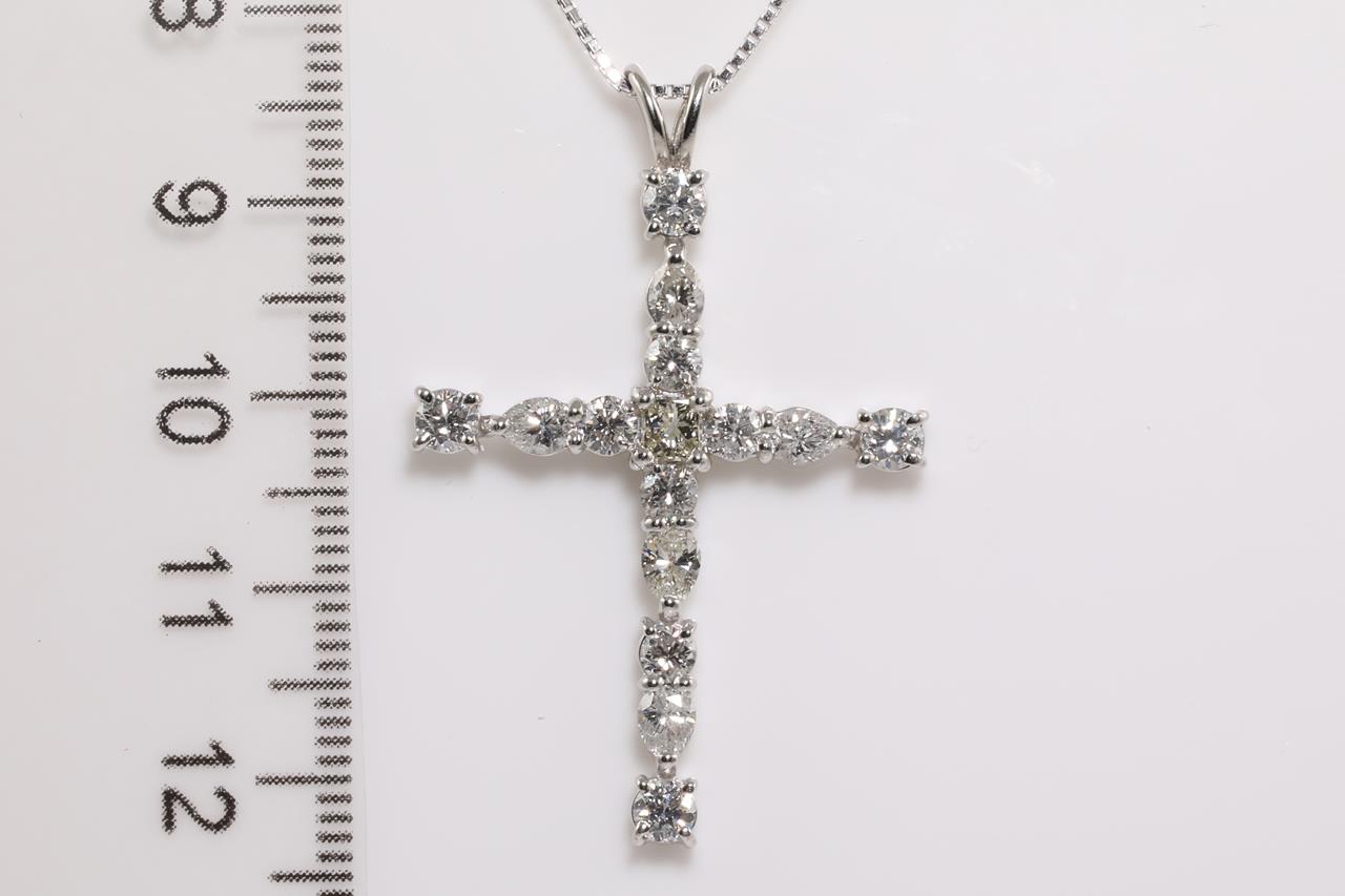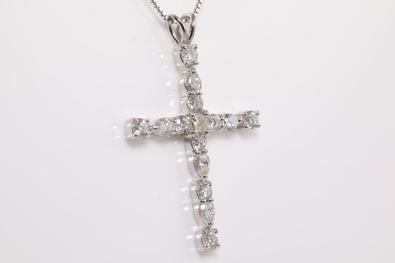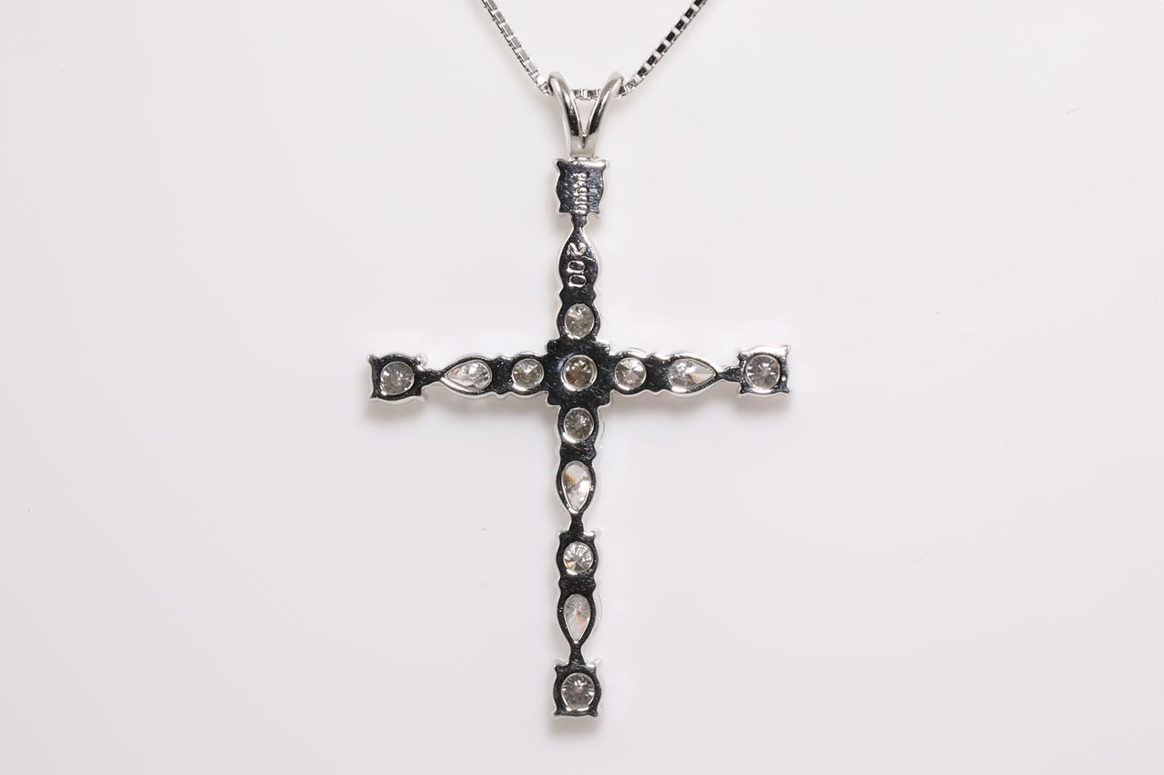 Diamond Cross Pendant with centre princess cut diamond (Estimated grading : K-L SI) and round & pear shape Diamonds all totalling 2.00cts (Estimated grading: G-I SI-P1). Platinum with 44cm 18ct white gold adjustable chain. Weight: 8g (Pre-owned)