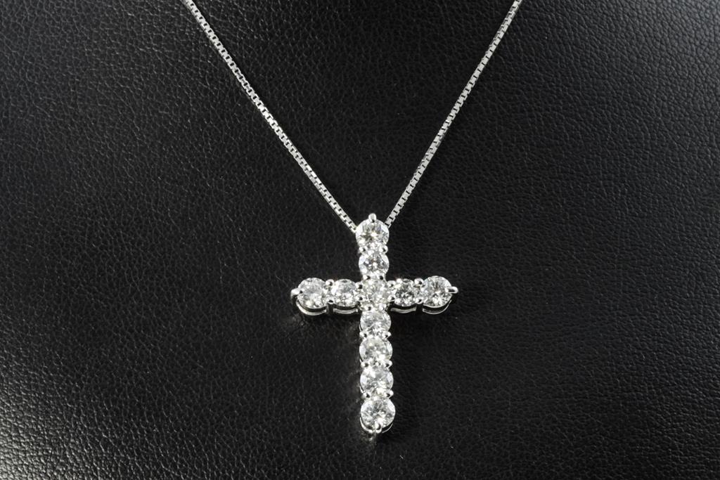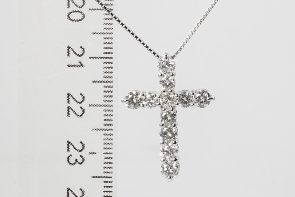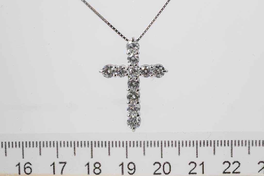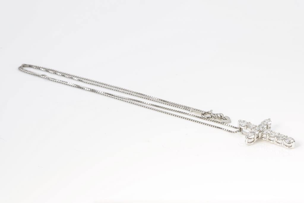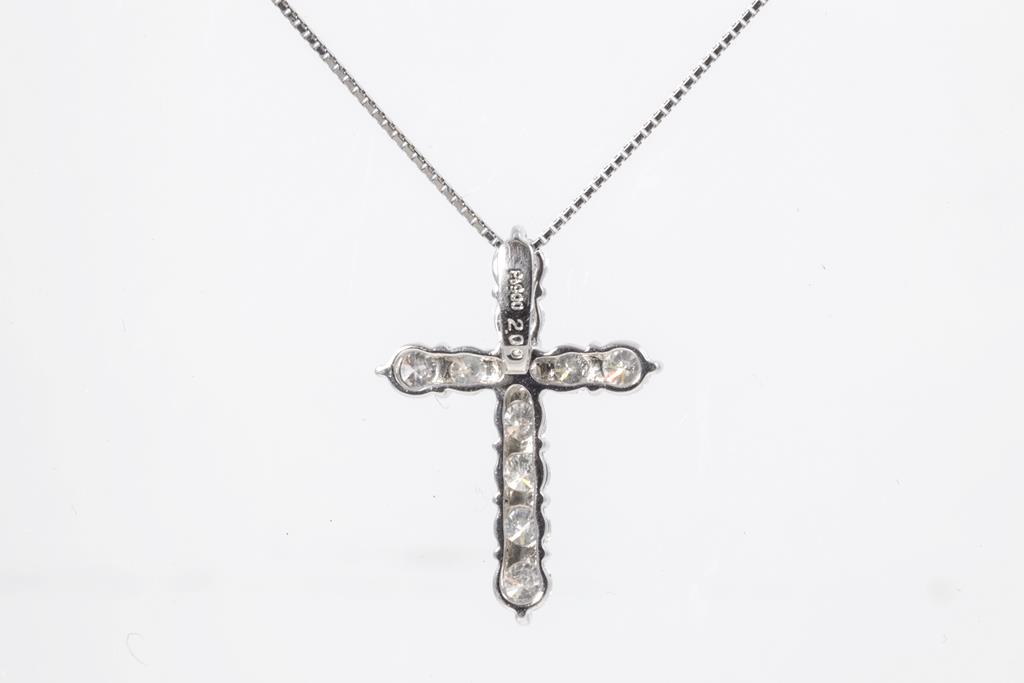 Diamond cross pendant with round Diamonds totalling 2.00cts (Estimated grading: G-H P1). Platinum with 45cm adjustable chain. Weight: 6.5g. (Pre-owned)