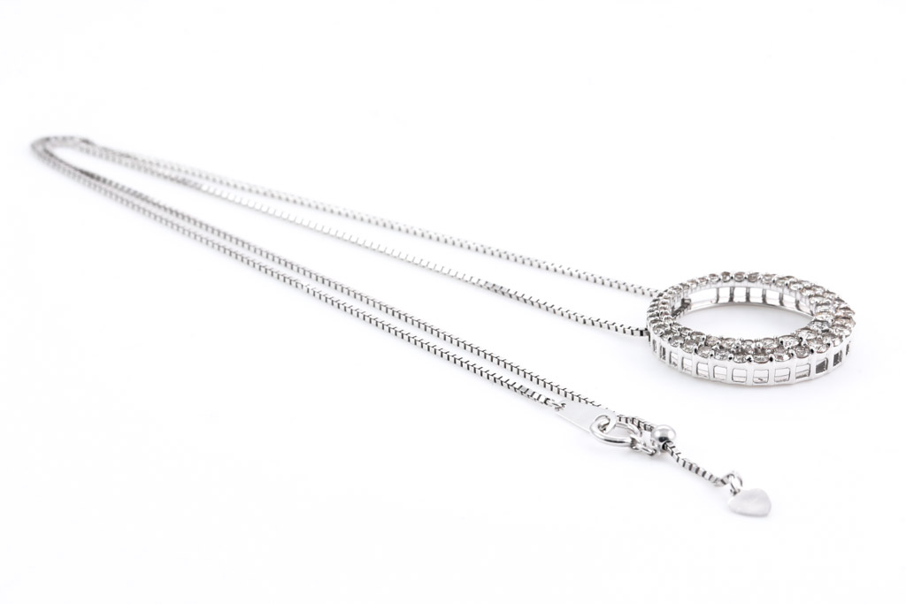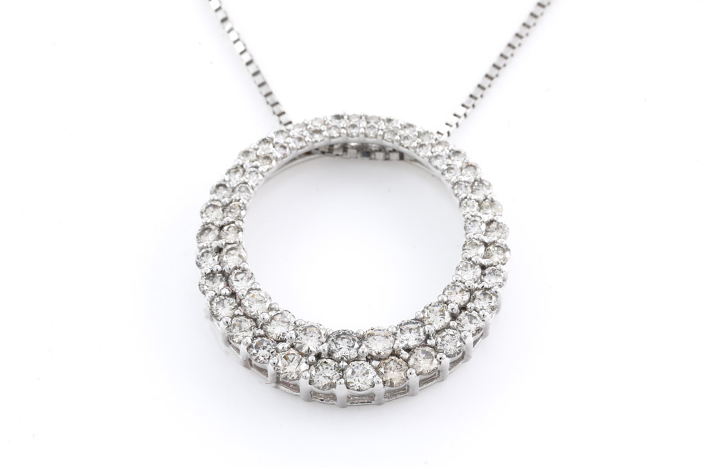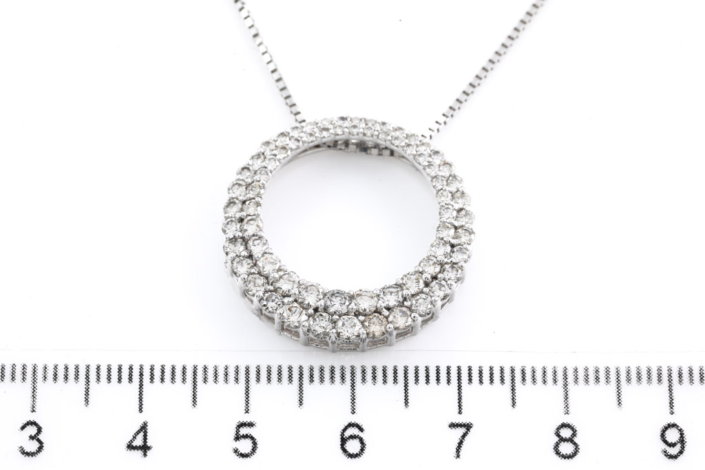 Diamond pendant with round Diamonds totalling 2.00cts (Estimated grading: J-K SI-P1). 18ct white gold with 44cm 18ct white gold adjustable chain. Weight: 8.2g. (Pre-owned)