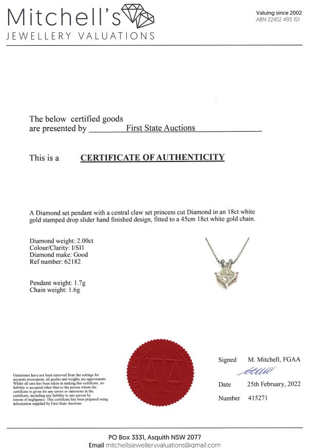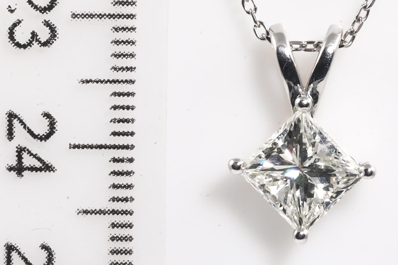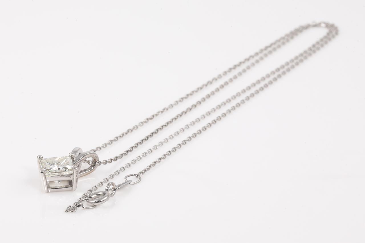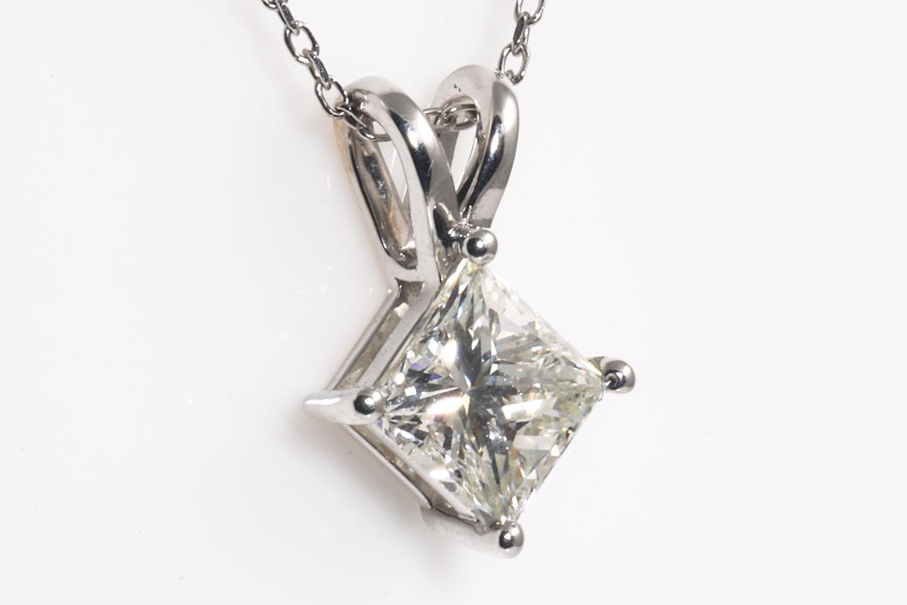 Diamond solitaire pendant with princess cut Diamond of 2.00ct (Estimated grading I SI1). 18ct white gold with 45cm chain. Weight 3.3g. With Certificate #415271. (As New)
