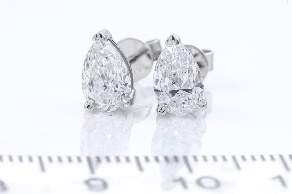Diamond stud earrings with 2 Pear shape Diamonds totalling 2.00cts (both with GIA report both graded as D SI1# 6422903000, 5423675458). 18ct white gold. Weight: 2.7g (New)