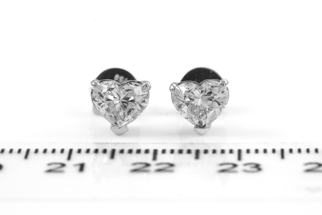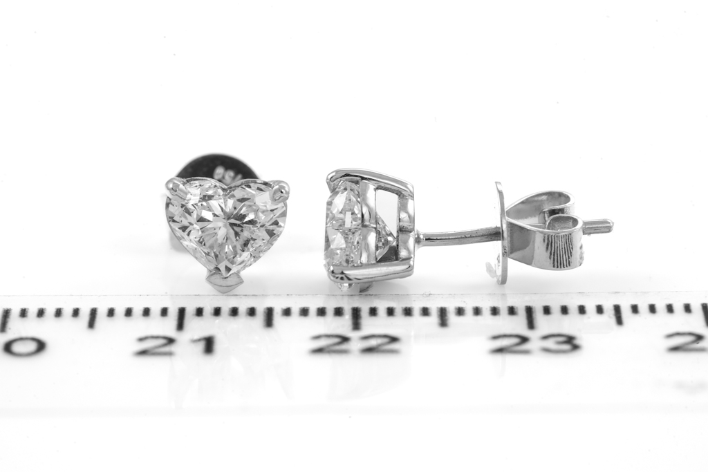 Diamond stud earrings with 2 heart shape Diamonds totalling 2.00cts (both with GIA reports graded as E SI2 & F SI2 #1226504492, 2221373552). 18ct white gold. Weight 2.6g. (New)