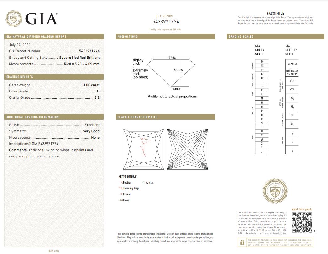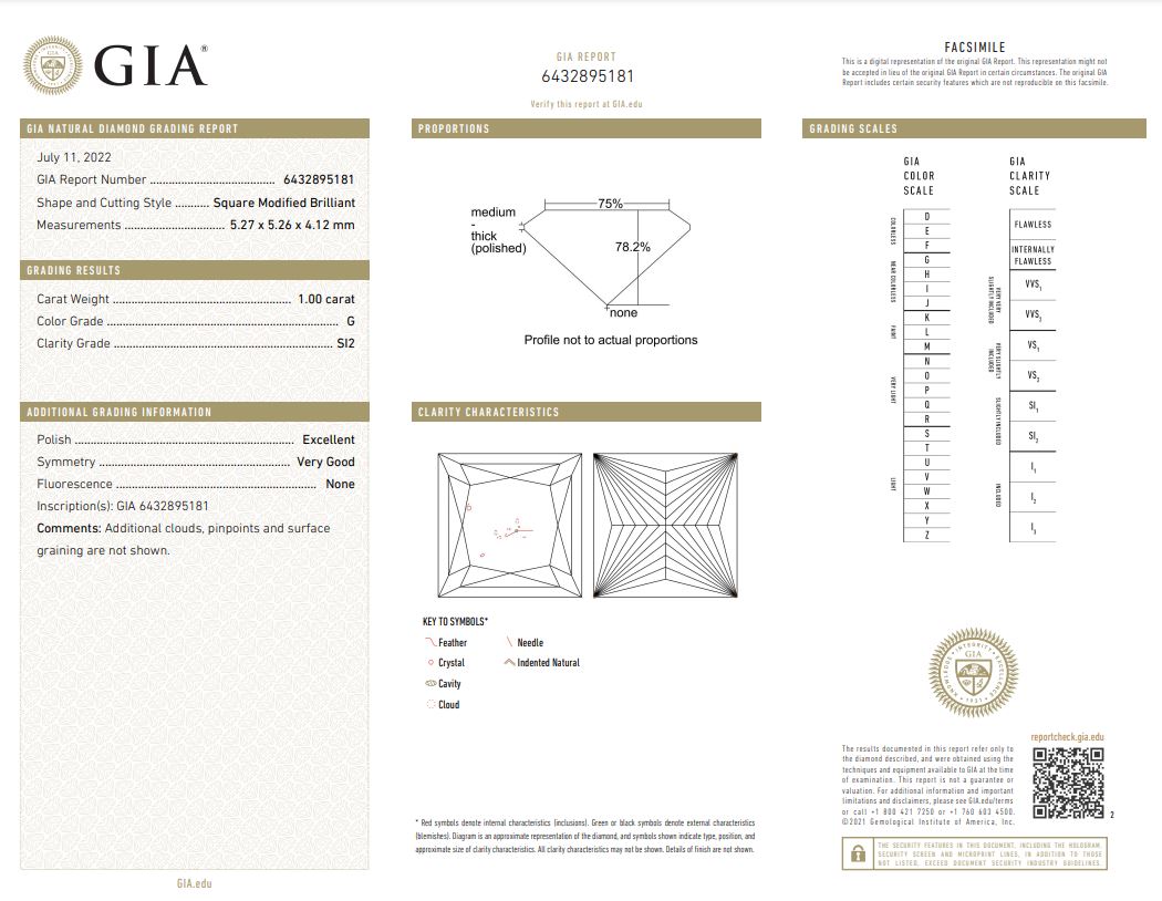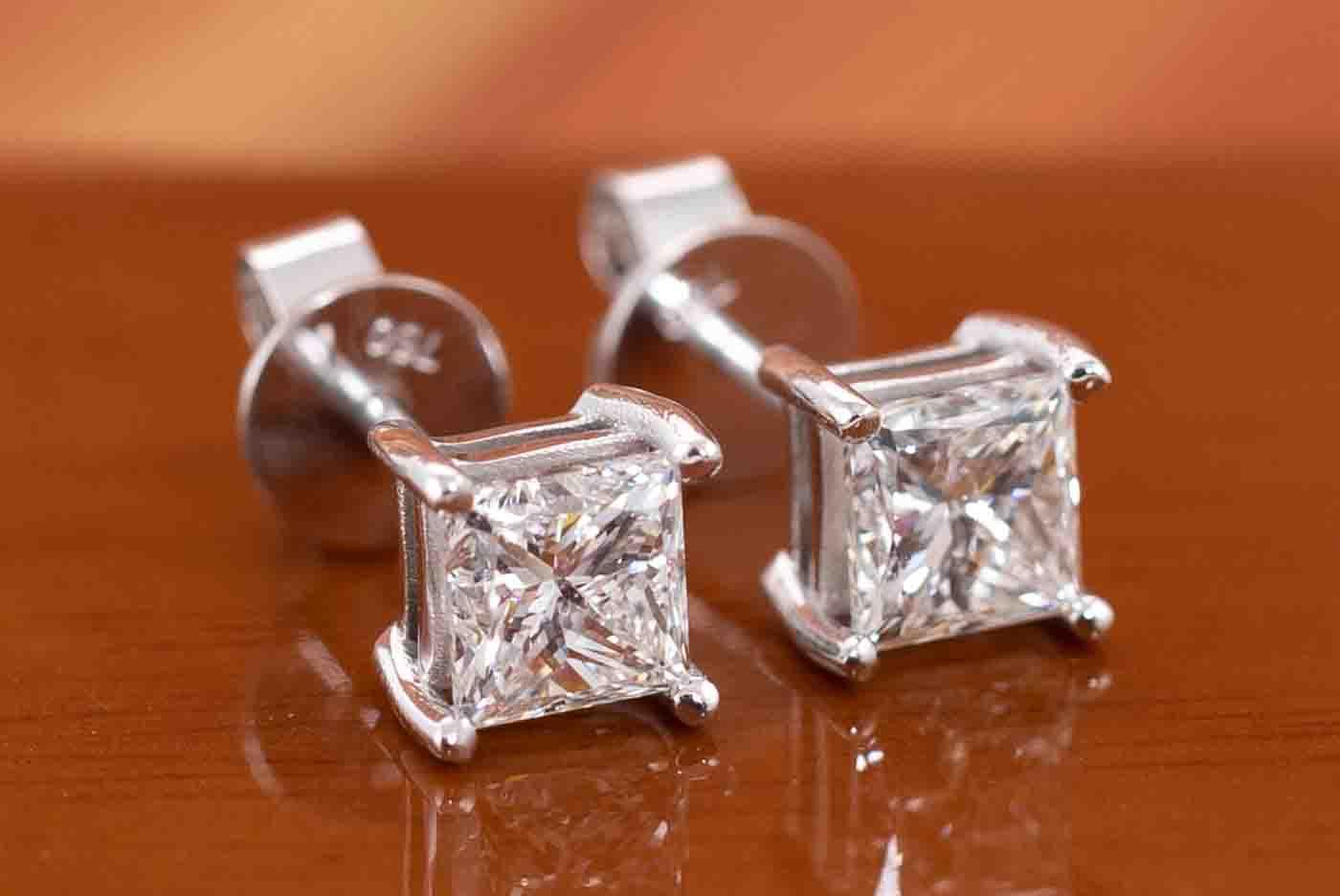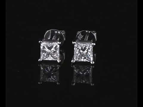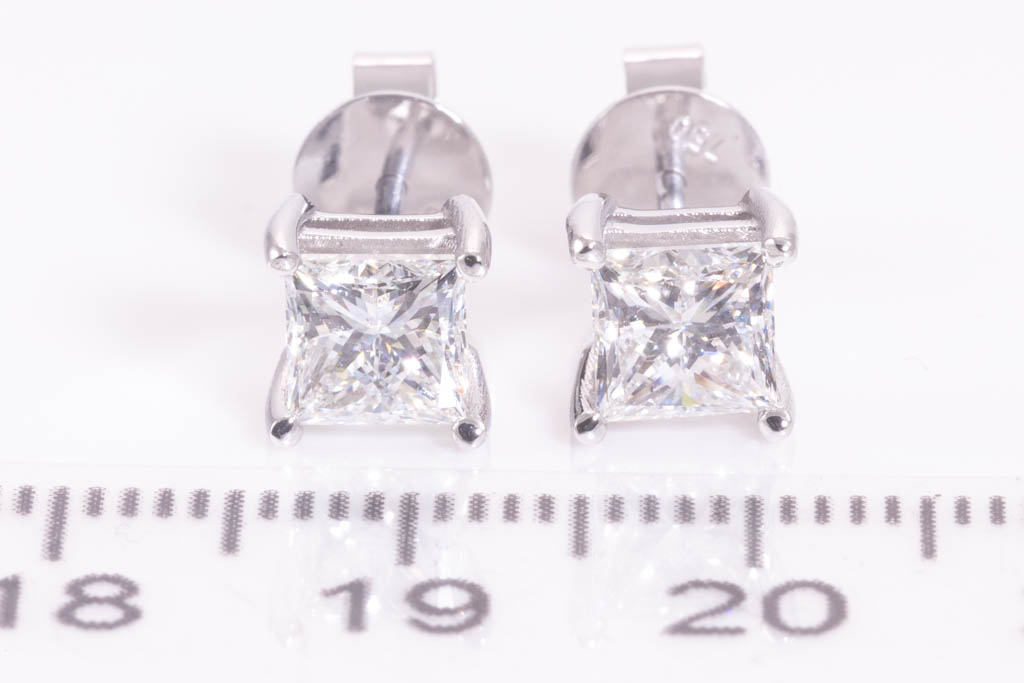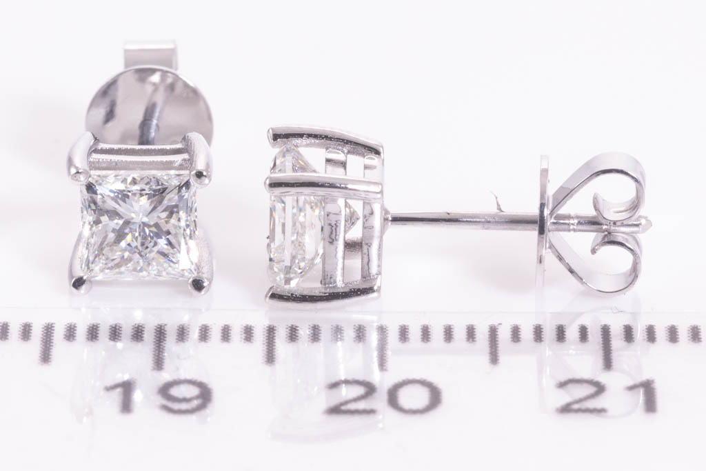 Diamond stud earrings with 2 princess cut Diamonds totalling 2.00cts (both with GIA reports graded as G SI2 and H SI2 #6432895181, 5433971774). 18ct white gold. Weight: 2.8g. (New)