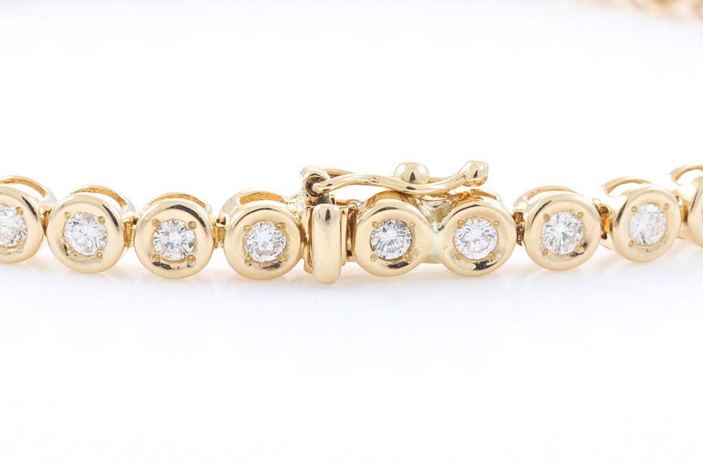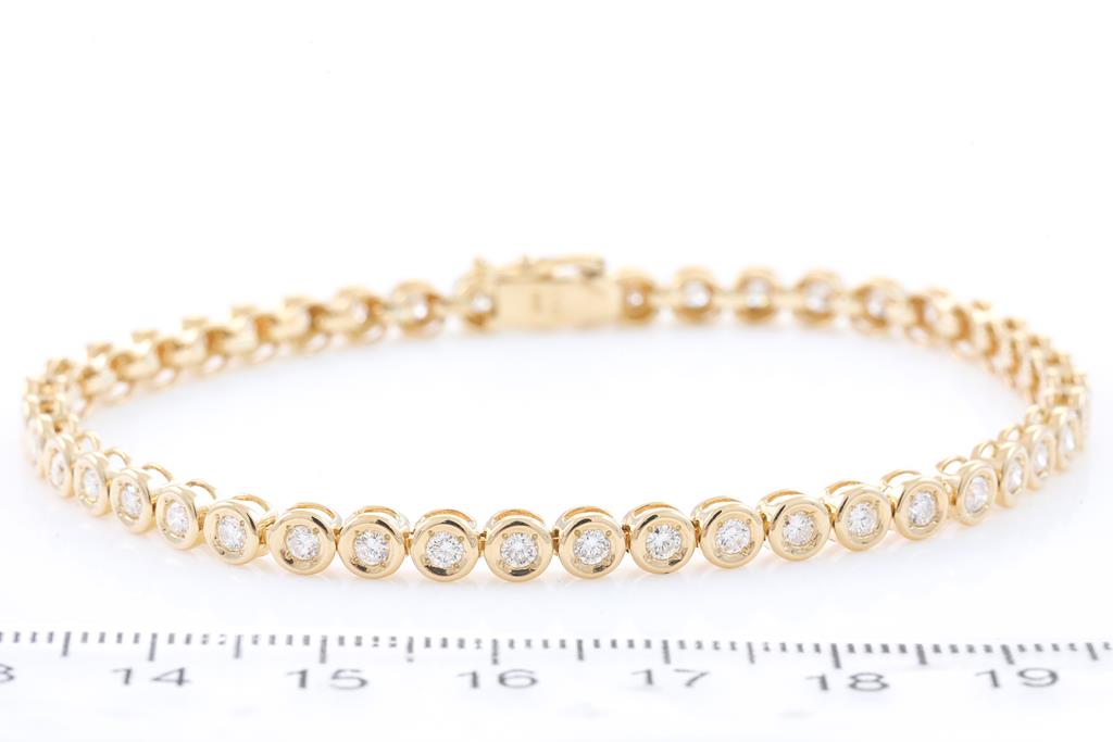 Diamond Tennis bracelet with 44 round Diamonds totalling 2.00cts (Estimated grading: H P1). 18ct yellow gold. Length 18cm. Weight: 11.9g. (Pre-owned)
