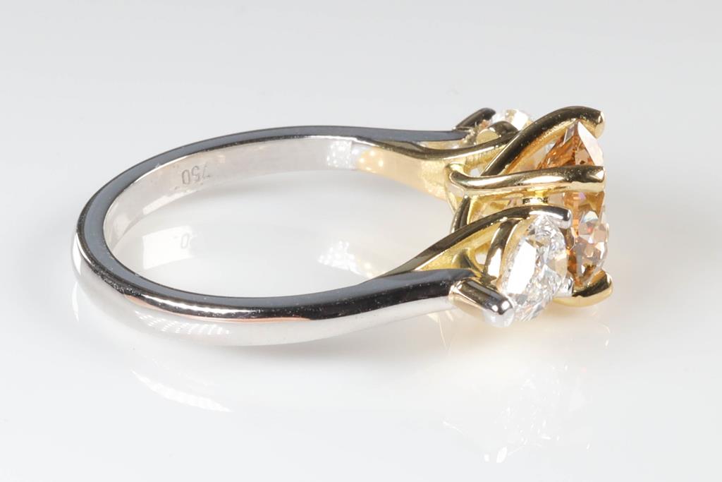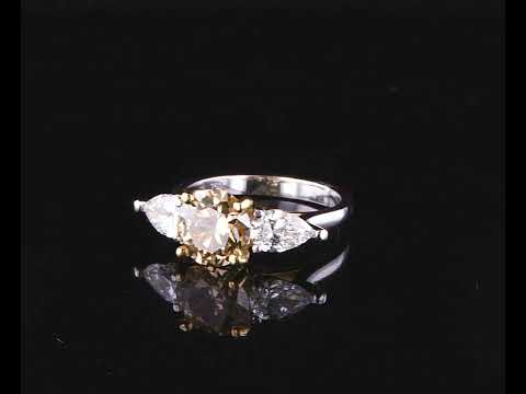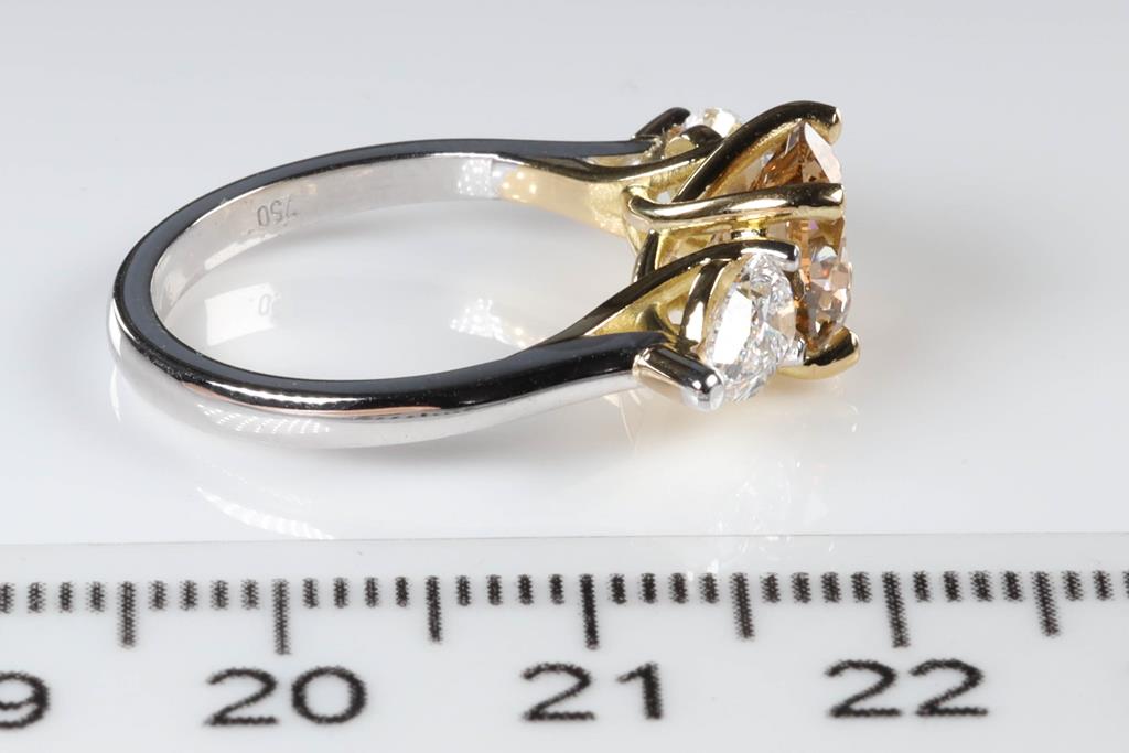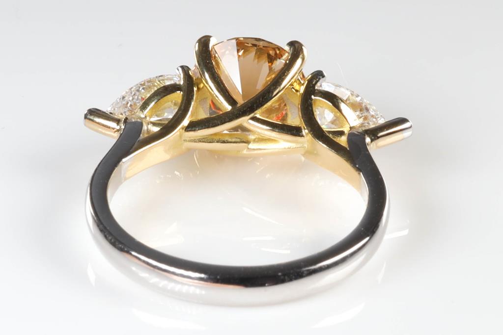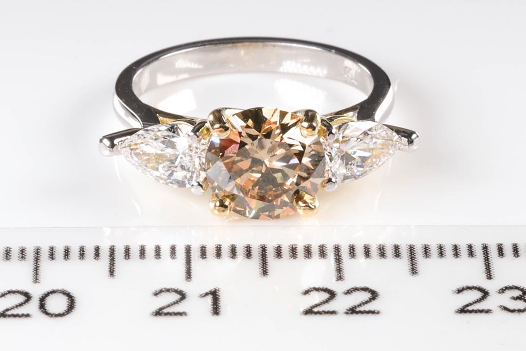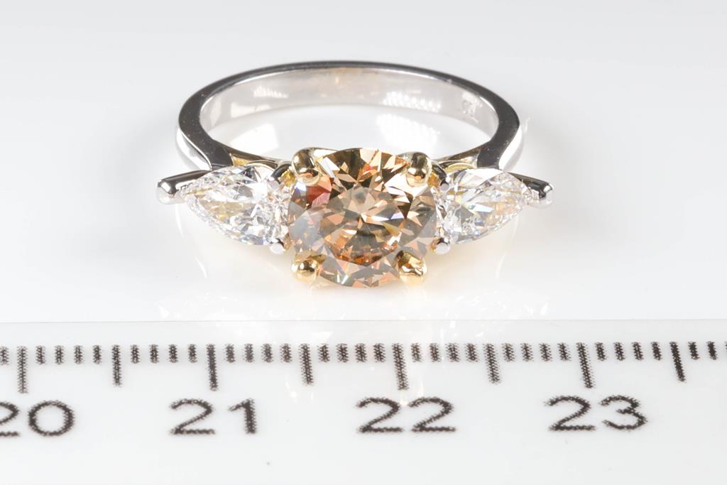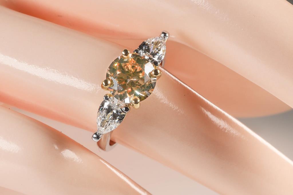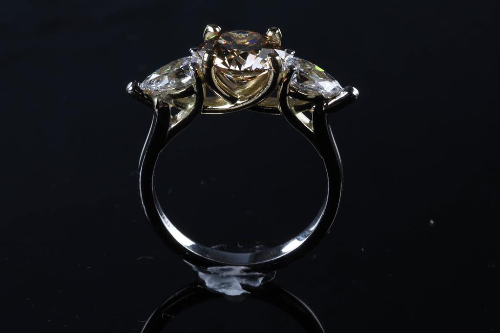Diamond Ring with centre round brilliant cut Diamond of 2.00ct (with GIA report graded as Natural Fancy Brown-Yellow Even VS2 #6392373874) and 2 pear shape Diamonds totalling 1.01cts (with GIA summary reports graded as D VS2 #3405993551, 6224081473). 18ct yellow and white gold. Ring size: L. Ring resizing is not recommened. Weight: 5.0g. (New).