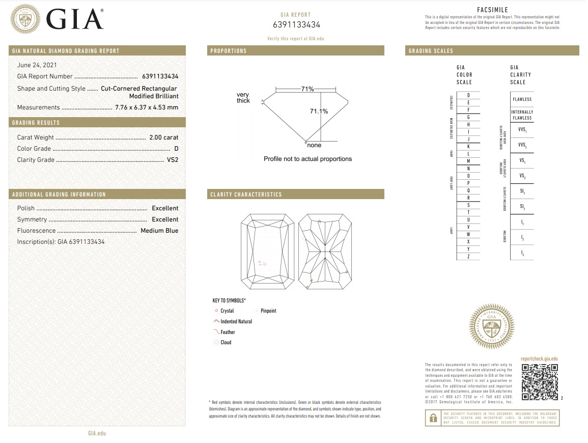 A loose radiant cut (cut-cornered rectangular modified brilliant) Diamond of 2.00ct (With GIA report graded as D VS2 #6391133434). (New)