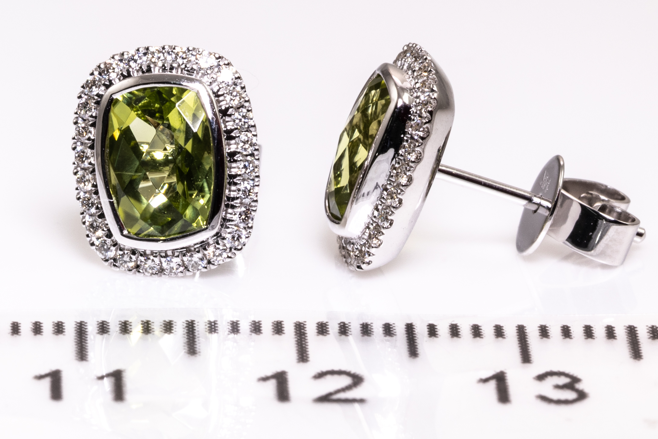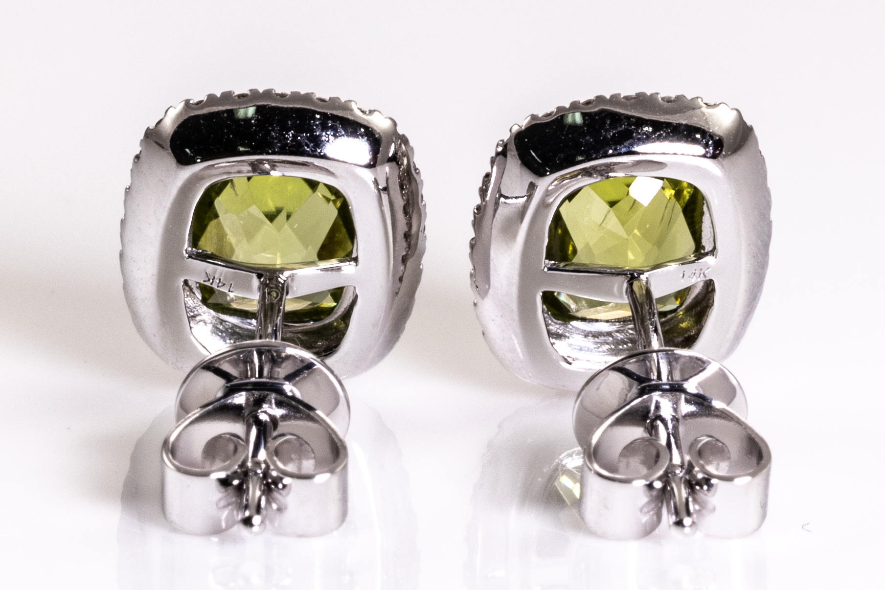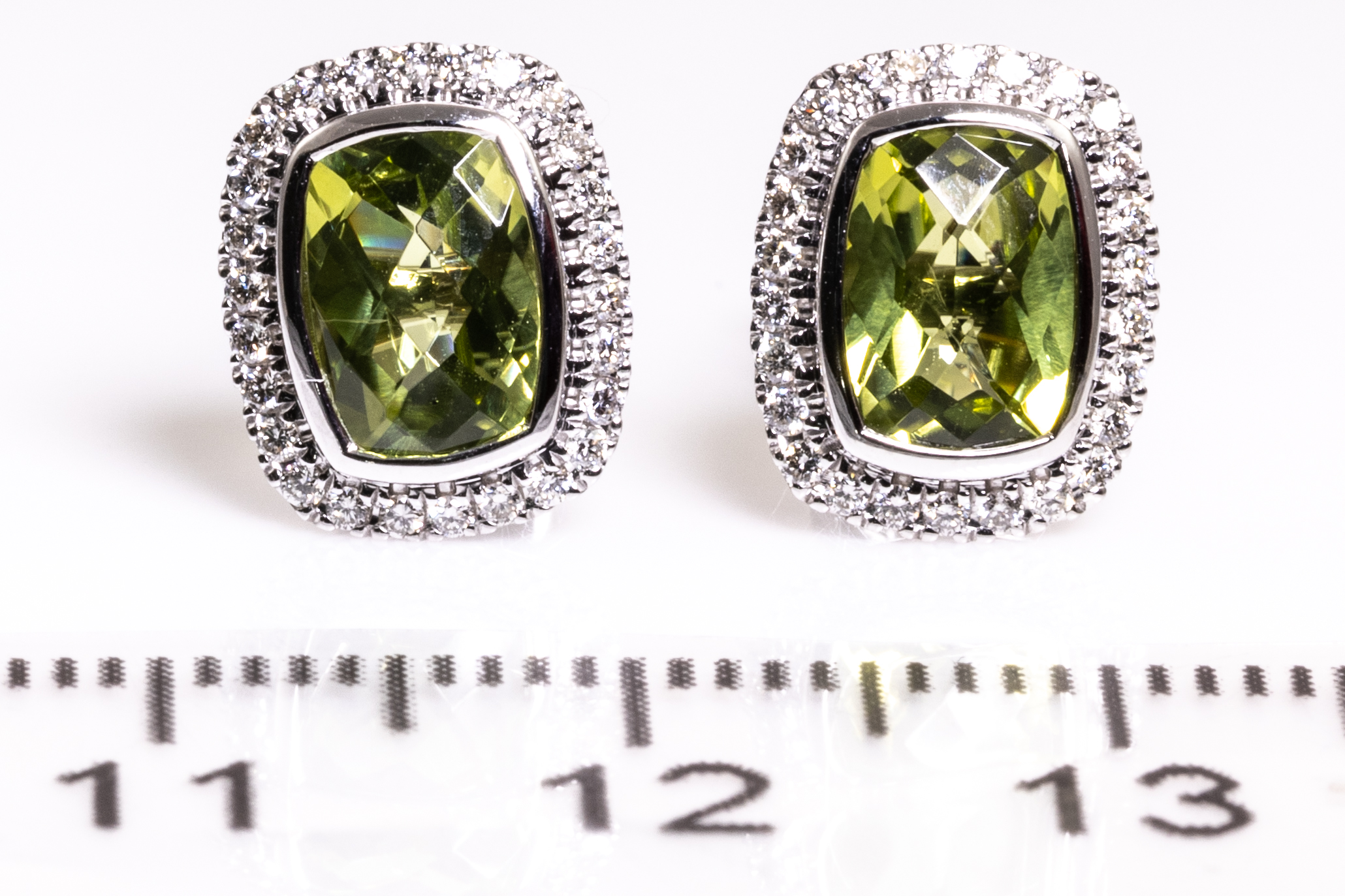 Peridot and Diamond earrings with cushion cut Peridot and round Diamonds totalling 0.21cts. 14ct white gold. Weight: 2.8g. (New)