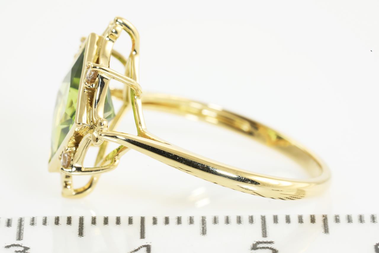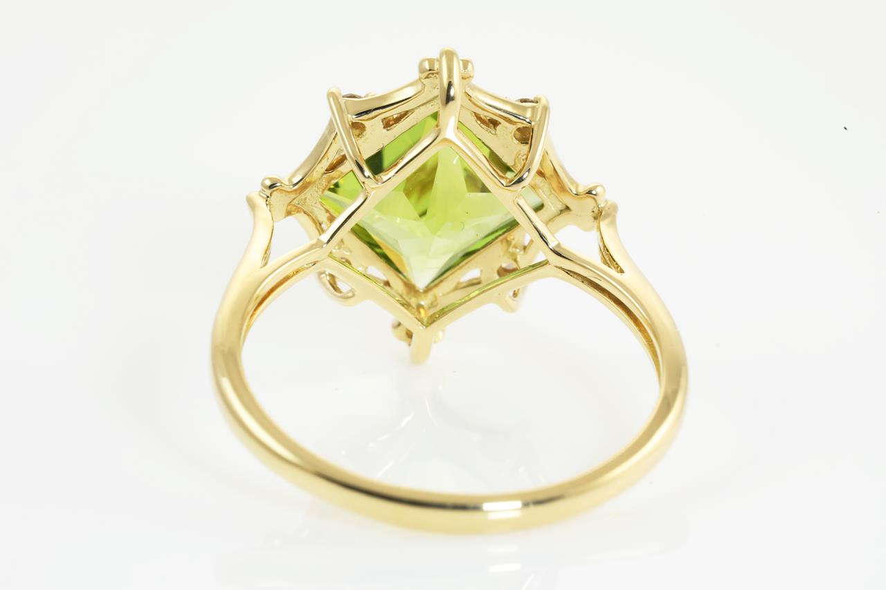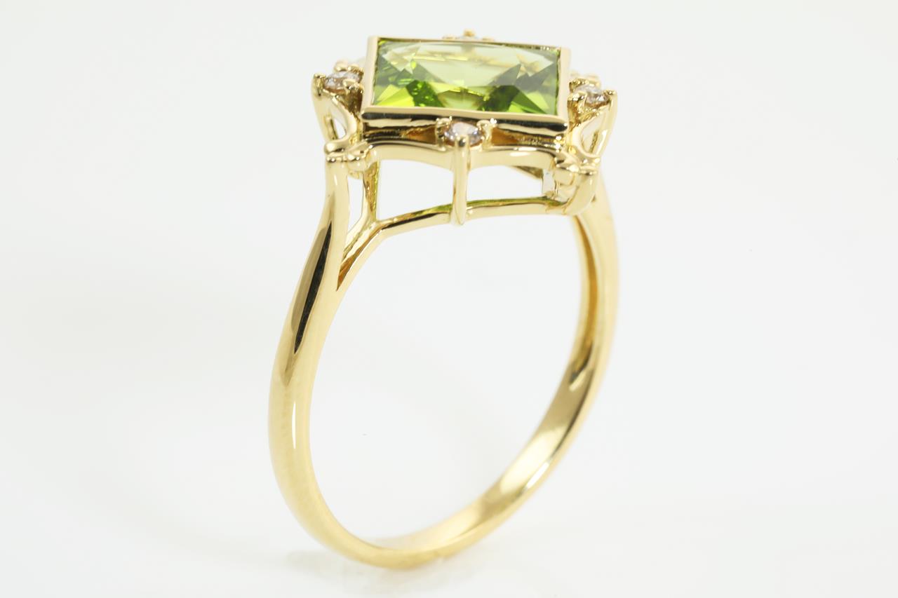 Peridot and Diamond ring with princess cut Peridot of 2.00ct and Diamonds totalling 0.07cts. 18ct yellow gold. Ring size O. Weight: 3.5g (Pre-owned)