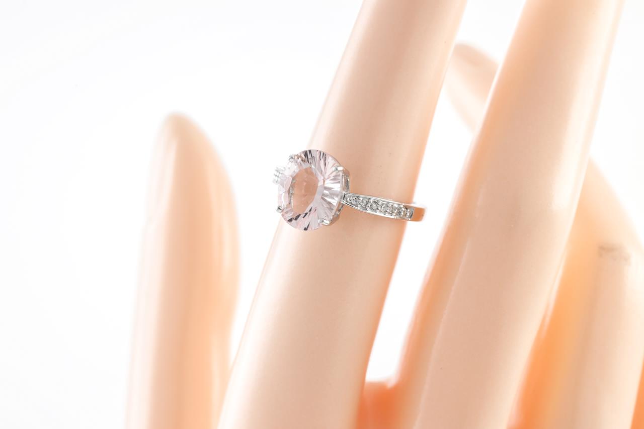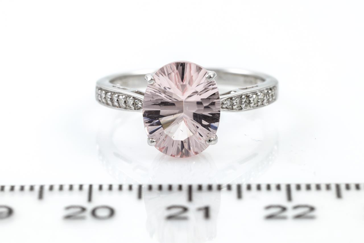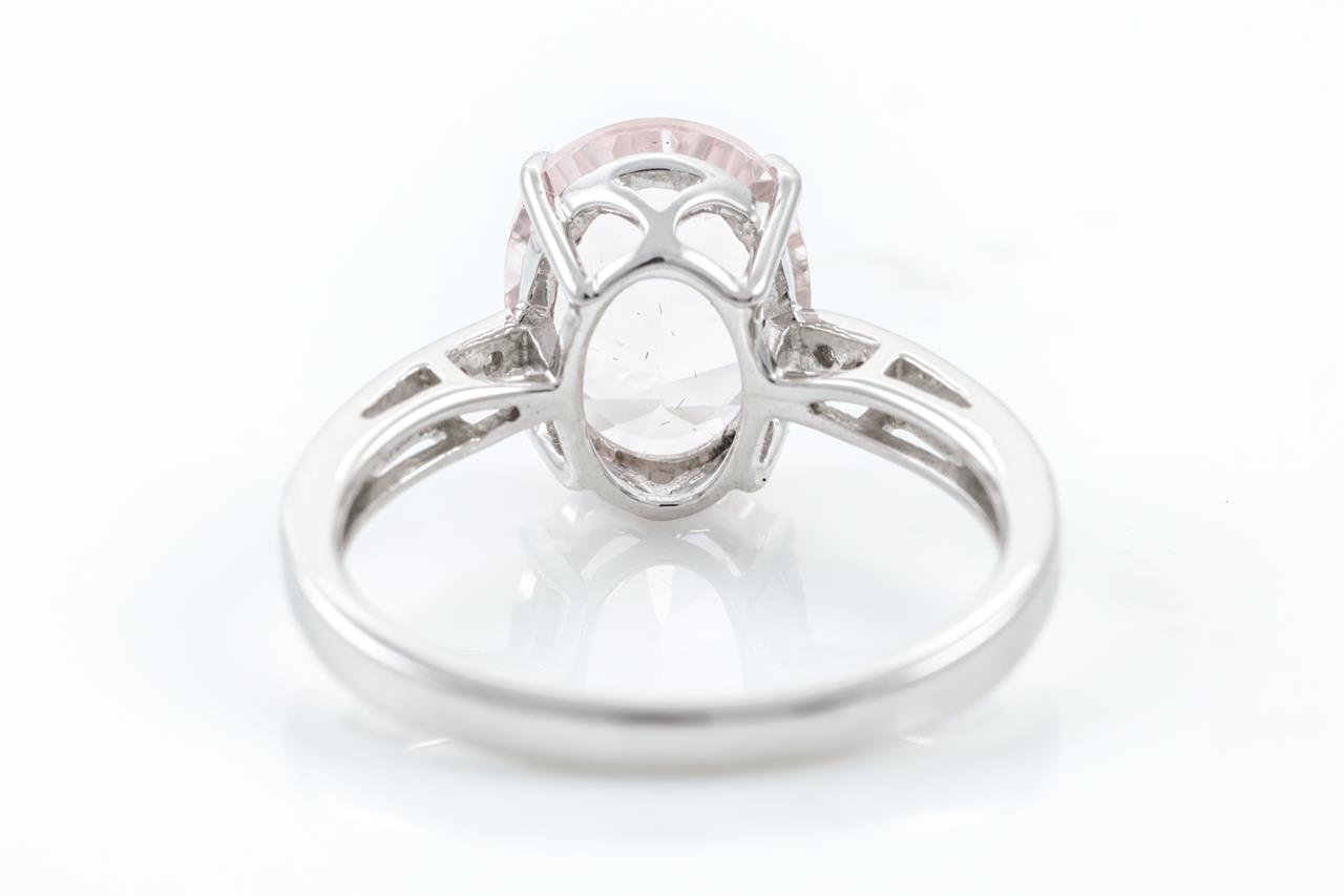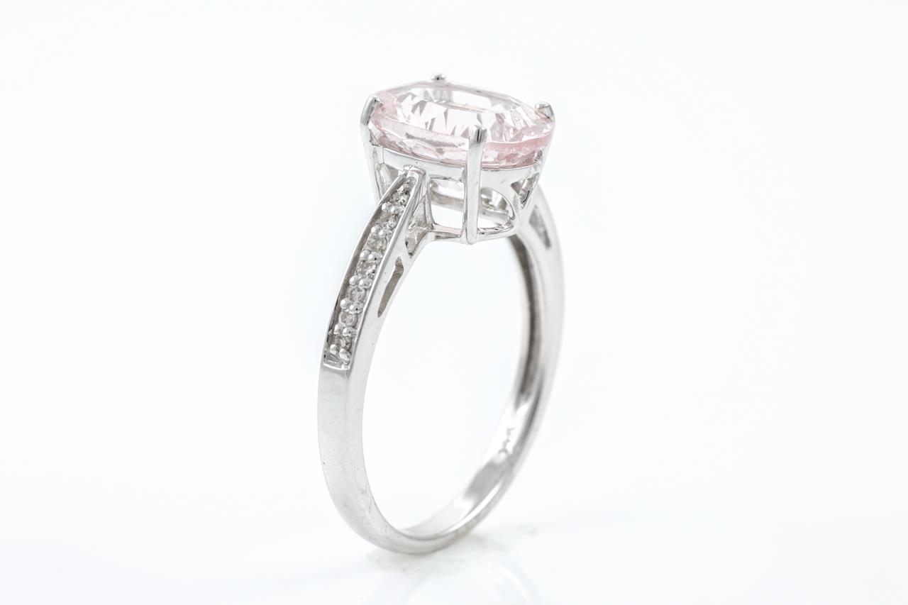 Quartz and Diamond ring with an oval light pink Quartz of approximately 2.00ct and Diamonds totalling approximately 0.07cts. 14ct white gold. Ring size L. Weight: 2.8g. (As new)