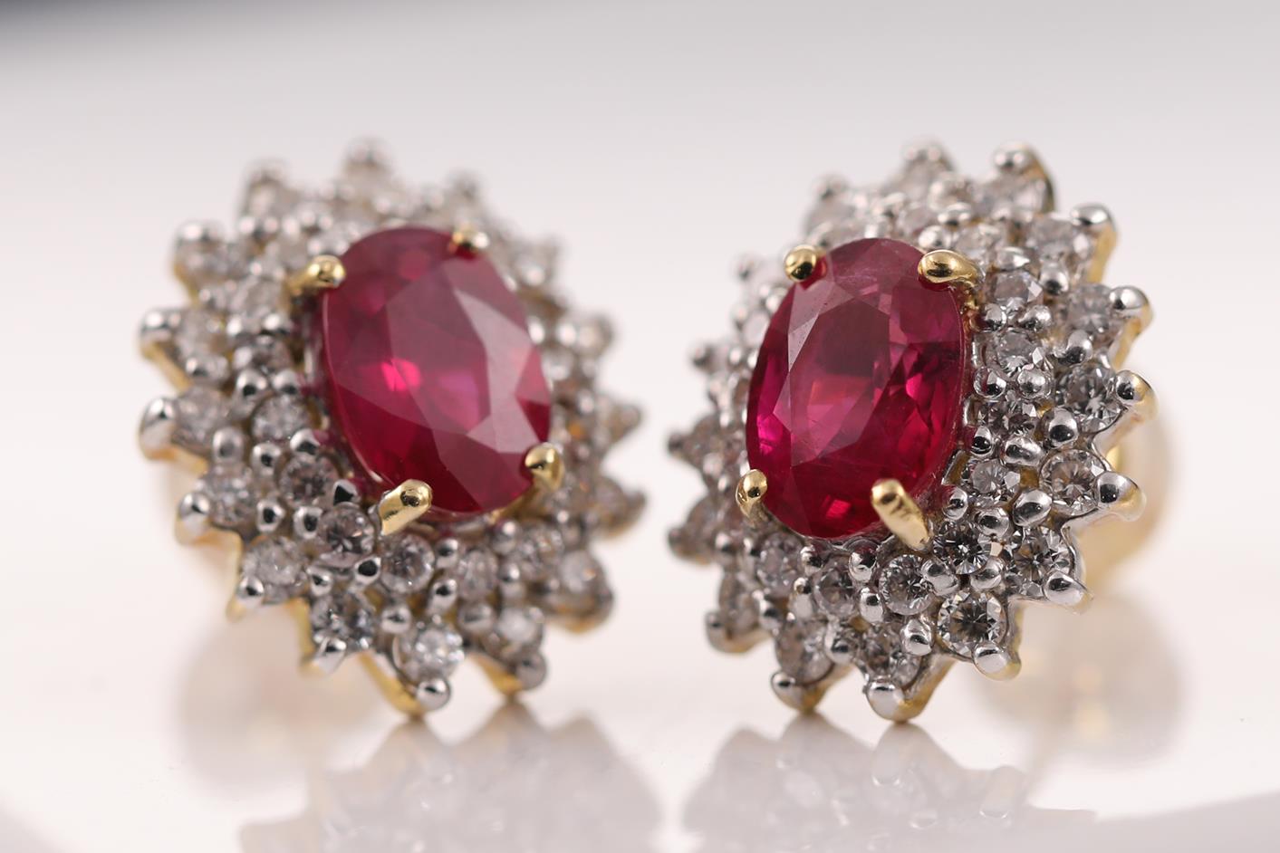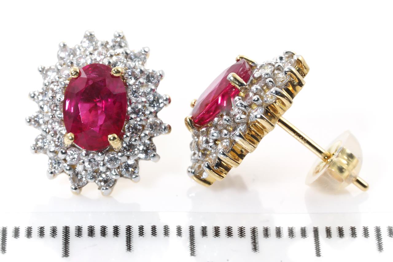 Ruby and Diamond earrings with centre oval shape Rubies totalling approximately 2.00cts and surrounding Diamonds totalling 0.66cts (Estimated grading: G SI). 18ct yellow gold with gold & silicon backs. Weight: 5g. (Pre-owned)