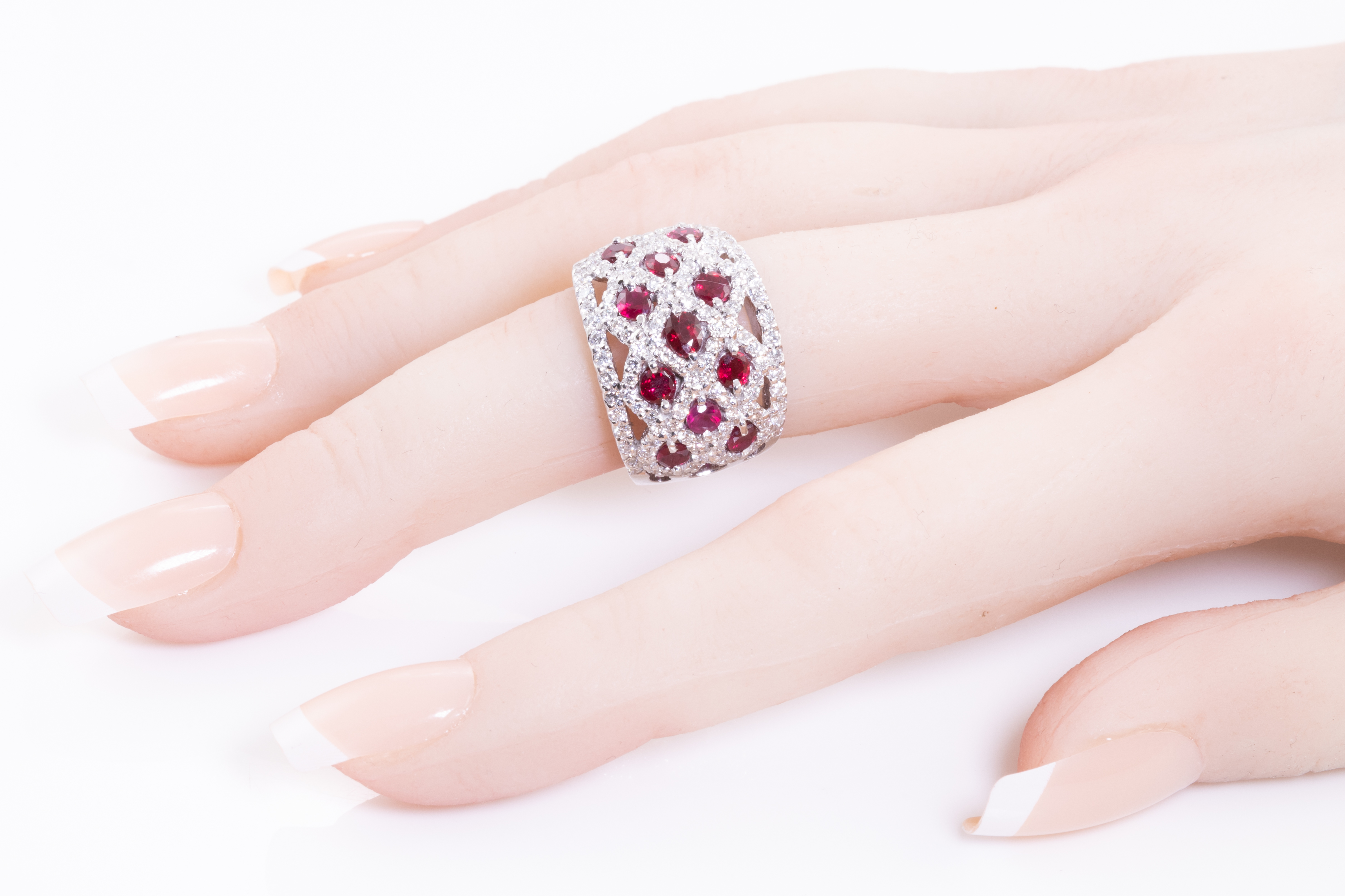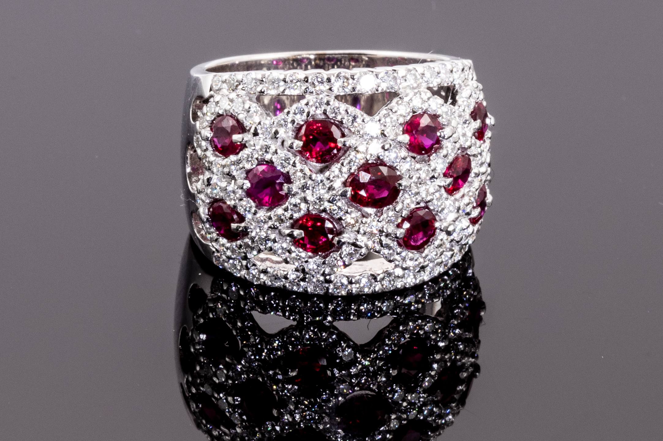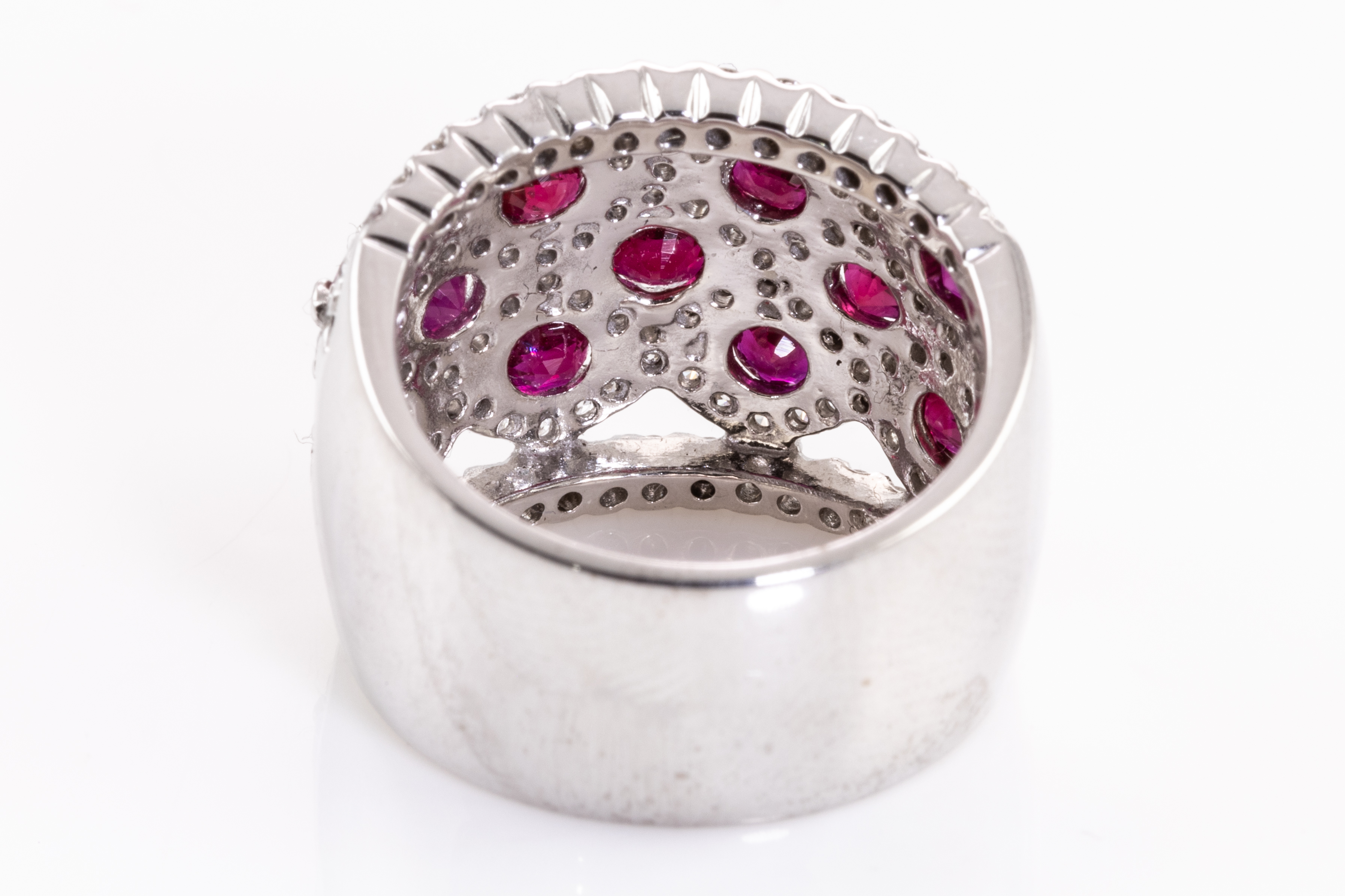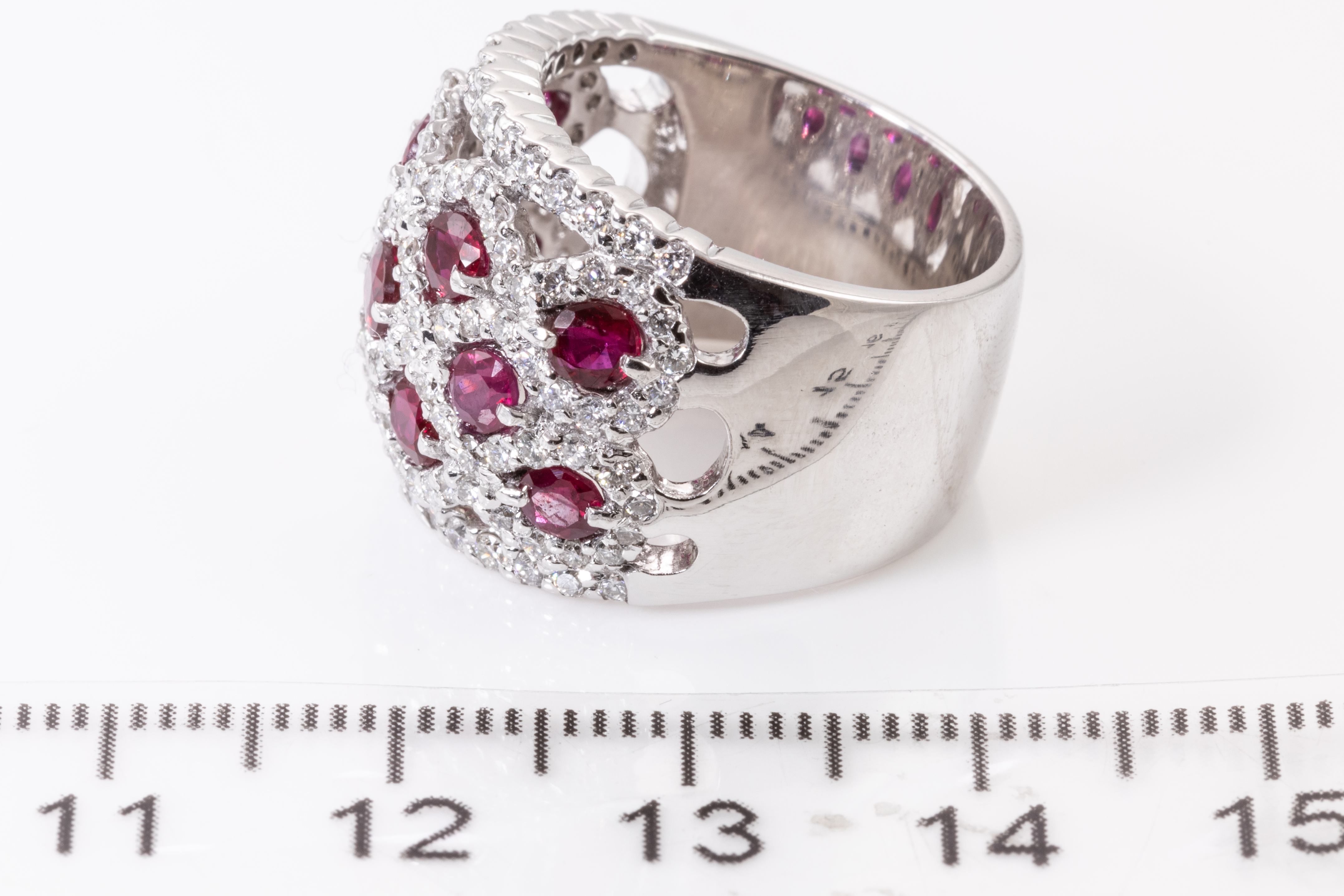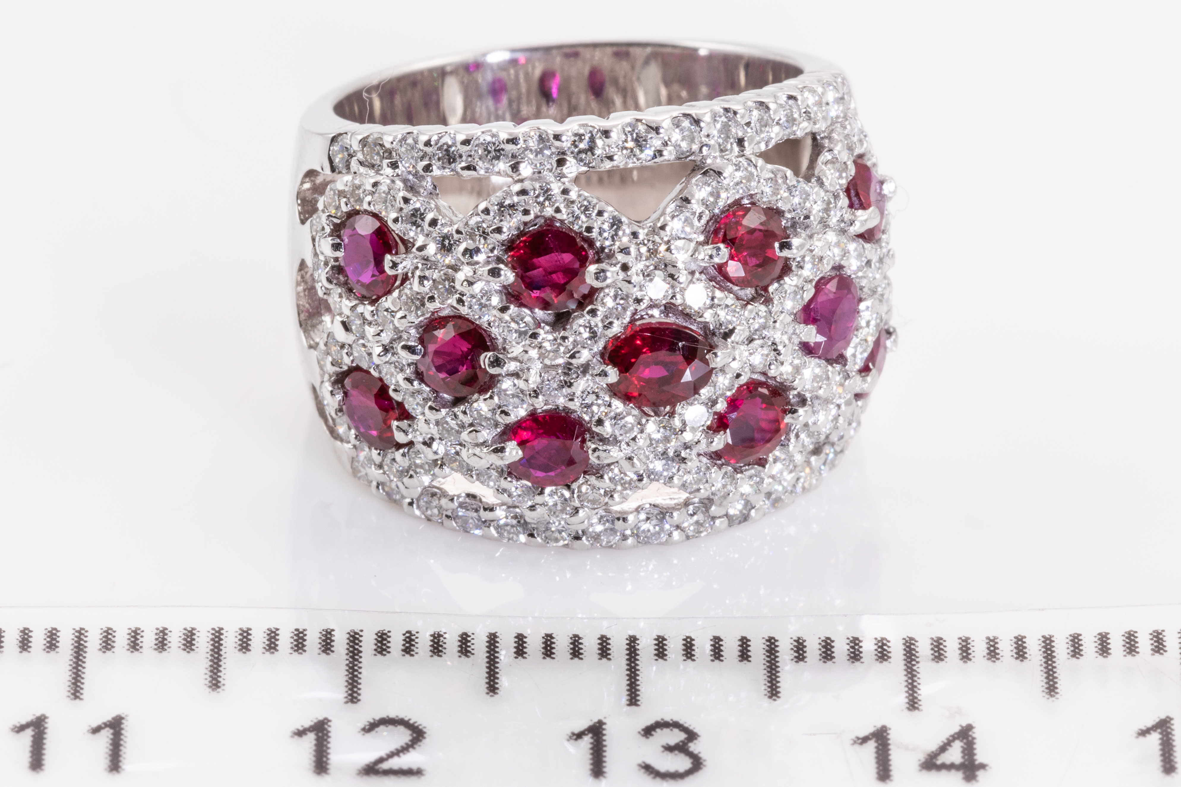 Ruby and Diamond ring with round Rubies totalling 2.00cts and round Diamonds totalling 1.36cts (Estimated grading: H-I SI-P1). 18ct white gold. Ring size L1/2 - ring resizing is not recommended. Weight: 16.3g. With certificate #415876. (Pre-owned)