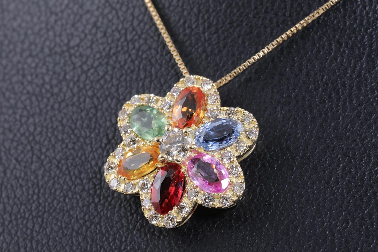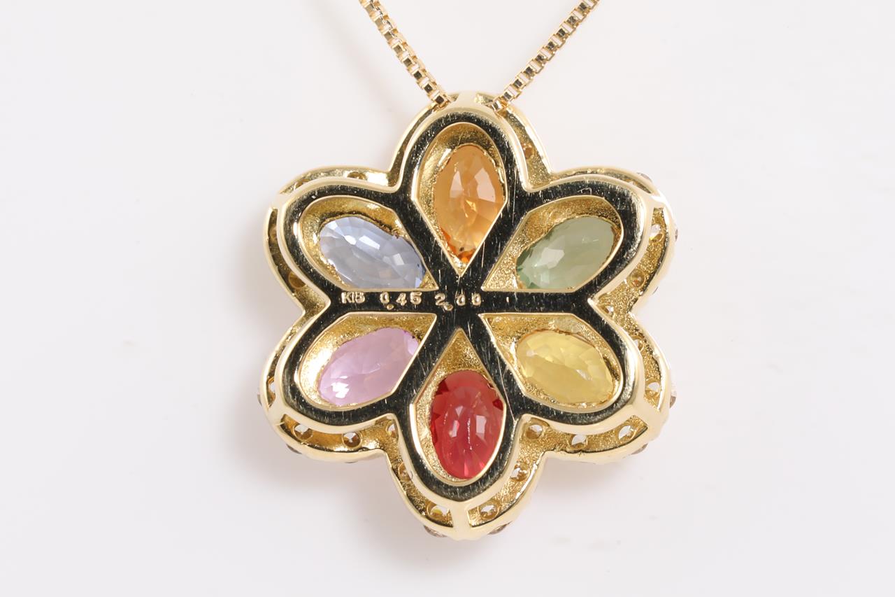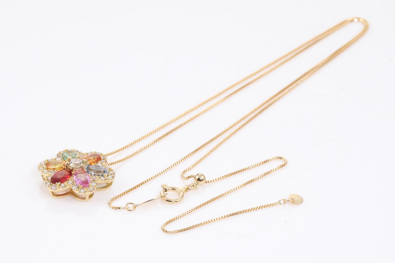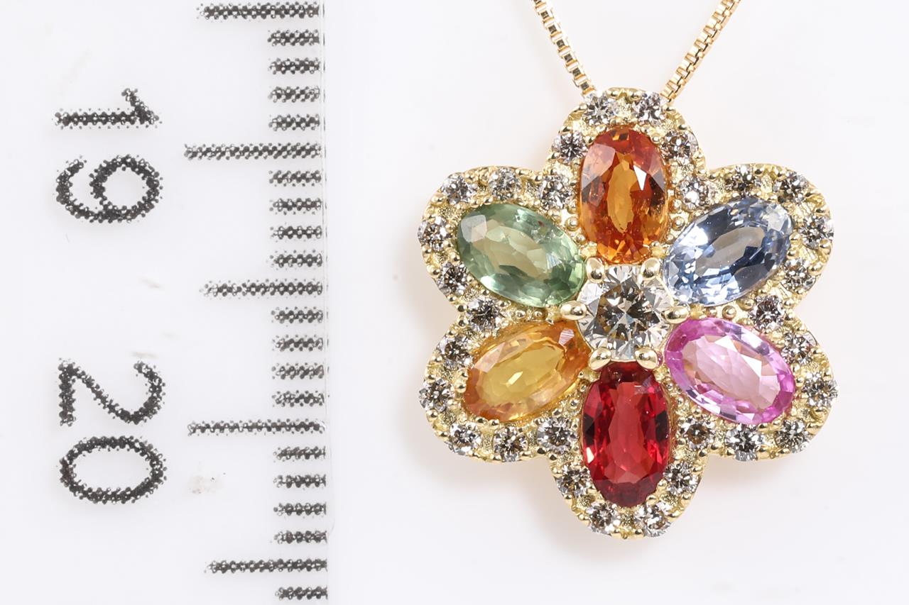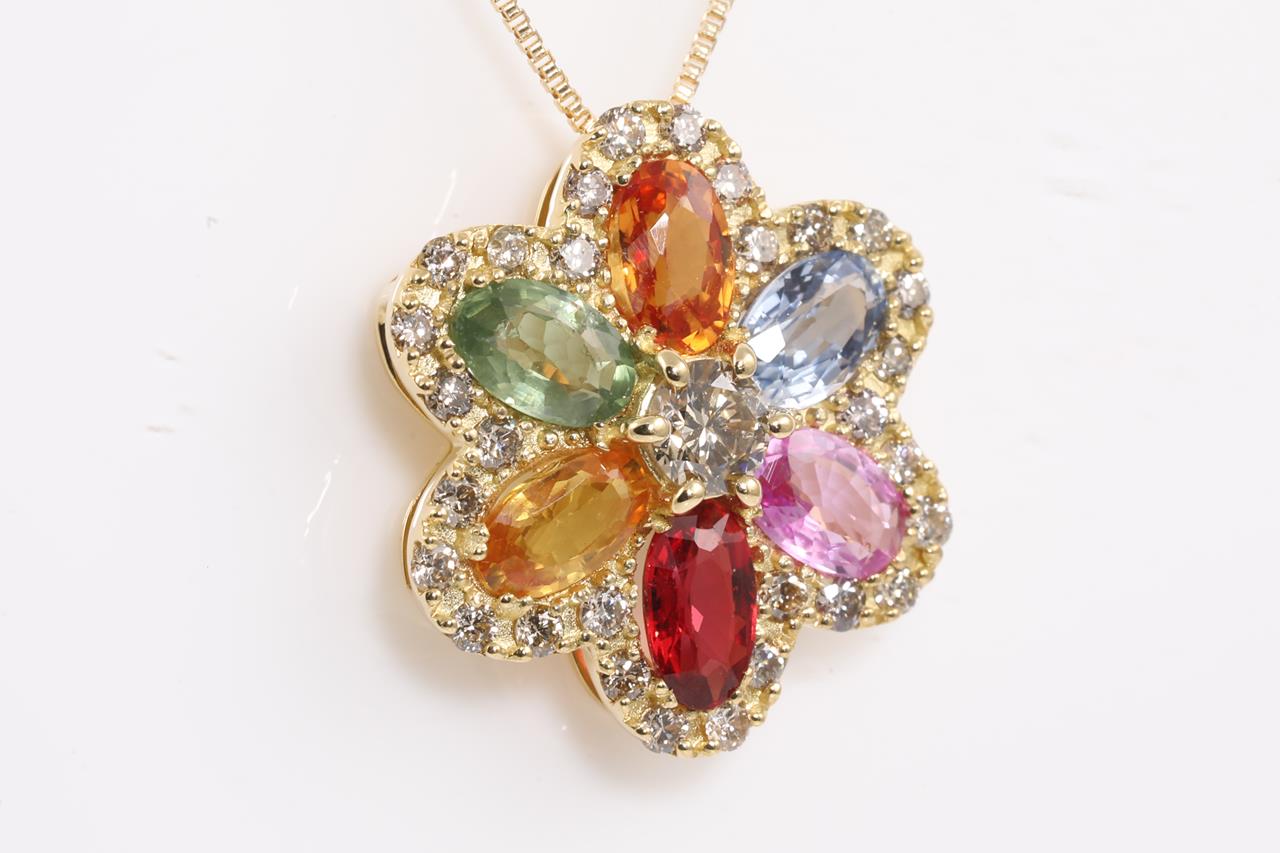 Sapphire and Diamond pendant with multi-colour oval shape Sapphires totalling 2.00cts and round Diamonds totalling 0.45cts (Estimated grading: H SI). 18ct yellow gold with 45cm adjustable chain. Weight: 3.8g. (Pre-owned)