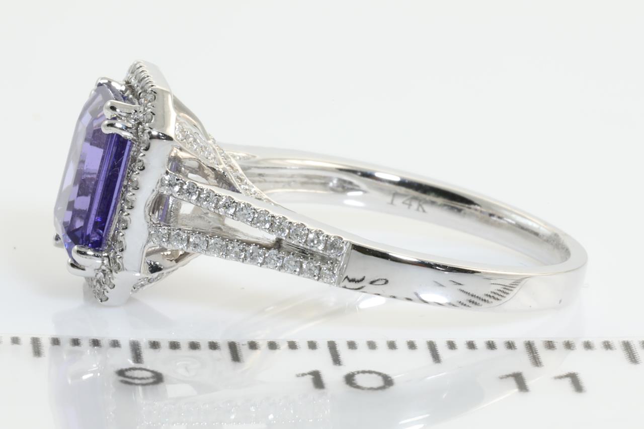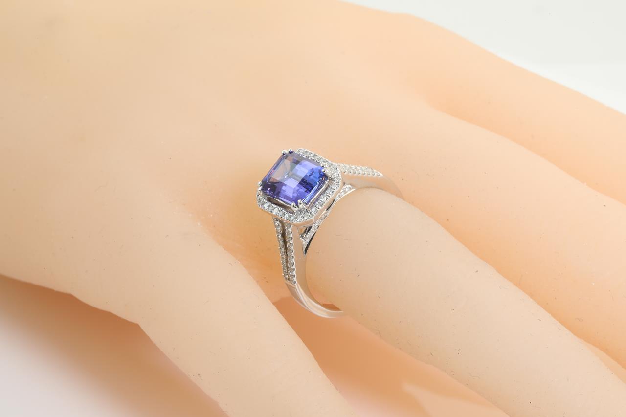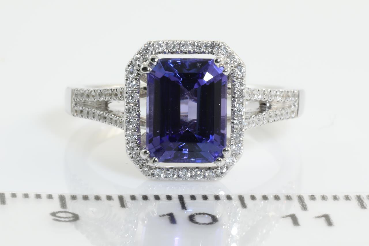 Tanzanite and Diamond ring with a emerald cut Tanzanite of 2.00ct and round Diamonds totalling 0.37cts (Estimated grading: H SI). 14ct white gold. Ring size N - can be resized up by a maximum of 3 sizes or down with ring clip. Weight: 5.4g (New).