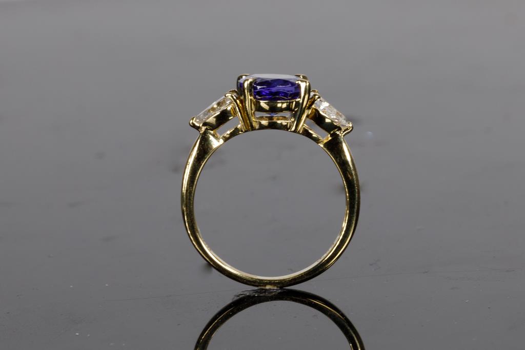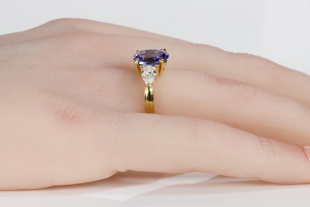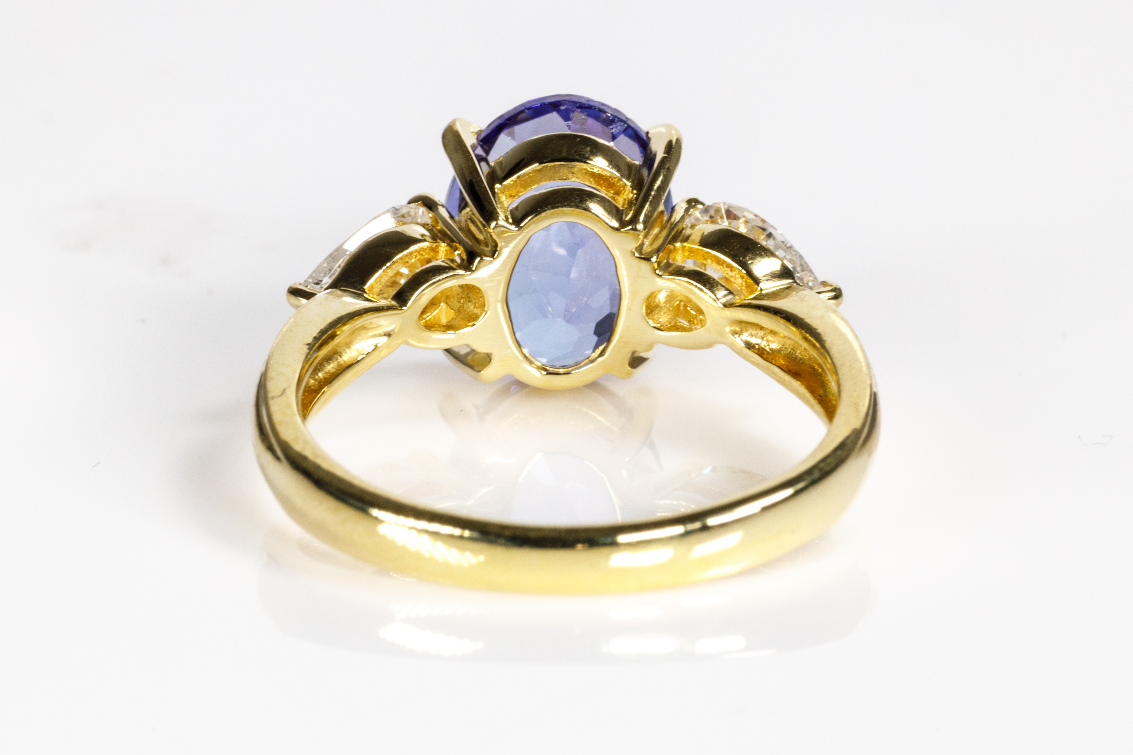 Tanzanite and Diamond ring with an oval shape Tanzanite of approximately 2.00ct and 2 pear shape Diamonds totalling 0.53cts (Estimated grading: H-I P1). 18ct yellow gold. Ring size L1/2. Weight: 4.7g. (Pre-owned)