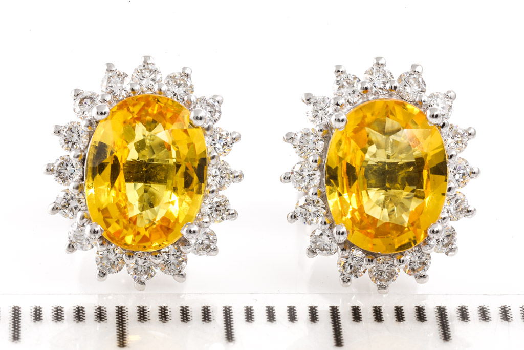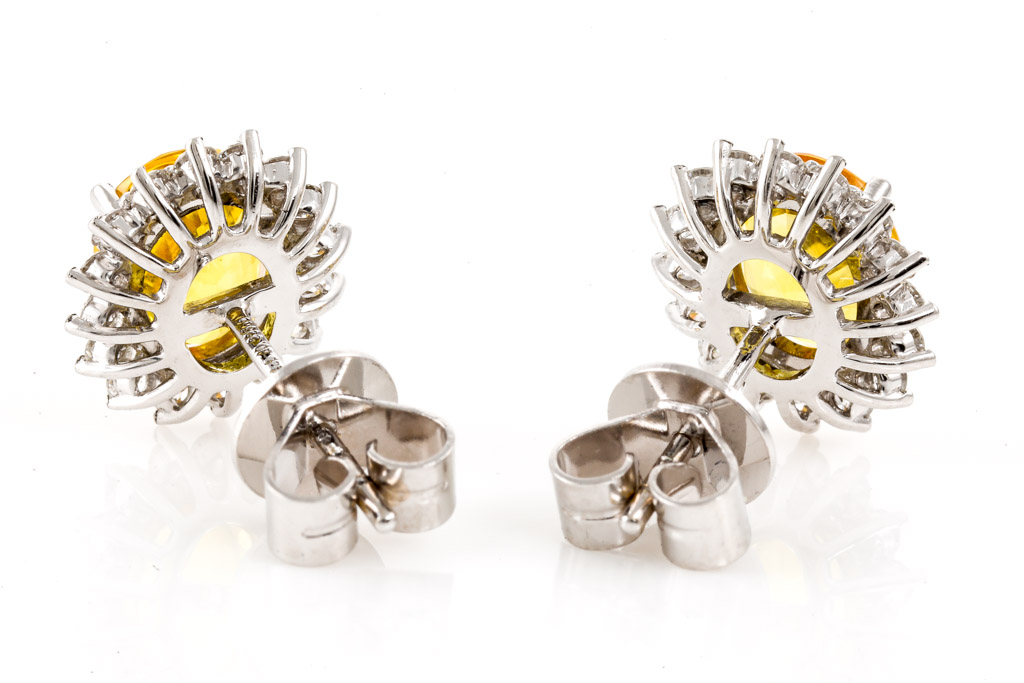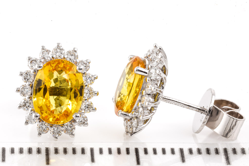 Sapphire and Diamond earrings with 2 oval shape yellow Sapphires totalling 2.00cts and round Diamonds totalling 0.30cts (Estimated grading: G-H SI). 18ct white gold. Weight: 2.8g. (Pre-owned)