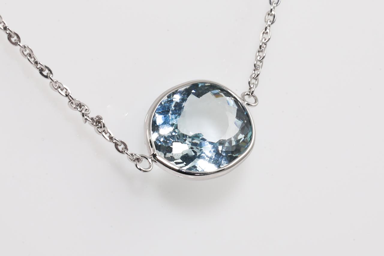 Aquamarine necklace with mixed shape Aquamarine totalling 20.11cts. 18ct white gold. Length: 85cm. Weight: 8.4g. With certificate #415350. (Pre-owned)