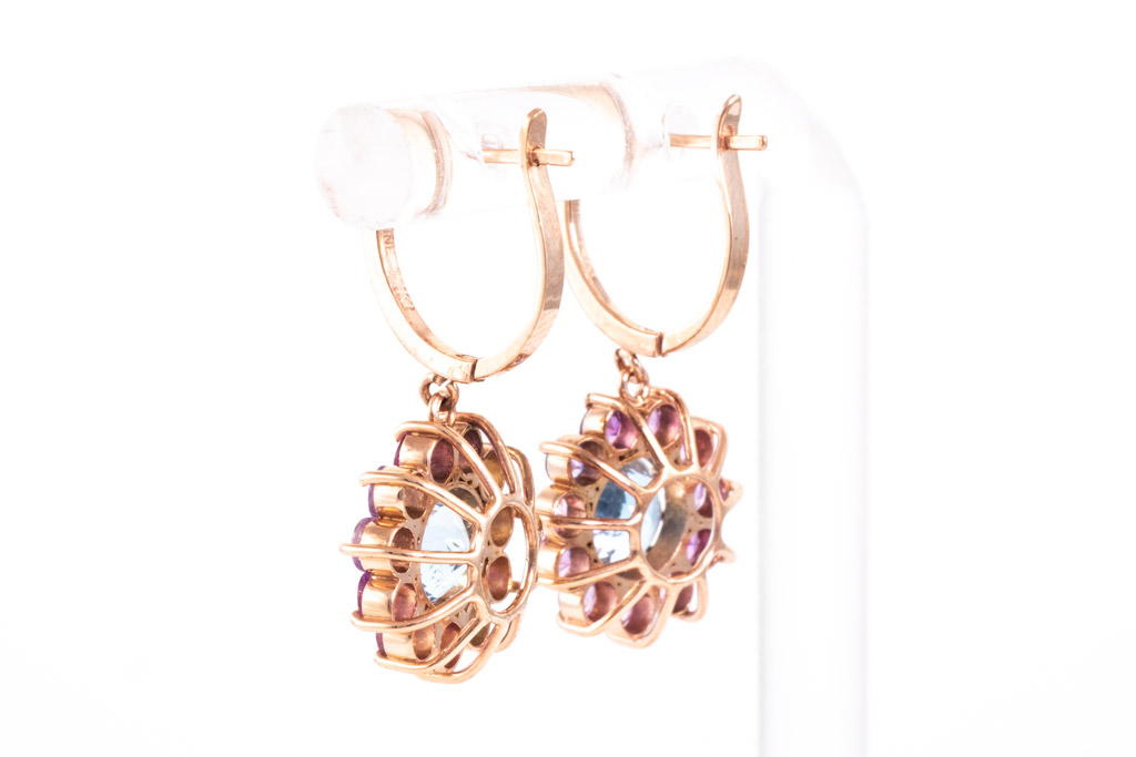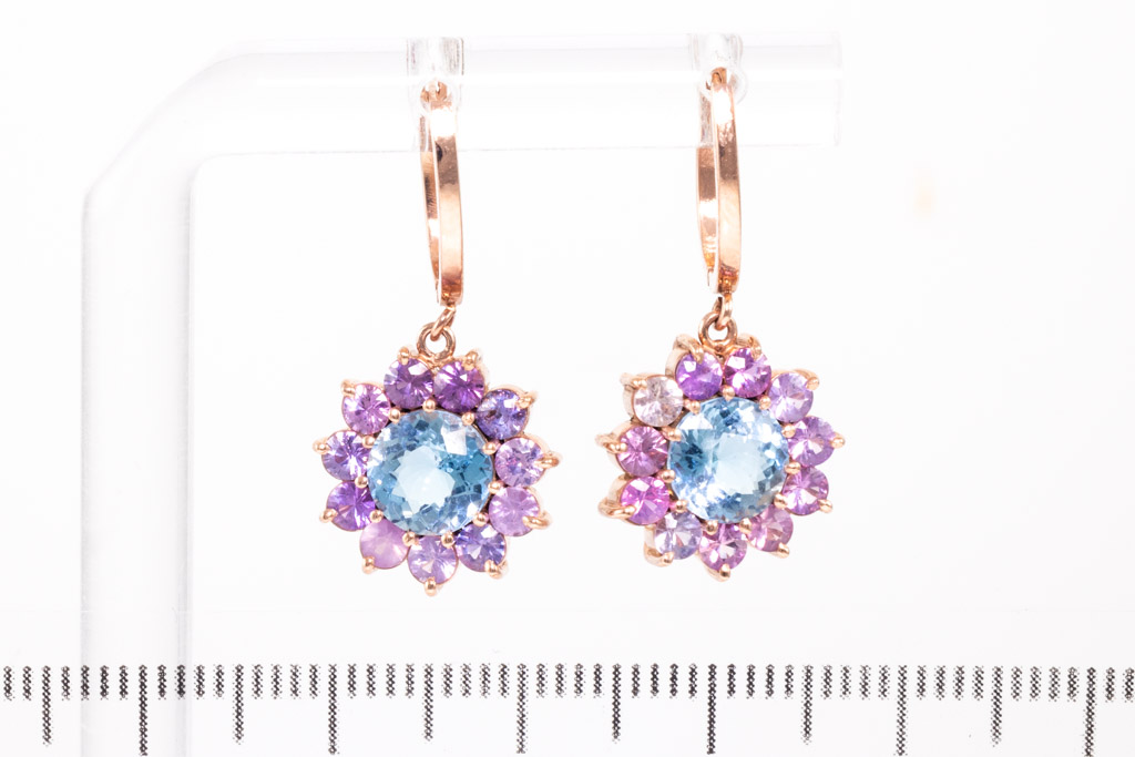 Aquamarine and Sapphire dangle earrings with 2 round Aquamarines totalling 2.01cts and round pink unheated Ceylon Sapphires totalling 0.40cts. 14ct rose gold. With GGTL Certificate #157973. Weight: 4.0g (As New)