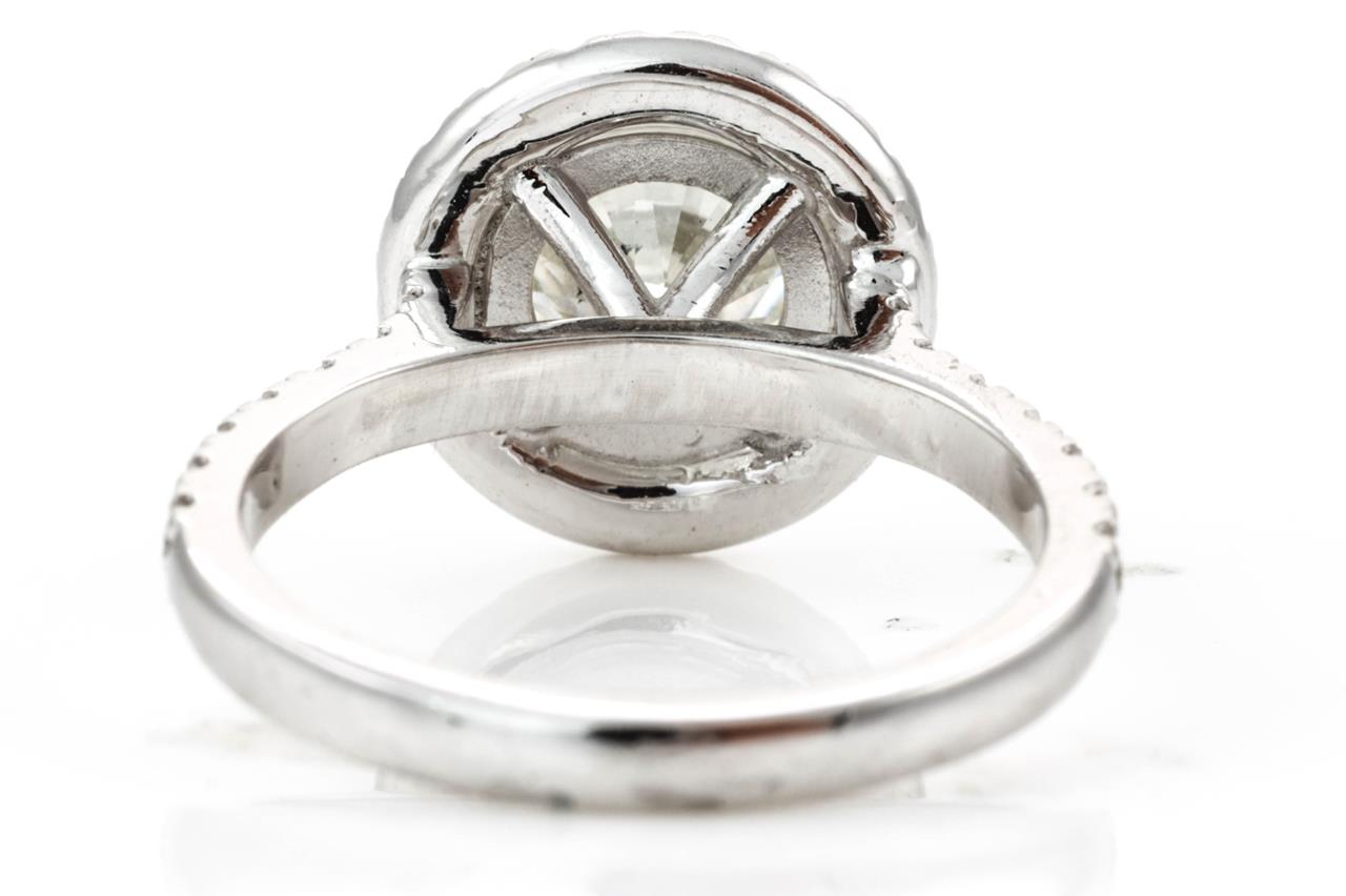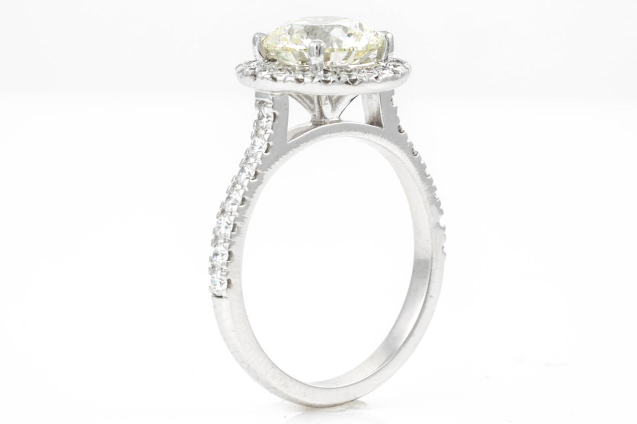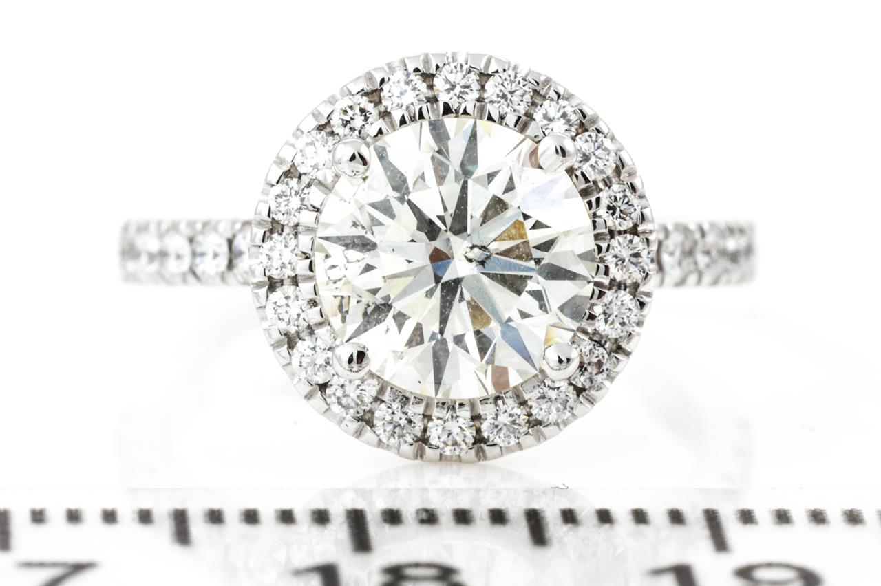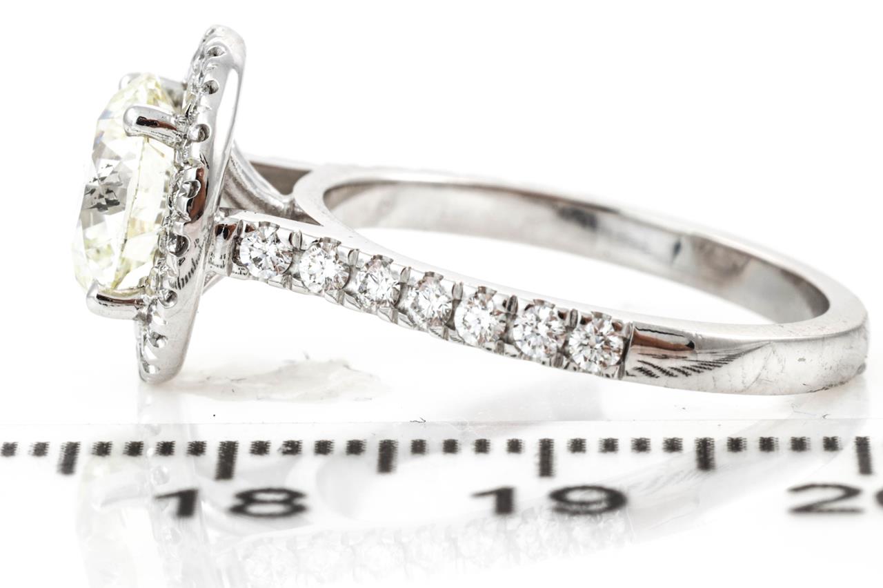 Diamond halo ring with a centre round brilliant cut Diamond of 2.01ct (with GIA report graded as L SI2 #2387659403) and remaining Diamonds totalling 0.46cts (Estimated grading: G VS-SI. 18ct white gold. Ring size K. Weight: 4.9g. (New)