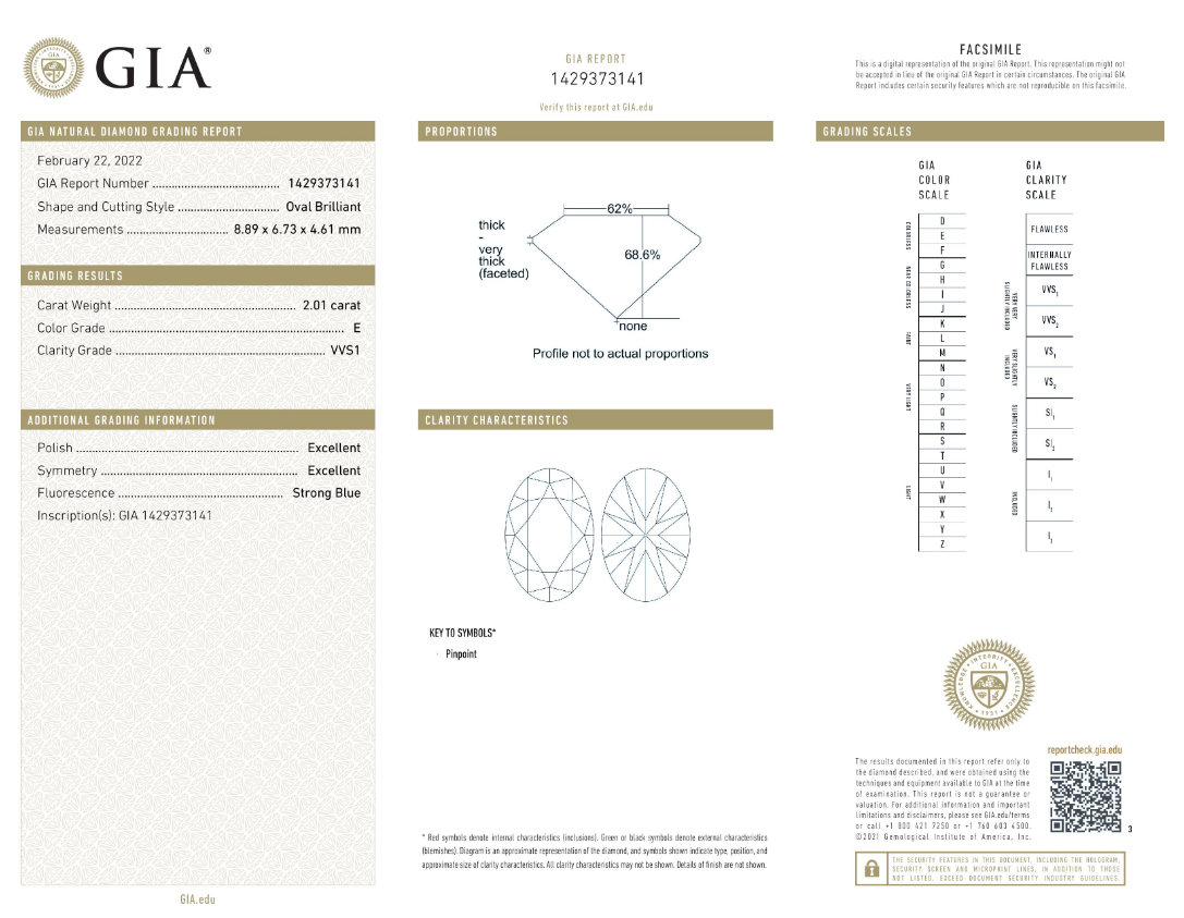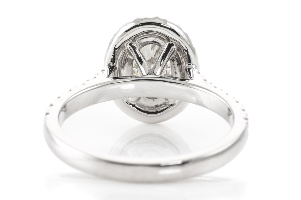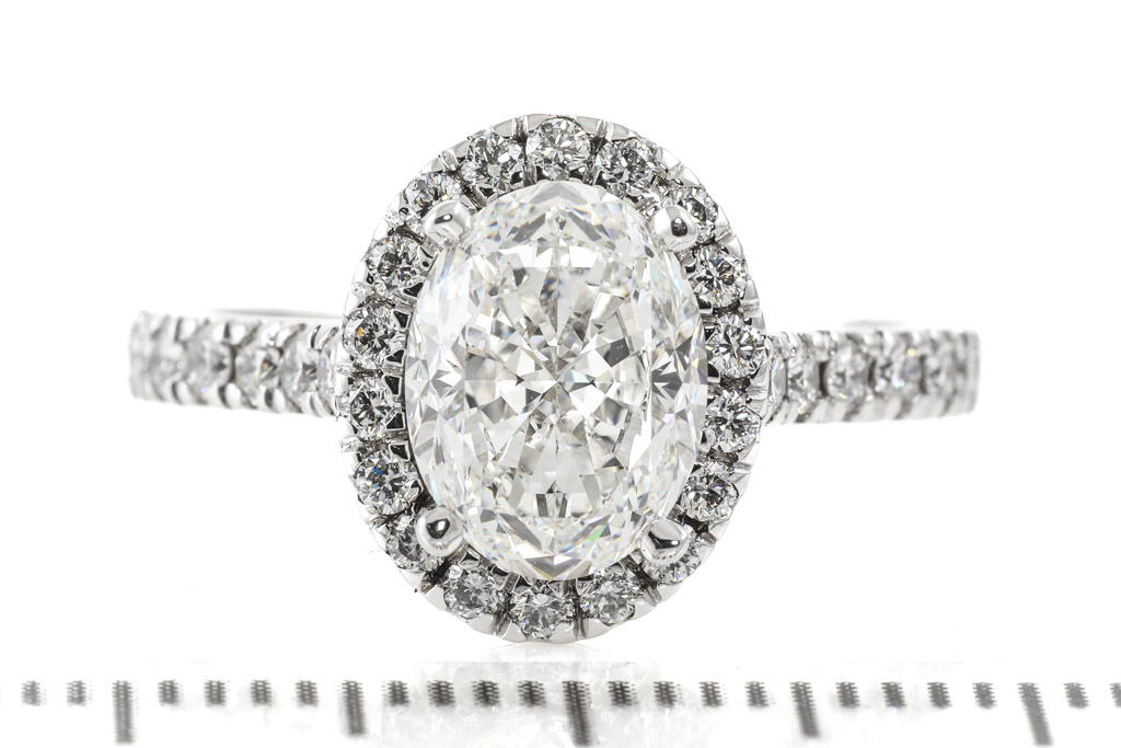 Diamond halo ring with centre oval shape Diamond of 2.01ct (With GIA report graded as E VVS1 #1429373141) and round Diamonds totalling 0.44cts (Estimated grading G VS). 18ct white gold. Ring size L1/2. Weight: 4.8g. (New)