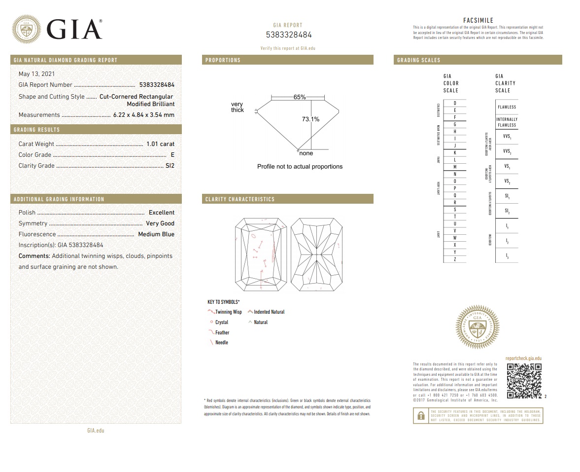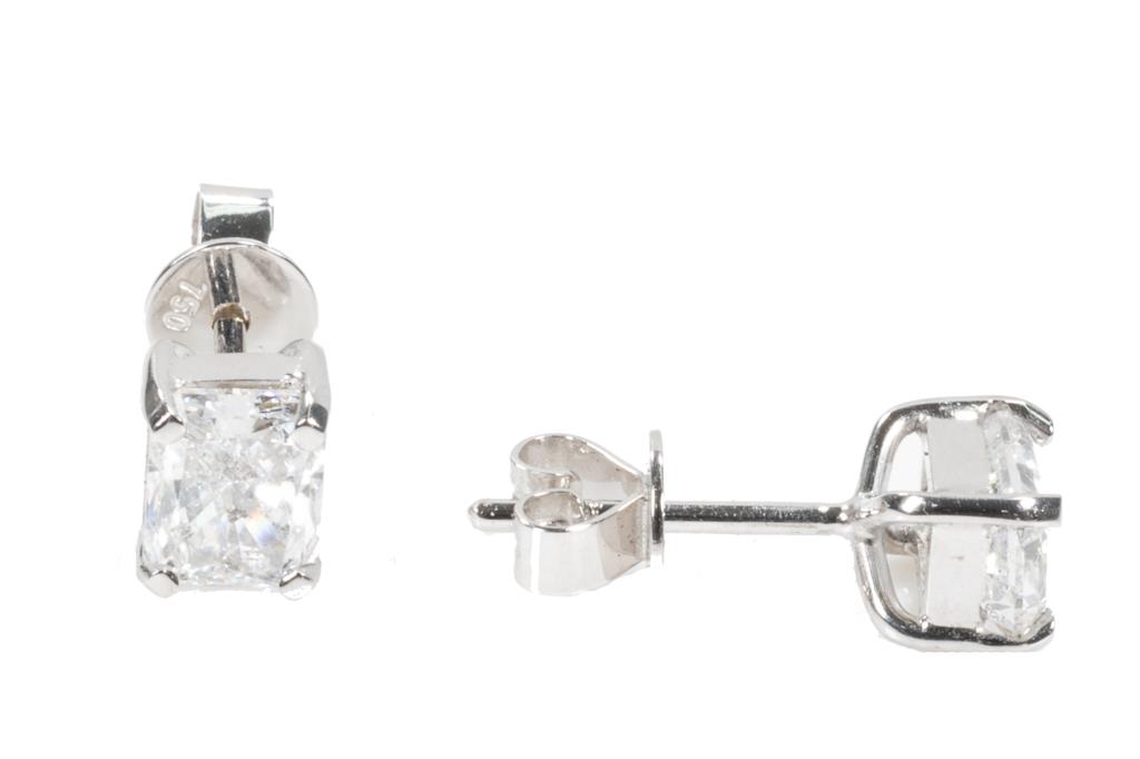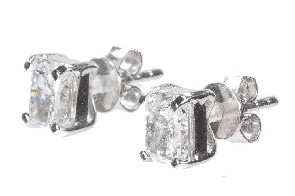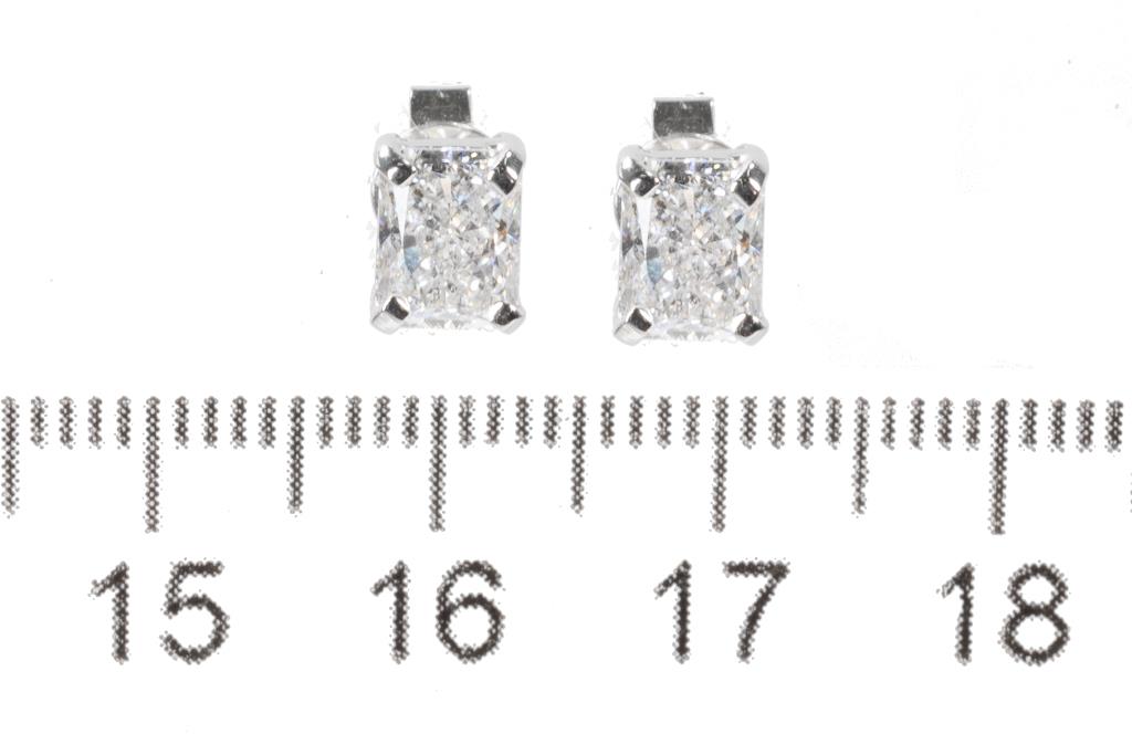 Diamond Studs with 2 radiant cut (cut-cornered rectangular modified brilliant) Diamonds totalling 2.01cts (with GIA reports graded as E SI2 #1216838536, 5383328484). 18ct white gold. Weight: 2.3g (New)