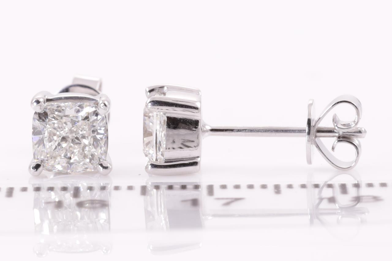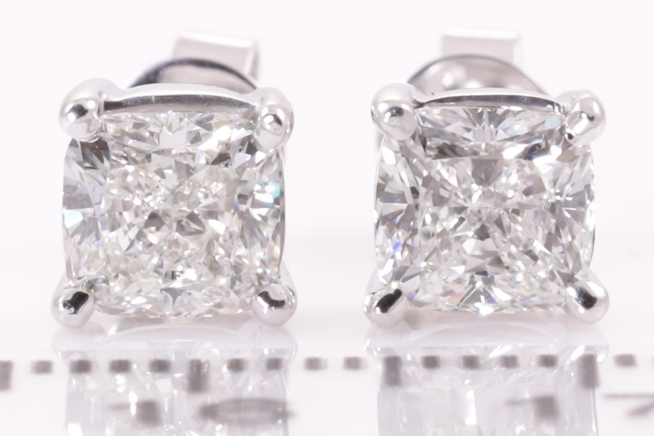 Diamond stud earrings with 2 cushion cut Diamonds totalling 2.01cts (Both with GIA reports graded as H SI1 & I SI1 #5211924132, 6224032969). 18ct white gold. Weight: 3g. (New)