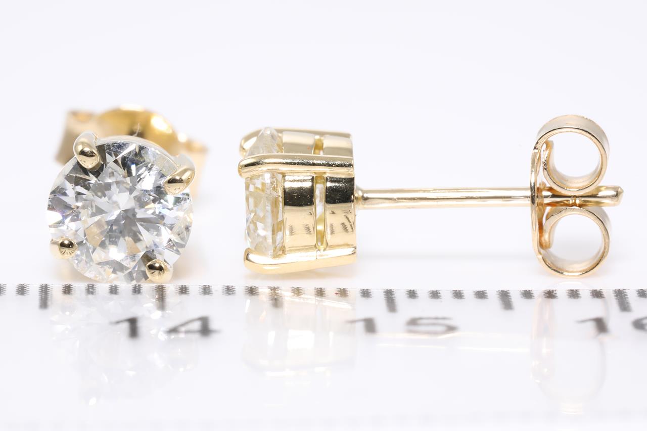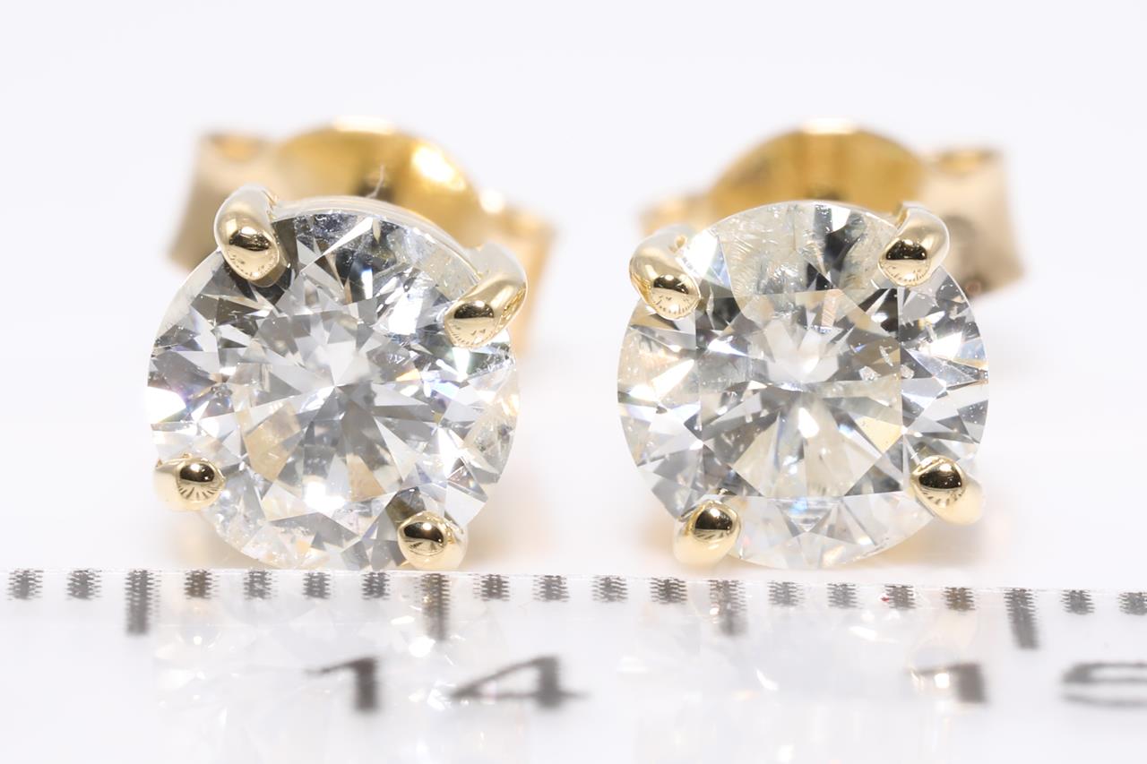 Diamond stud earrings with 2 round brilliant cut Diamonds totalling 2.01cts (Estimated grading: J P2). 18ct yellow gold. Weight: 2.5g. With certificate #414538. (New).