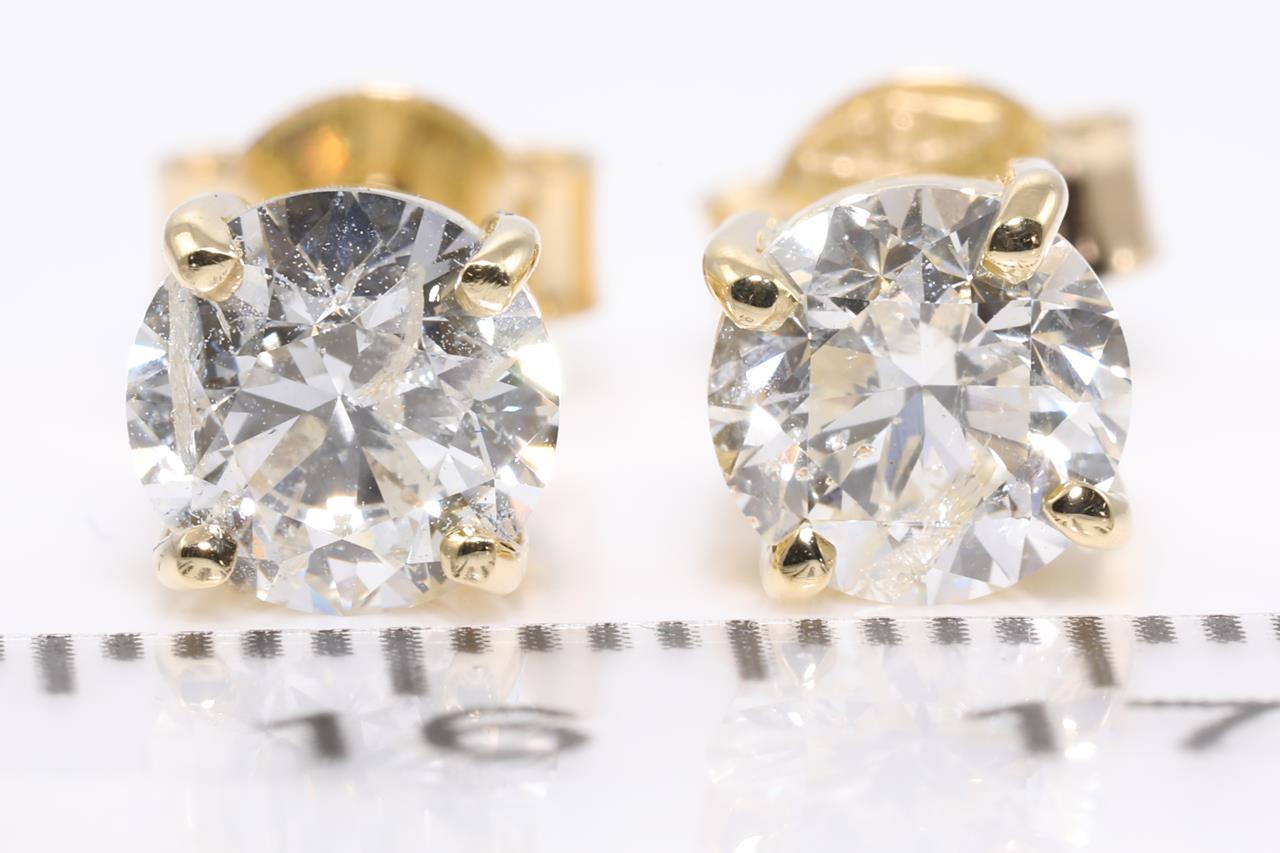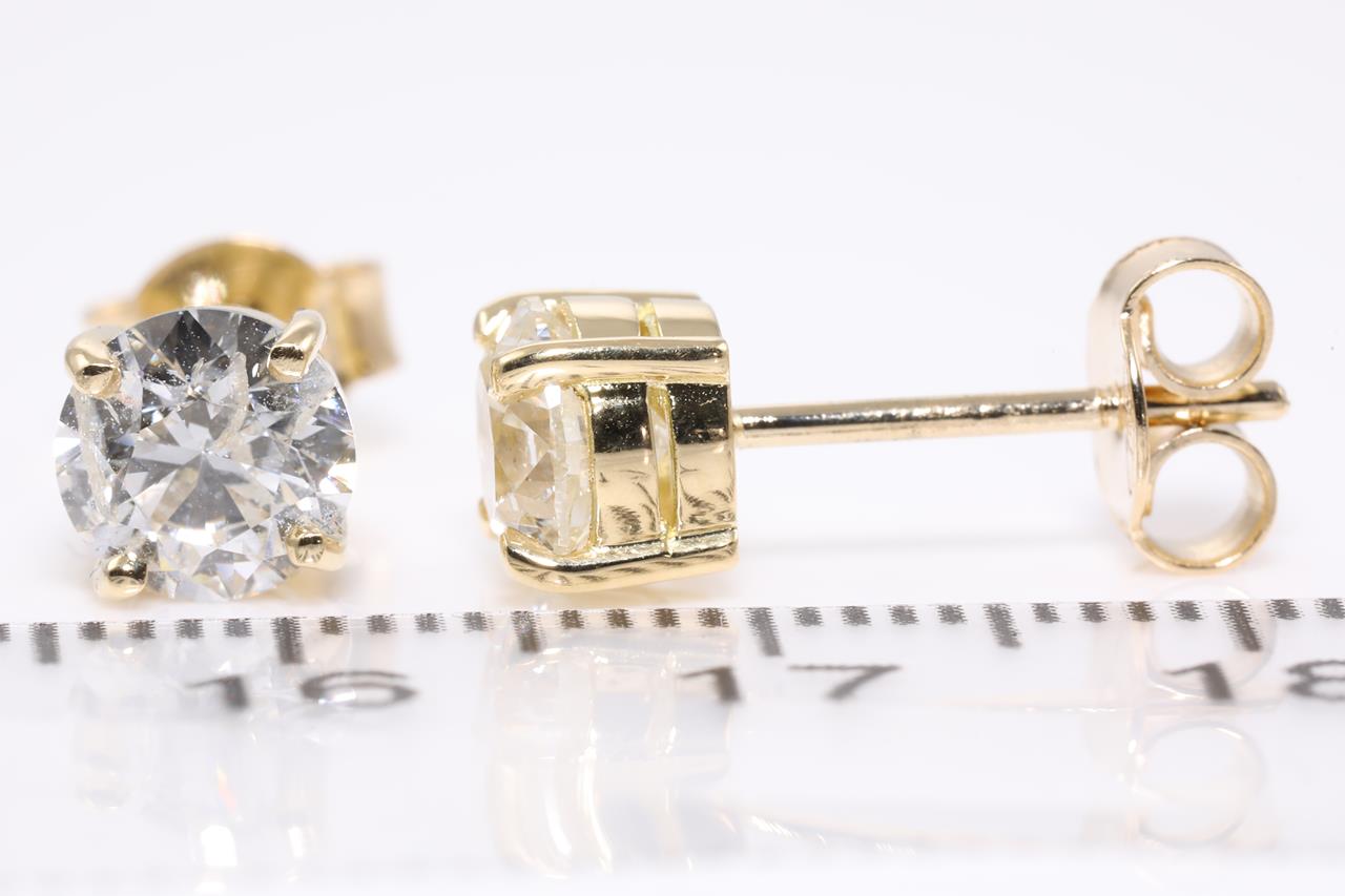 Diamond stud earrings with 2 round brilliant cut Diamonds totalling 2.01cts (Estimated grading: H P2). 18ct yellow gold. Weight: 2.6g. With certificate #414540 (New).