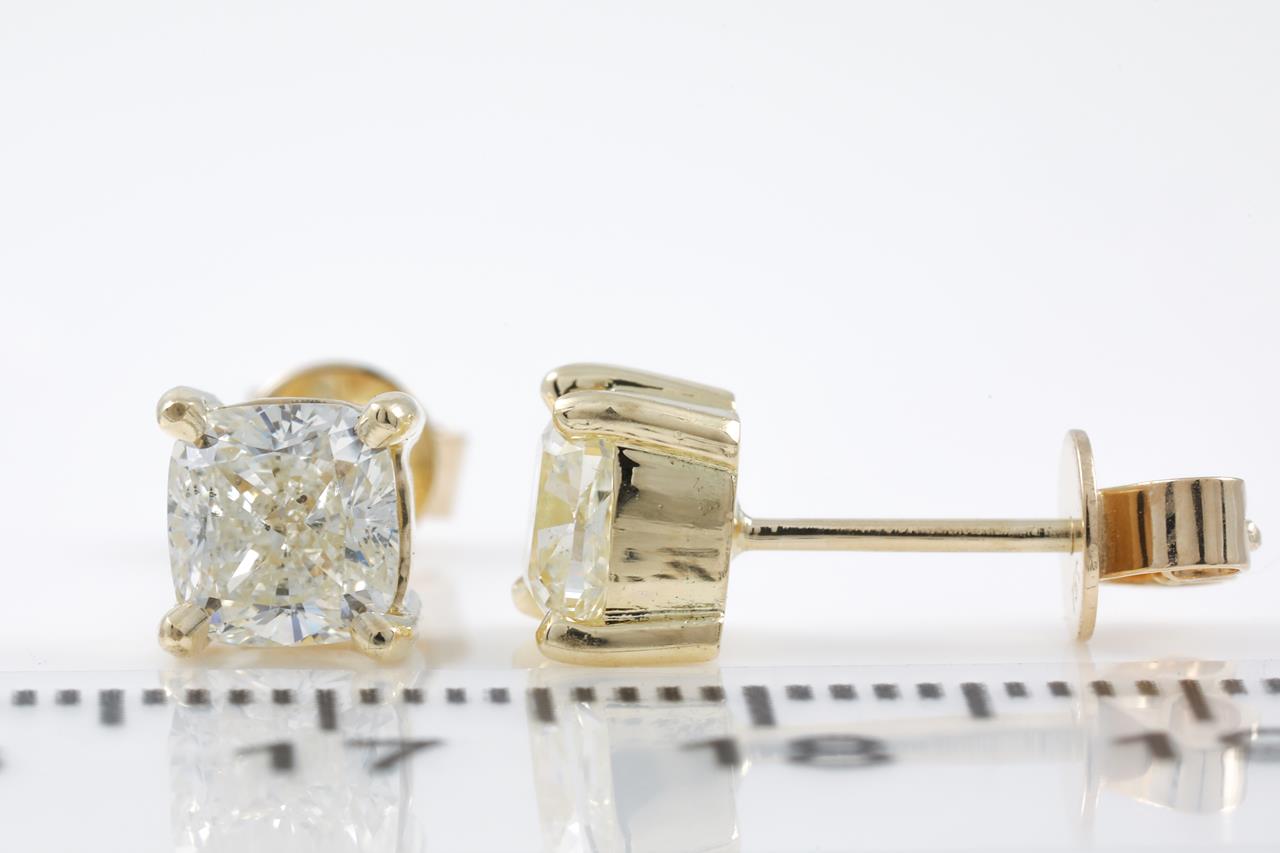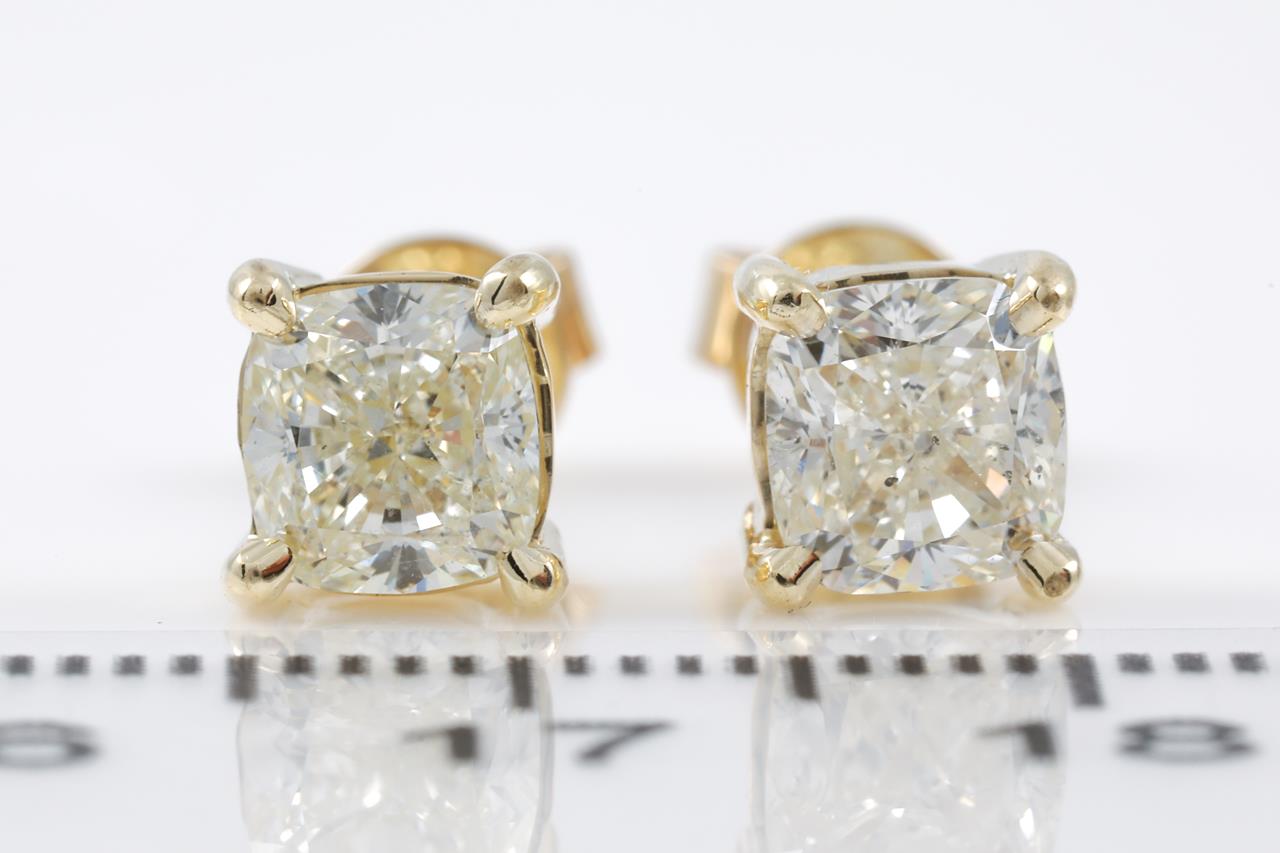 Diamond Stud earrings with 2 cushion cut Diamonds totalling 2.01cts (With GSL memos graded as J P1#GSL091221-7 and K SI2 #GSL091221-6). 18ct yellow gold. Weight: 2.9g (New)