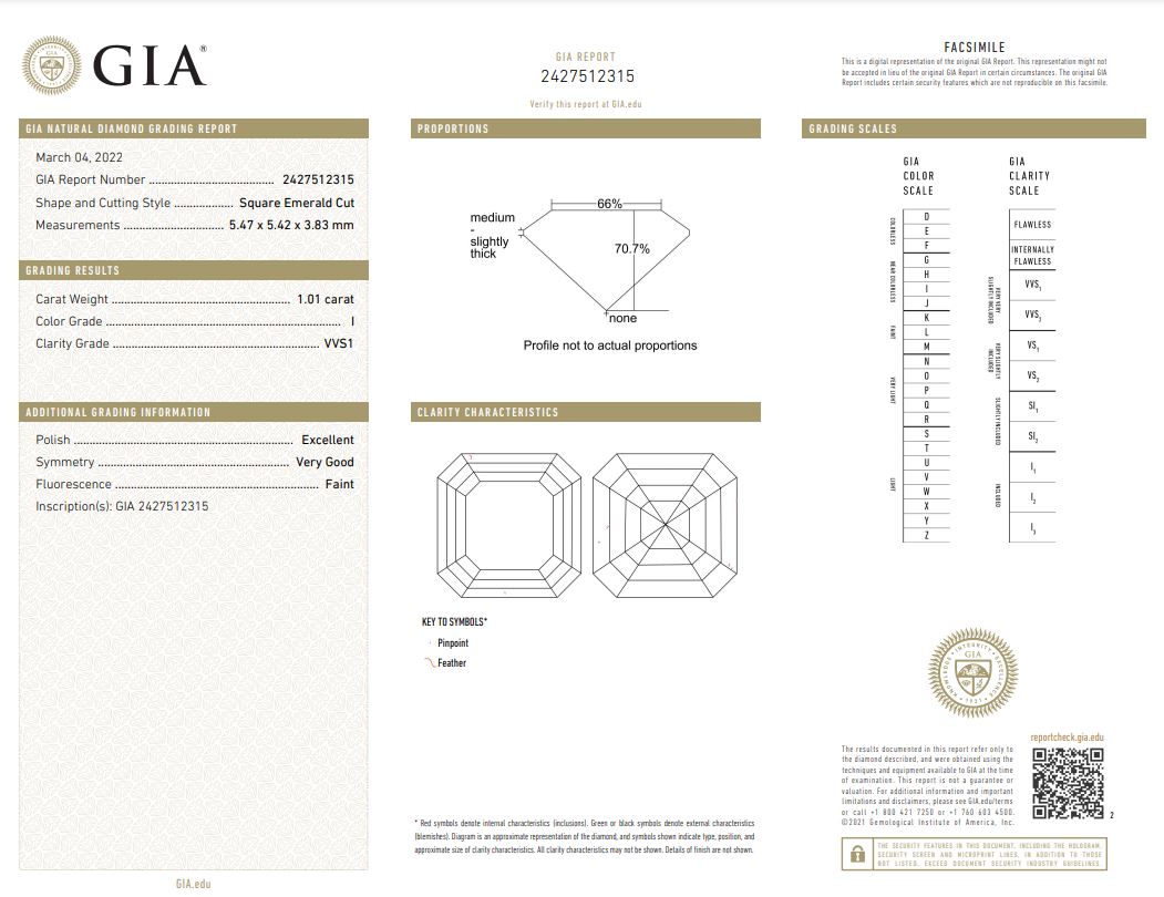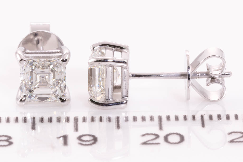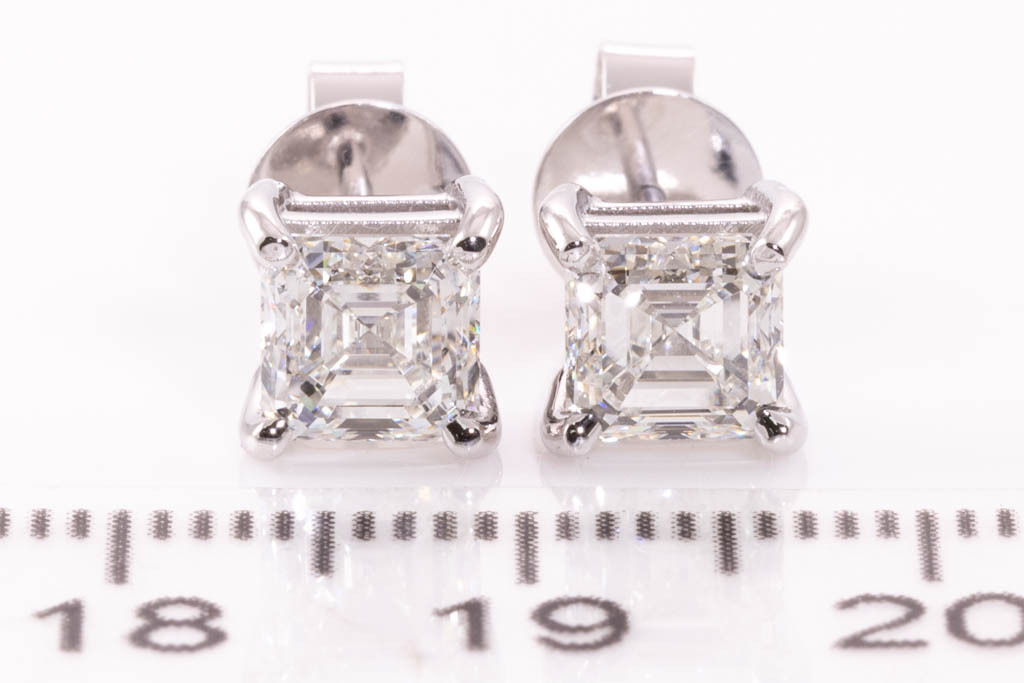Diamond stud earrings with 2 square emerald cut Diamonds totalling 2.01cts (both with GIA reports graded as I VVS2 #2427512315, 7433583222). 18ct white gold. Weight 3.1g. (New)
