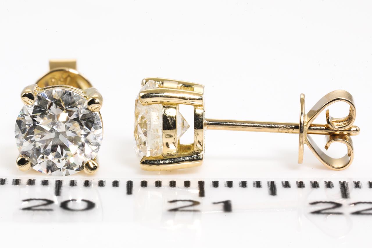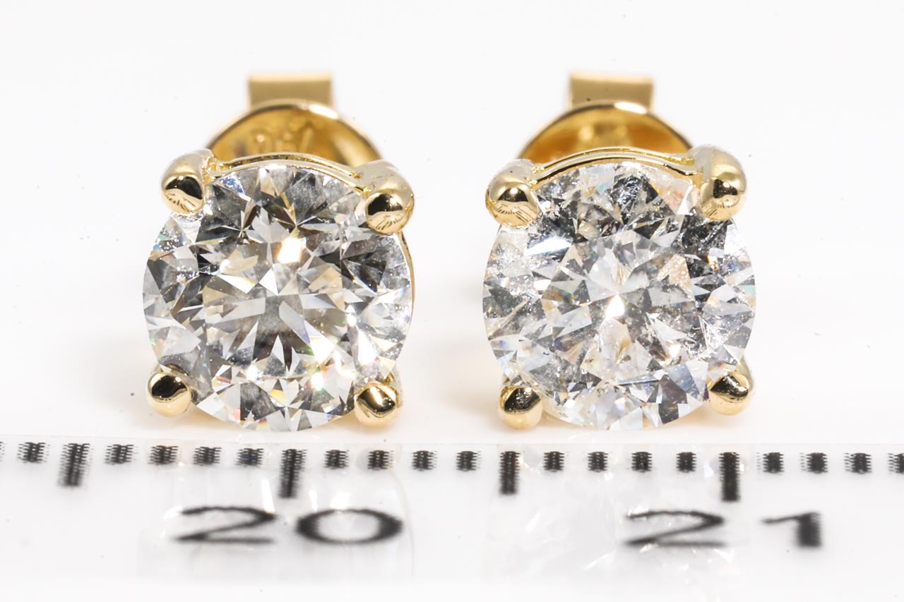 Diamond stud earrings with 2 round brilliant cut Diamonds totalling 2.01cts (With GSL memos graded as J P2 #GSL080222-25, I P1 #GSL080222-26). 18ct yellow gold. Weight: 2.3g (New)