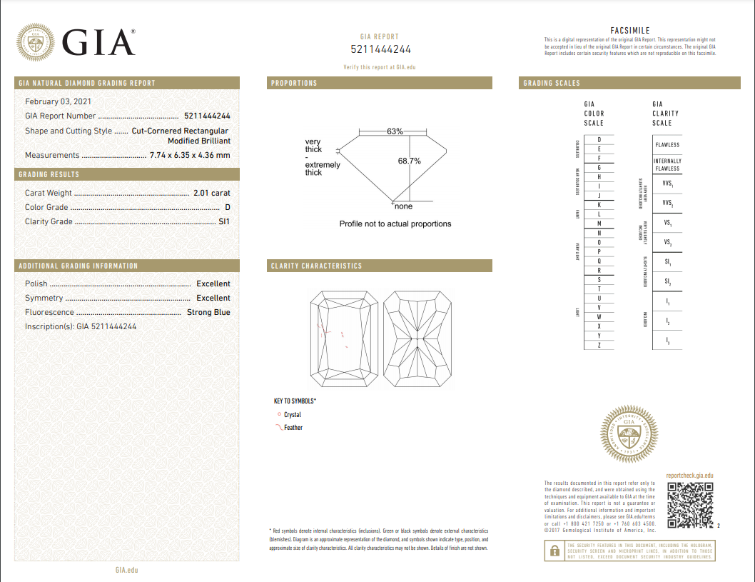 A loose Radiant cut Diamond of 2.01ct (with GIA report graded as D SI1 #5211444244). (New)