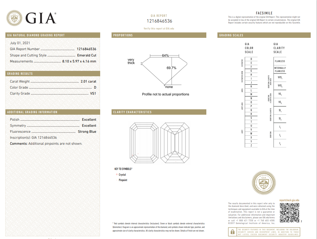 A loose Emerald cut Diamond of 2.01ct (with GIA report graded as D VS1 #1216846536). (New)