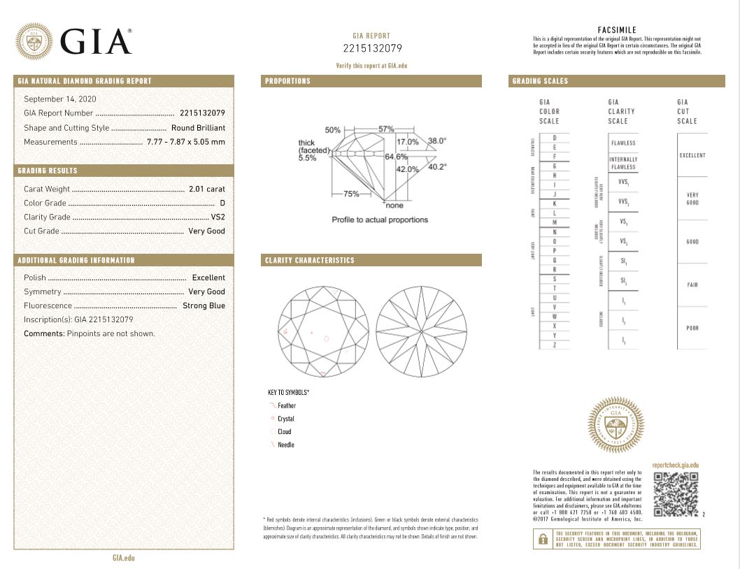 A loose Round Brilliant Cut Diamond of 2.01ct (with GIA report graded as D VS2 #2215132079). (New)