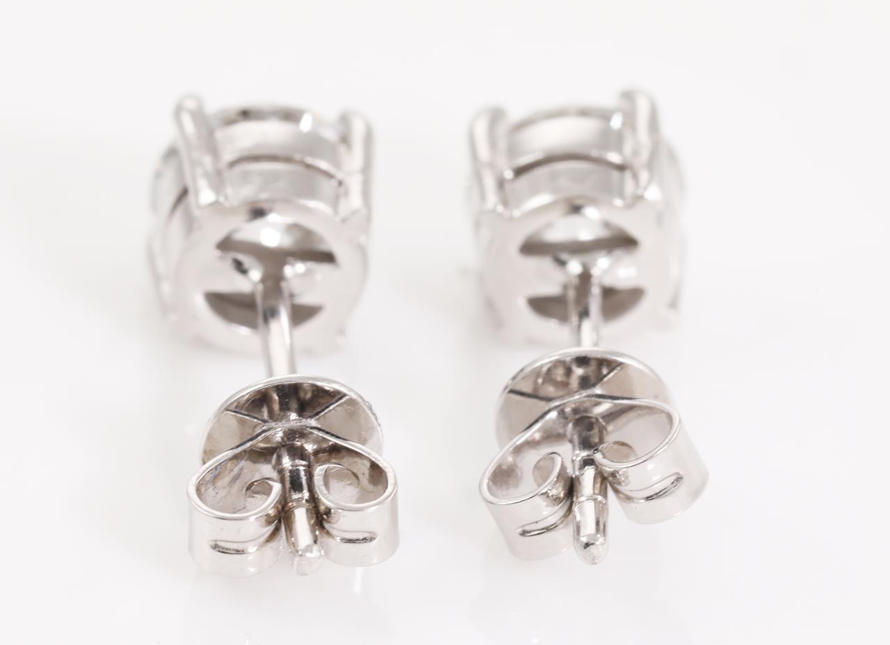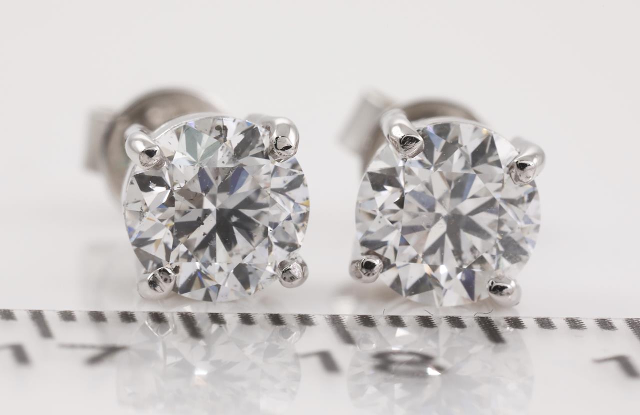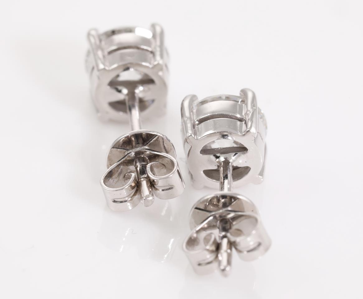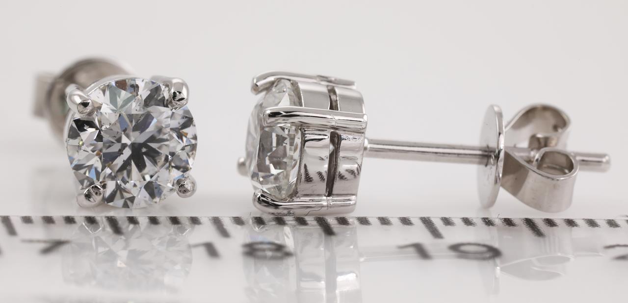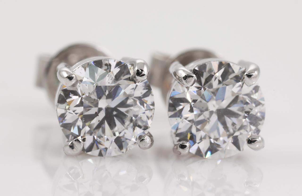 Diamond stud earrings with 2 round brilliant cut Diamonds totalling 2.01cts (Both with GIA reports graded as E SI2 #1379285291, 6385018880). 18ct white gold. Weight: 2.8g. (New)