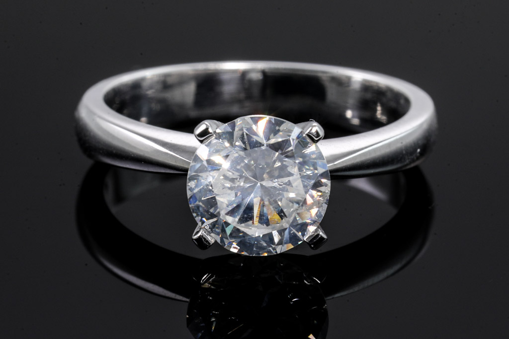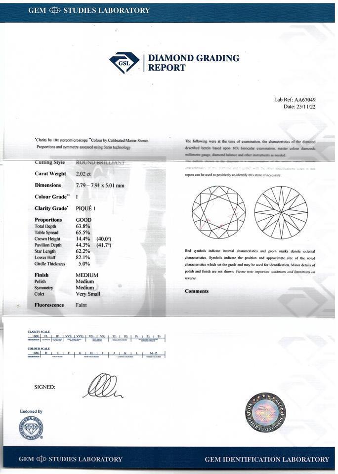 Diamond solitaire ring with round Brilliant cut Diamond of 2.02cts (With GSL Diamond Report graded as I P1 #AA67049). 18ct whtie gold. Ring size: N. Weight: 5.0g (Pre-owned)