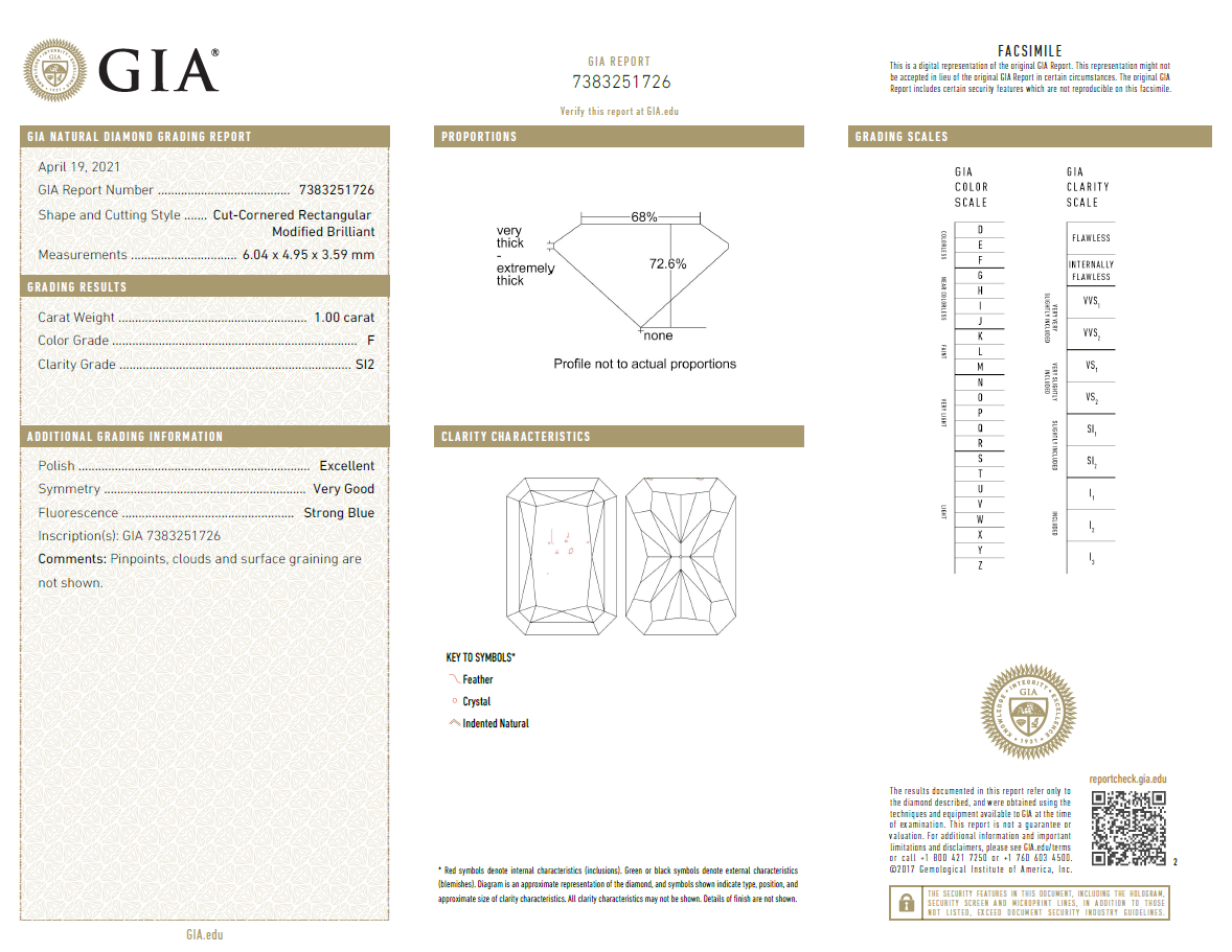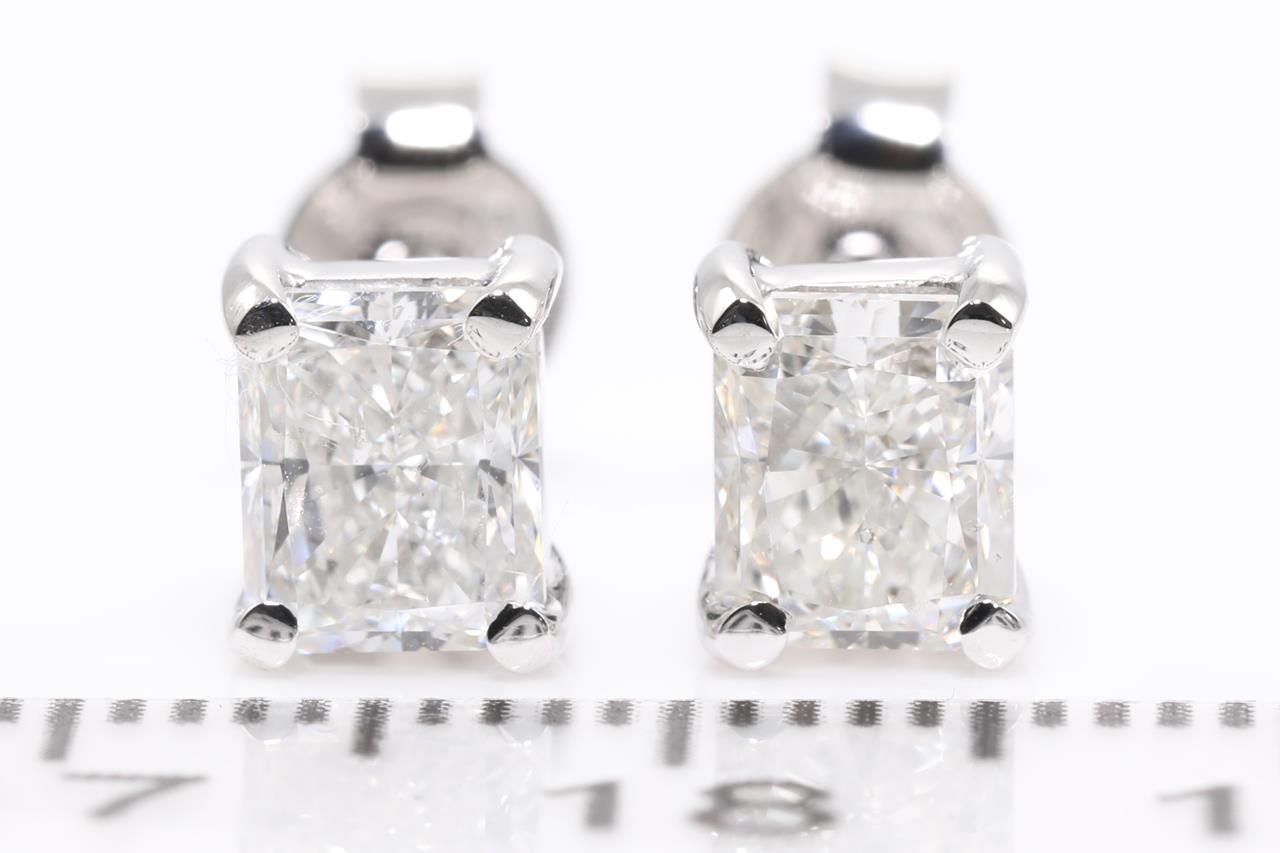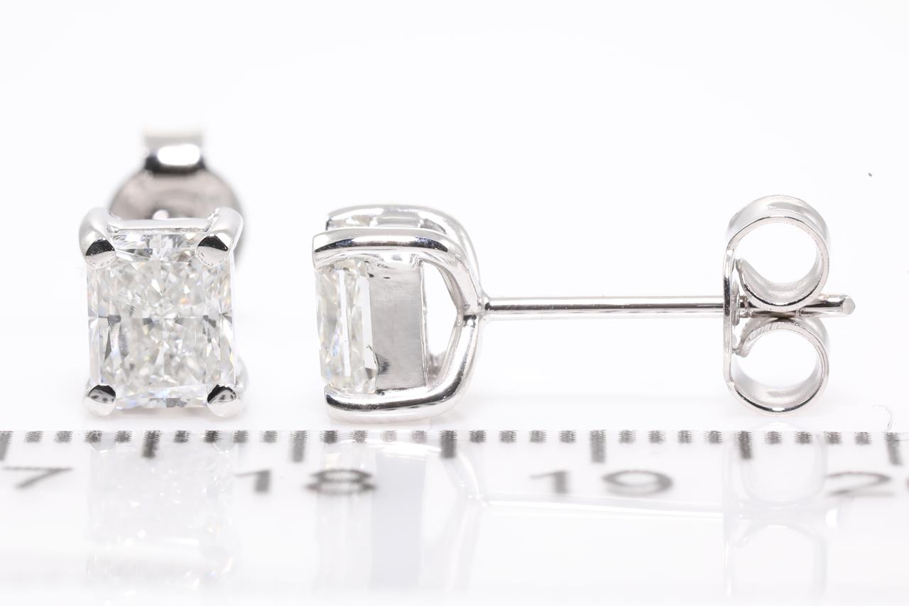 Diamond stud earrings with 2 radiant cut Diamonds totalling 2.02cts (with GIA reports graded as F SI2 & G SI1 #7383251726, 2213421743). 18ct white gold. Weight: 2.6g (New).