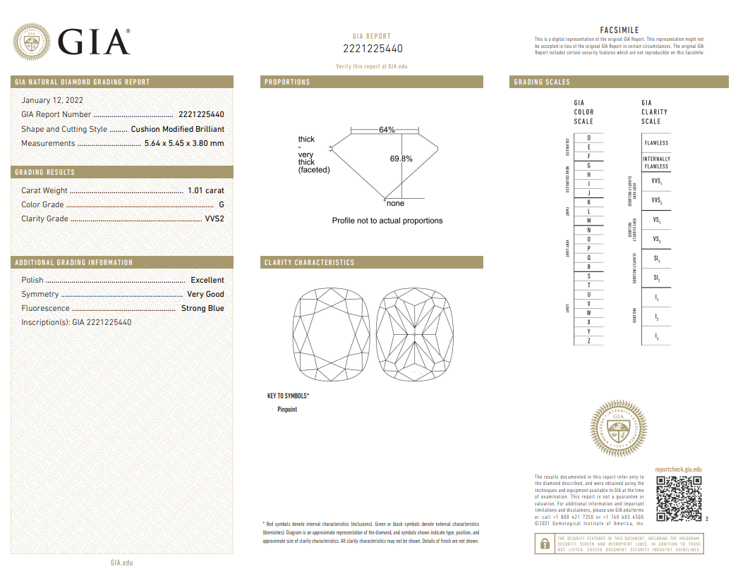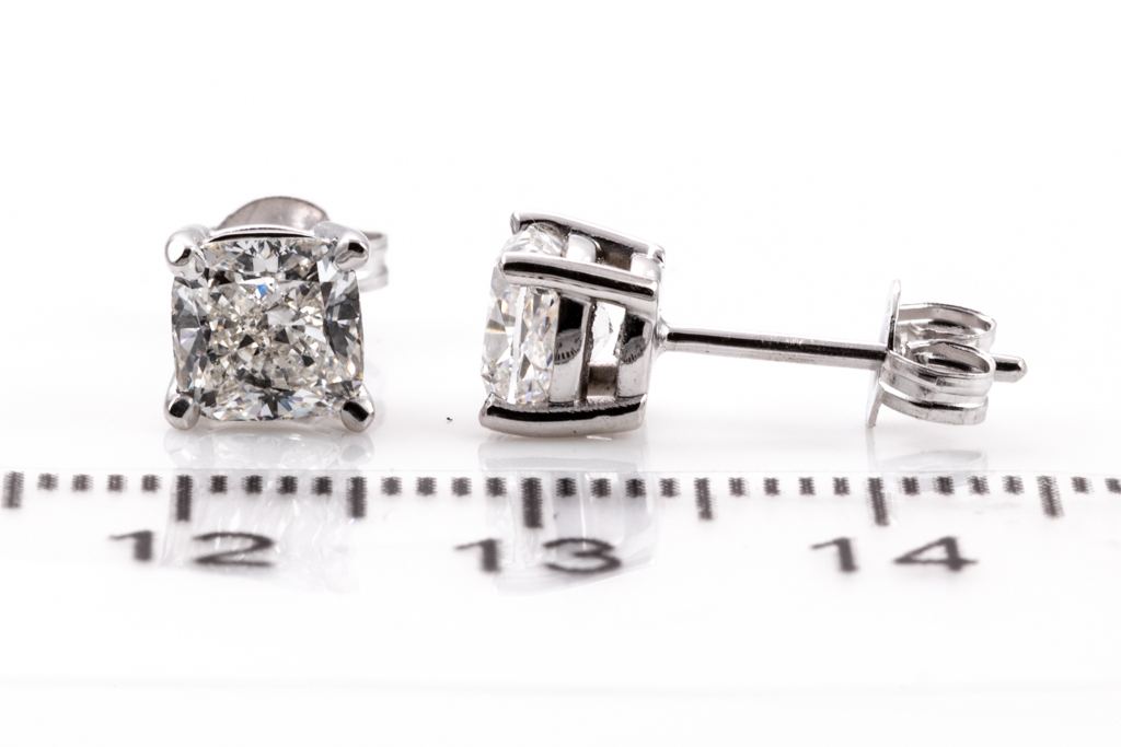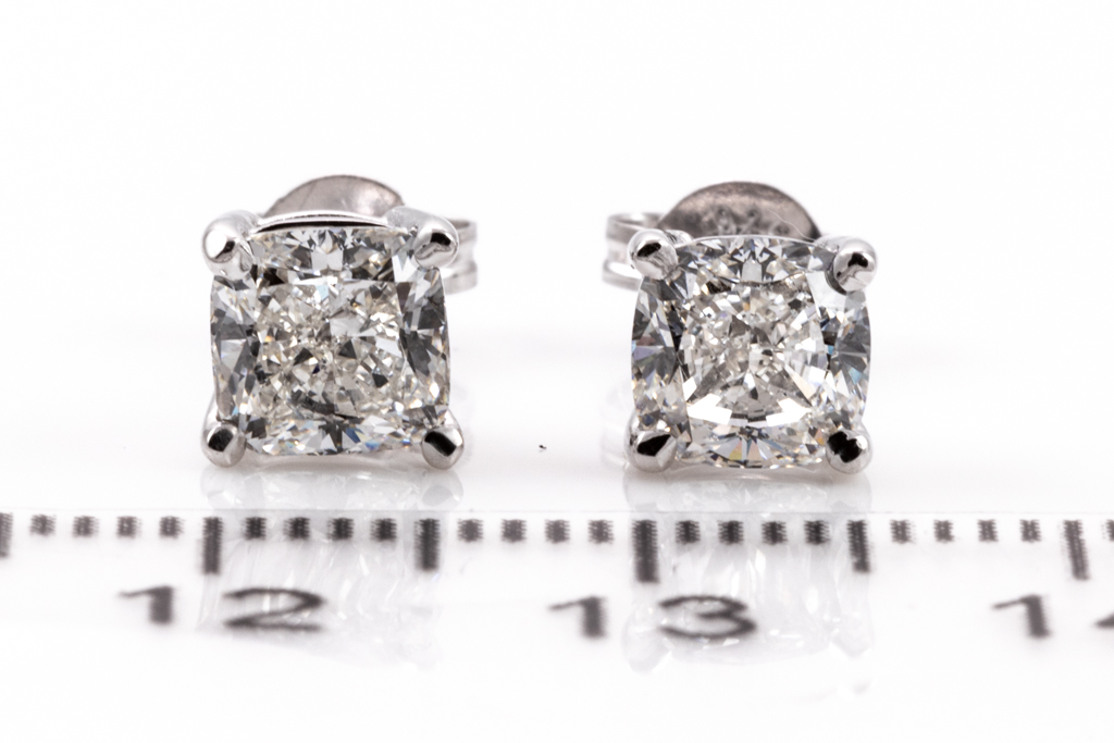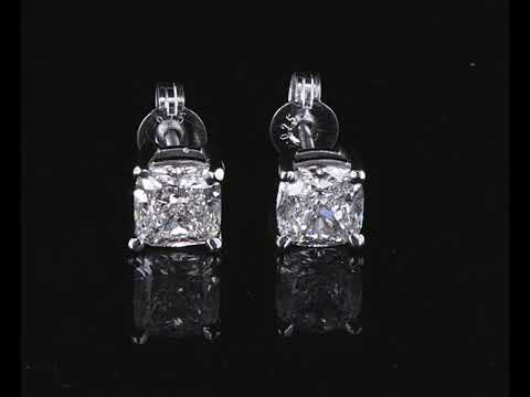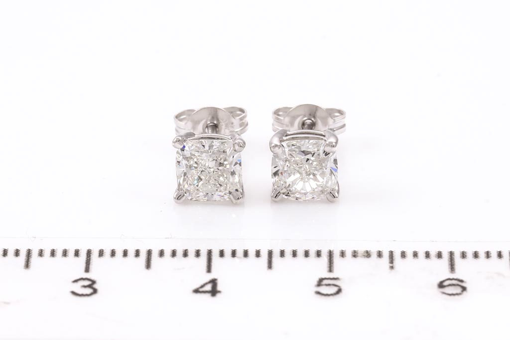 Diamond stud earrings with 2 cushion cut Diamonds totalling 2.02cts (Both with GIA reports graded as F VVS1 & G VVS2 #6227203685, 2221225440). 18ct white gold. Weight: 2.2g. (New)