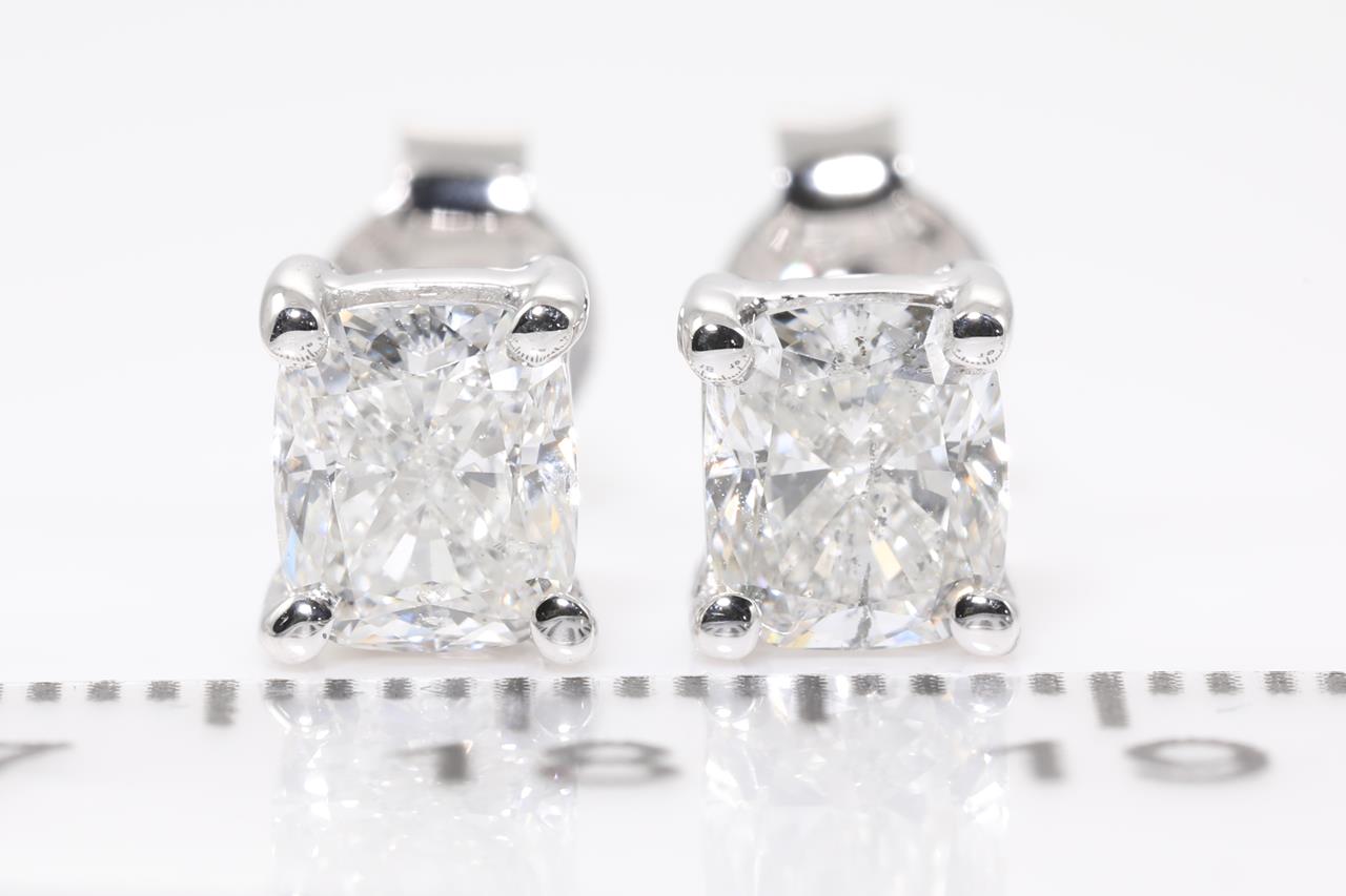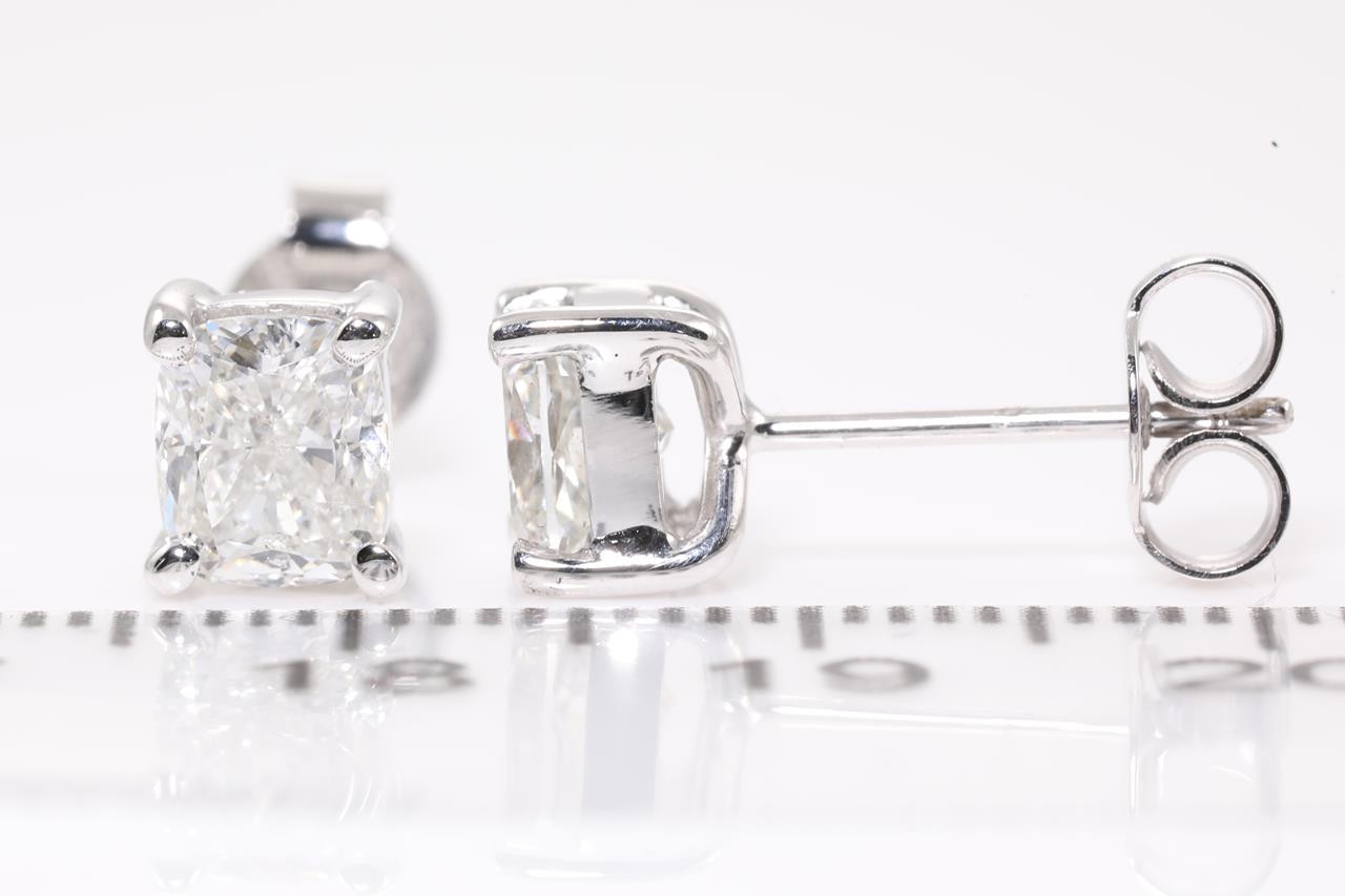 Diamond stud earrings with 2 cushion cut Diamonds totalling 2.02cts (with GIA reports graded as H SI2 #6381181541, 5383310470). 18ct white gold. Weight: 2.8g (New).
