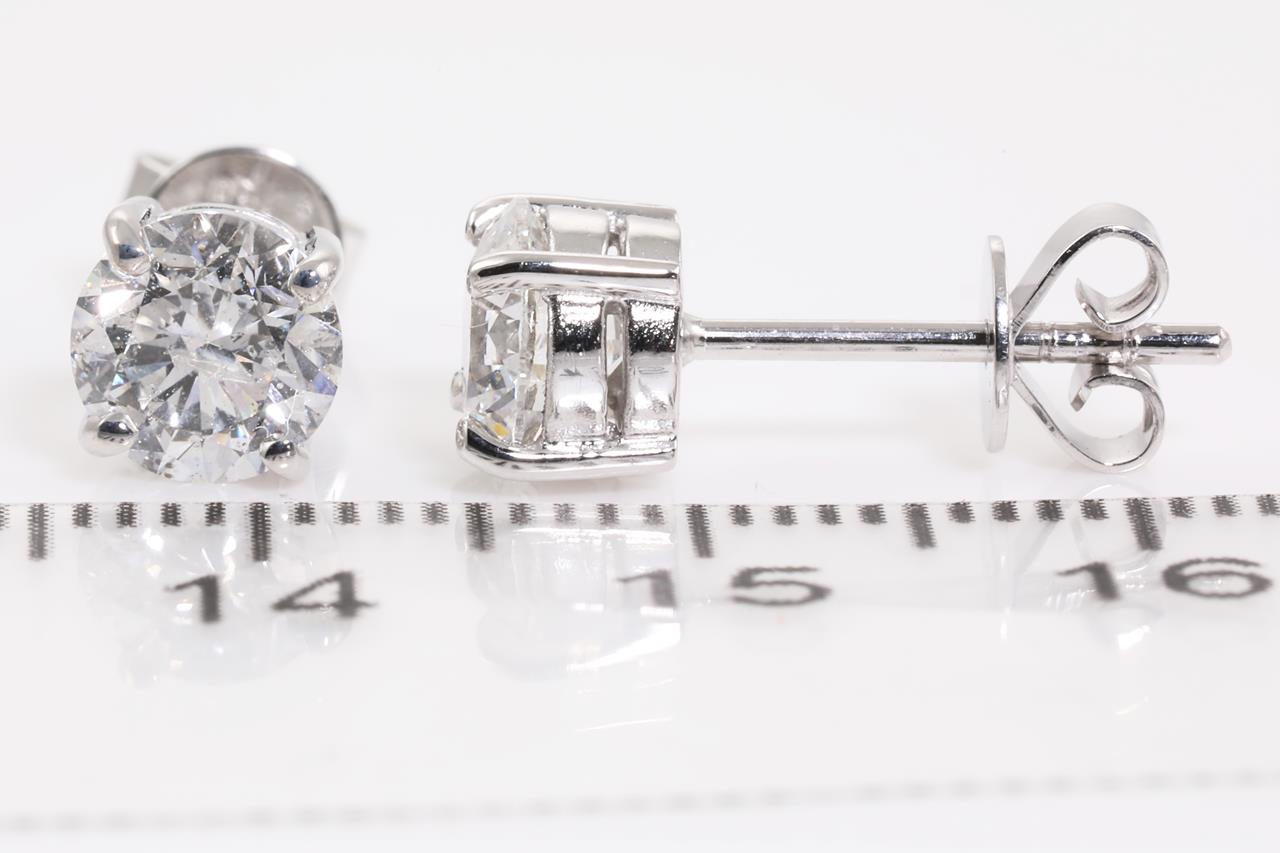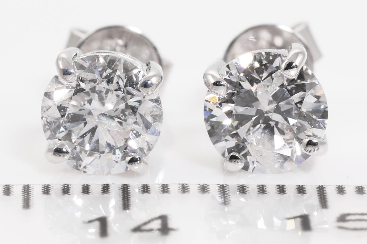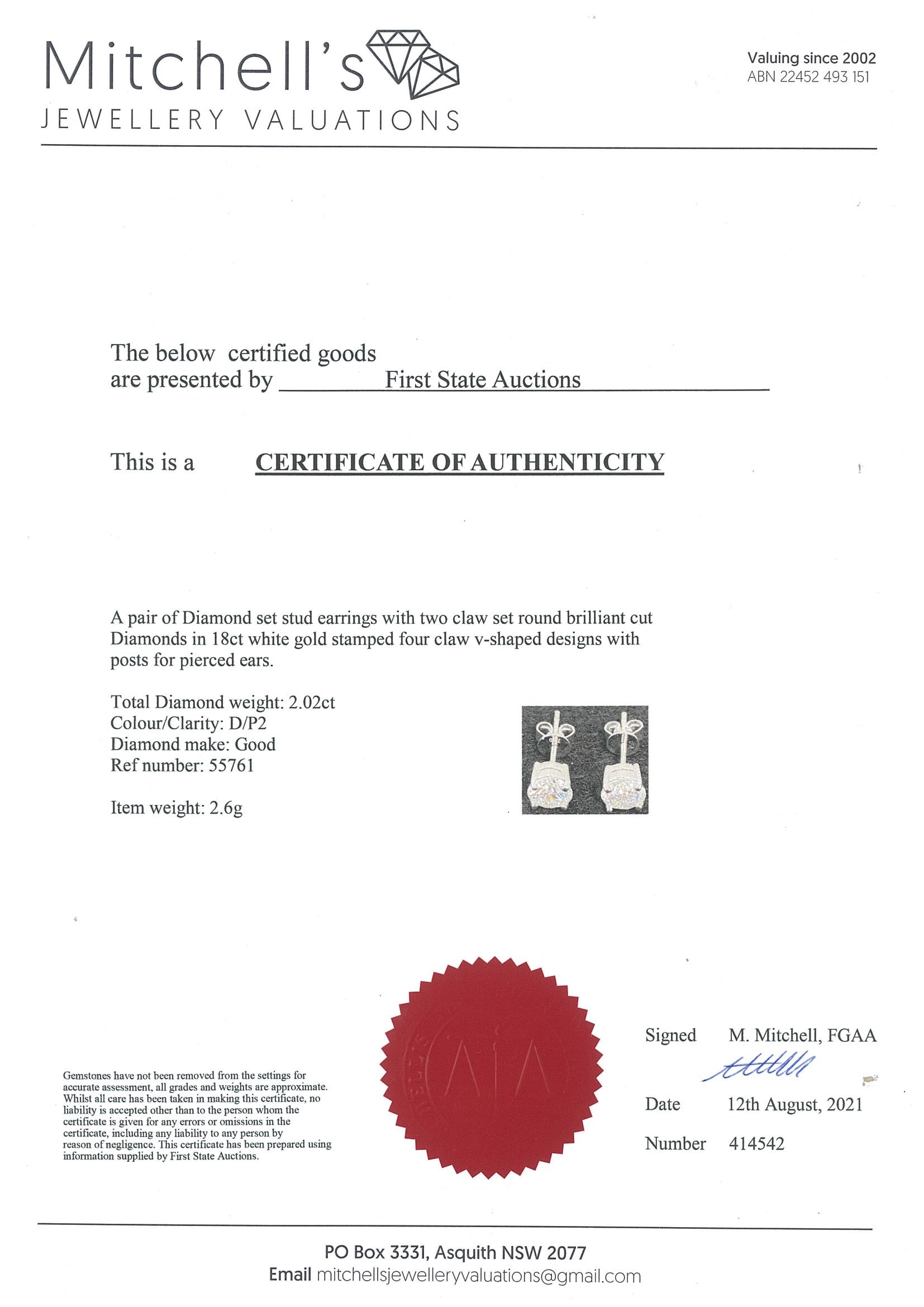 Diamond stud earrings with 2 round brilliant cut Diamonds totalling 2.02cts (Estimated grading: D P2). 18ct white gold. Weight: 2.6g. With certificate #414542. (New).