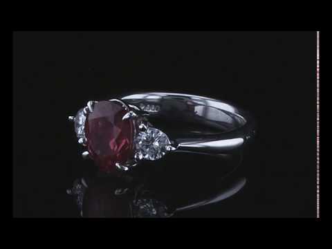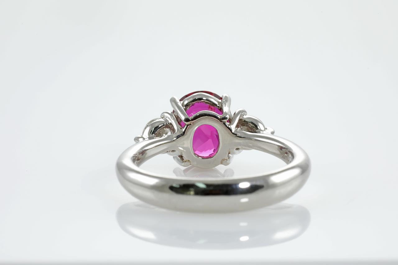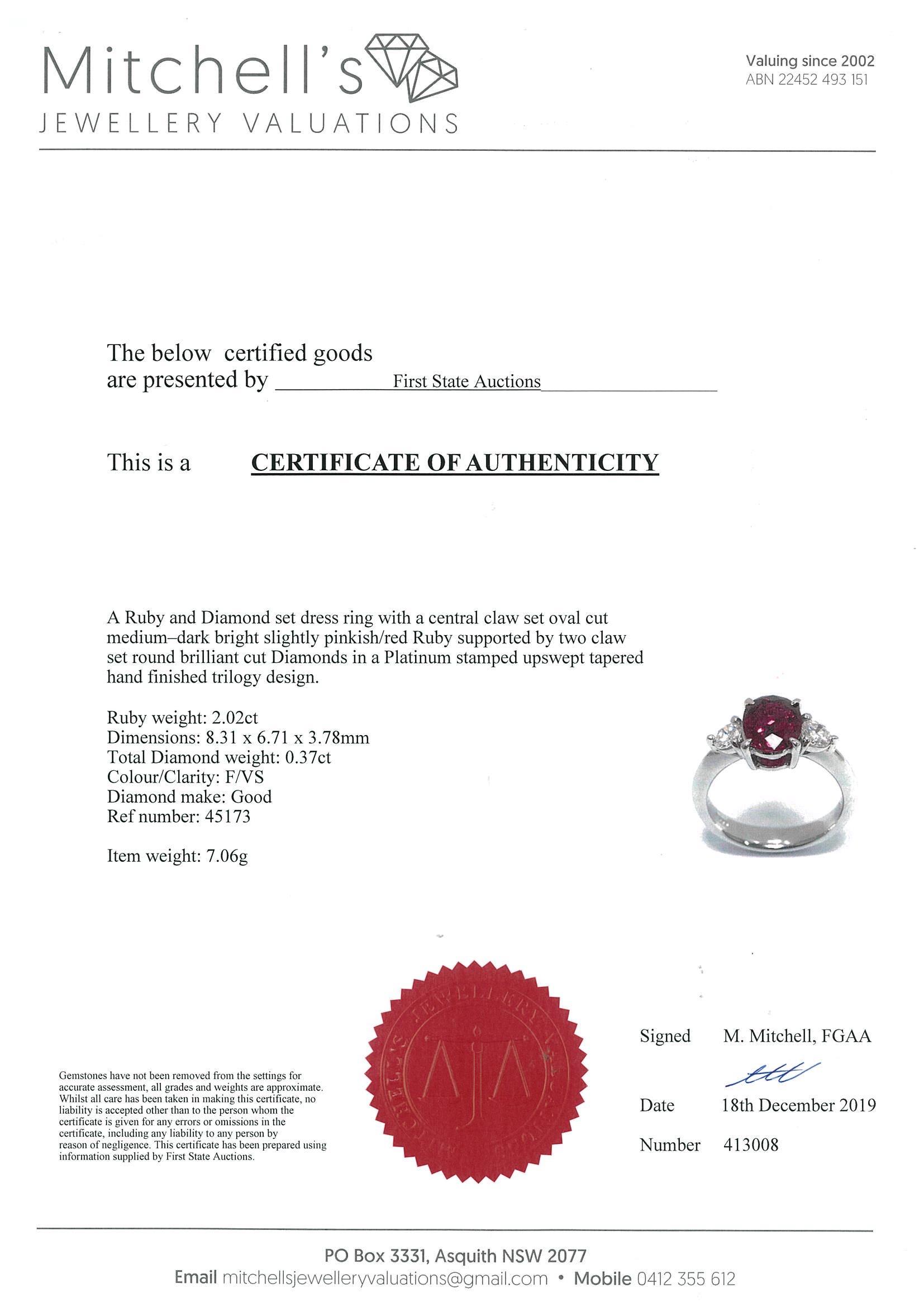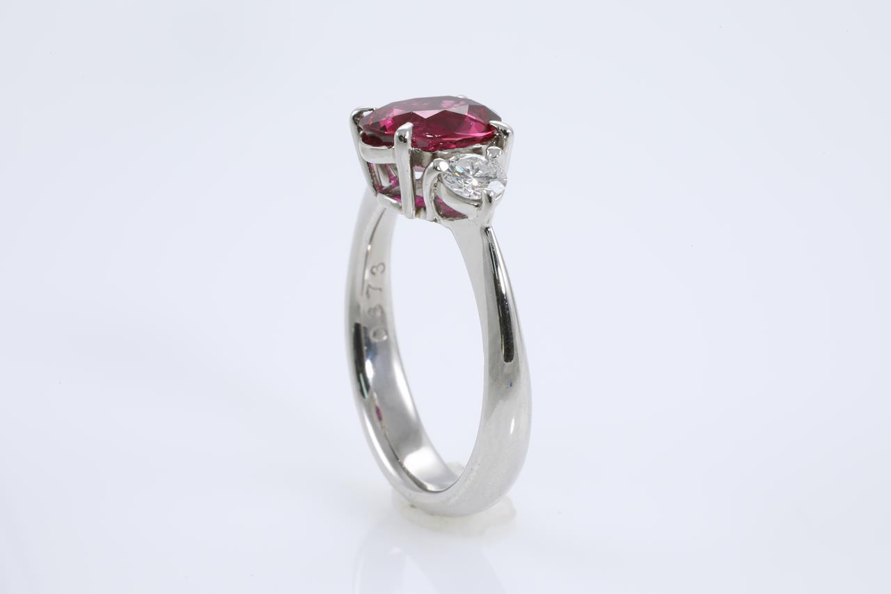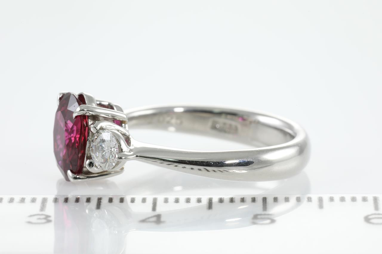 Ruby and Diamond trio ring with an oval Ruby of 2.02ct and shoulder round Diamonds totalling 0.37cts (Estimated grading: F VS). Platinum. Ring size L1/2. With certificate#413008. Weight: 7g. (Pre-owned)