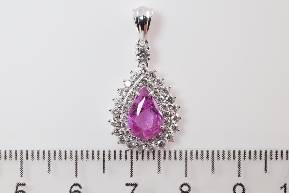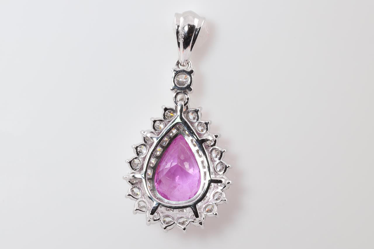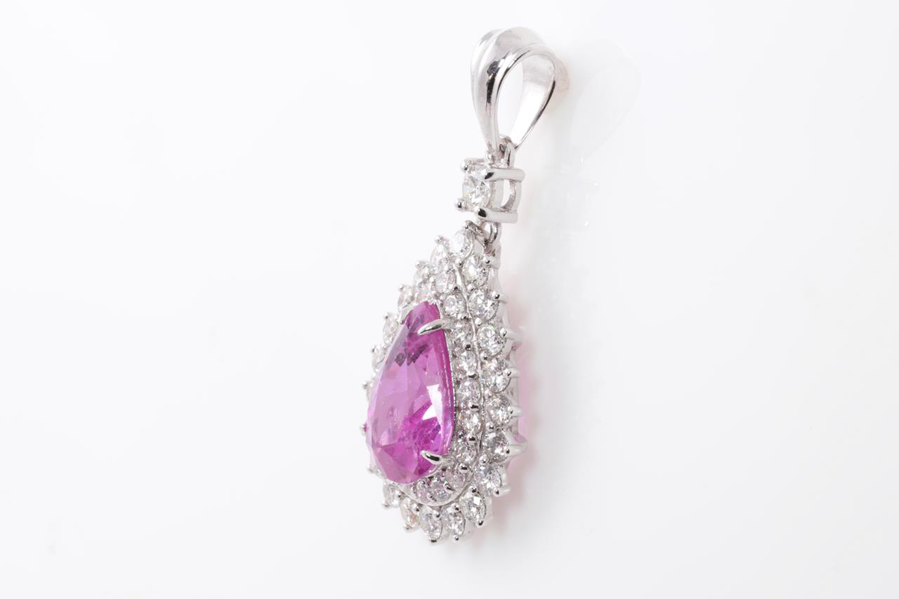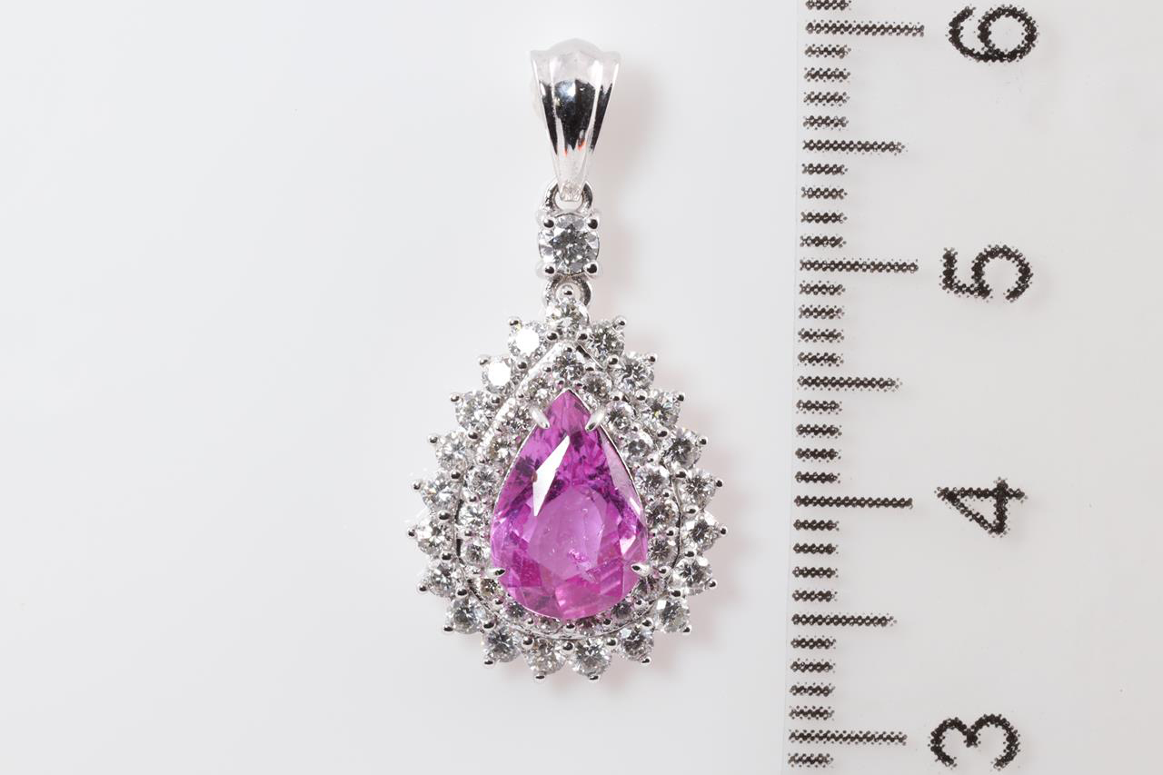 Sapphire and Diamond pendant with pear shape pink Sapphire of 2.02ct and Diamonds totalling 0.78cts (Estimated grading: H-I SI). 18ct white gold, no chain provided. Weight: 2.0g (As New)
