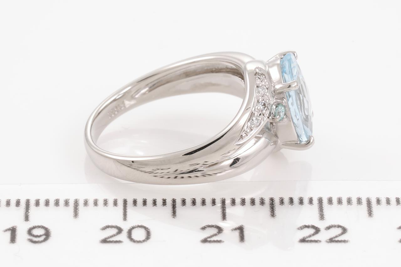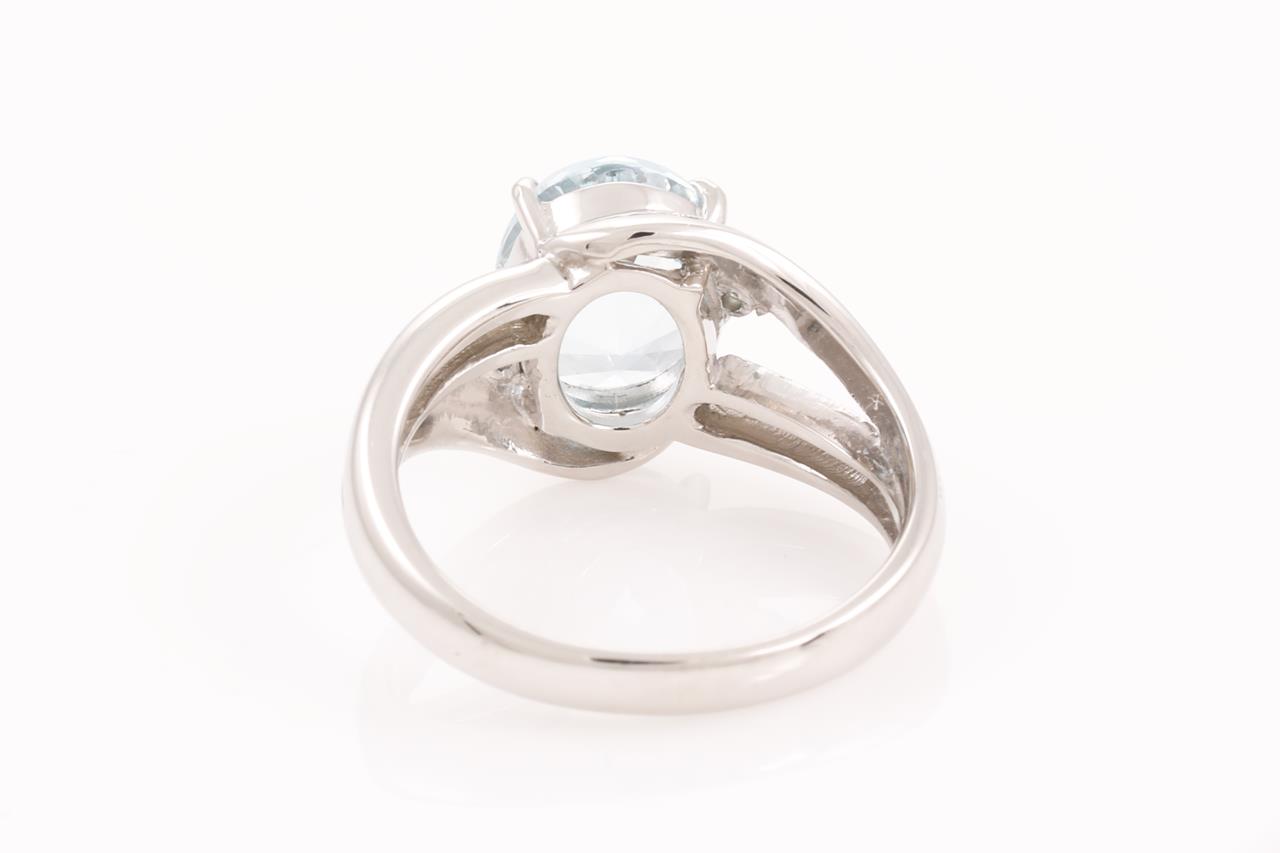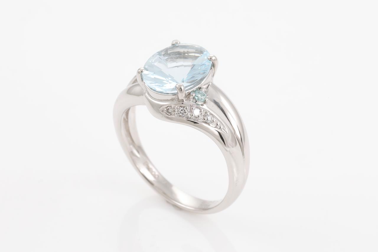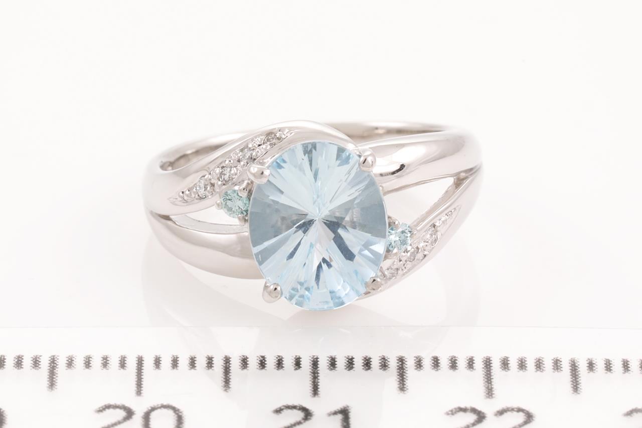 Aquamarine and Diamond Ring with an oval fancy cut Aquamarine of 2.03ct and white & treated blue Diamonds totalling 0.10cts. Platinum. Ring size M. Weight: 7.6g (Pre-owned)