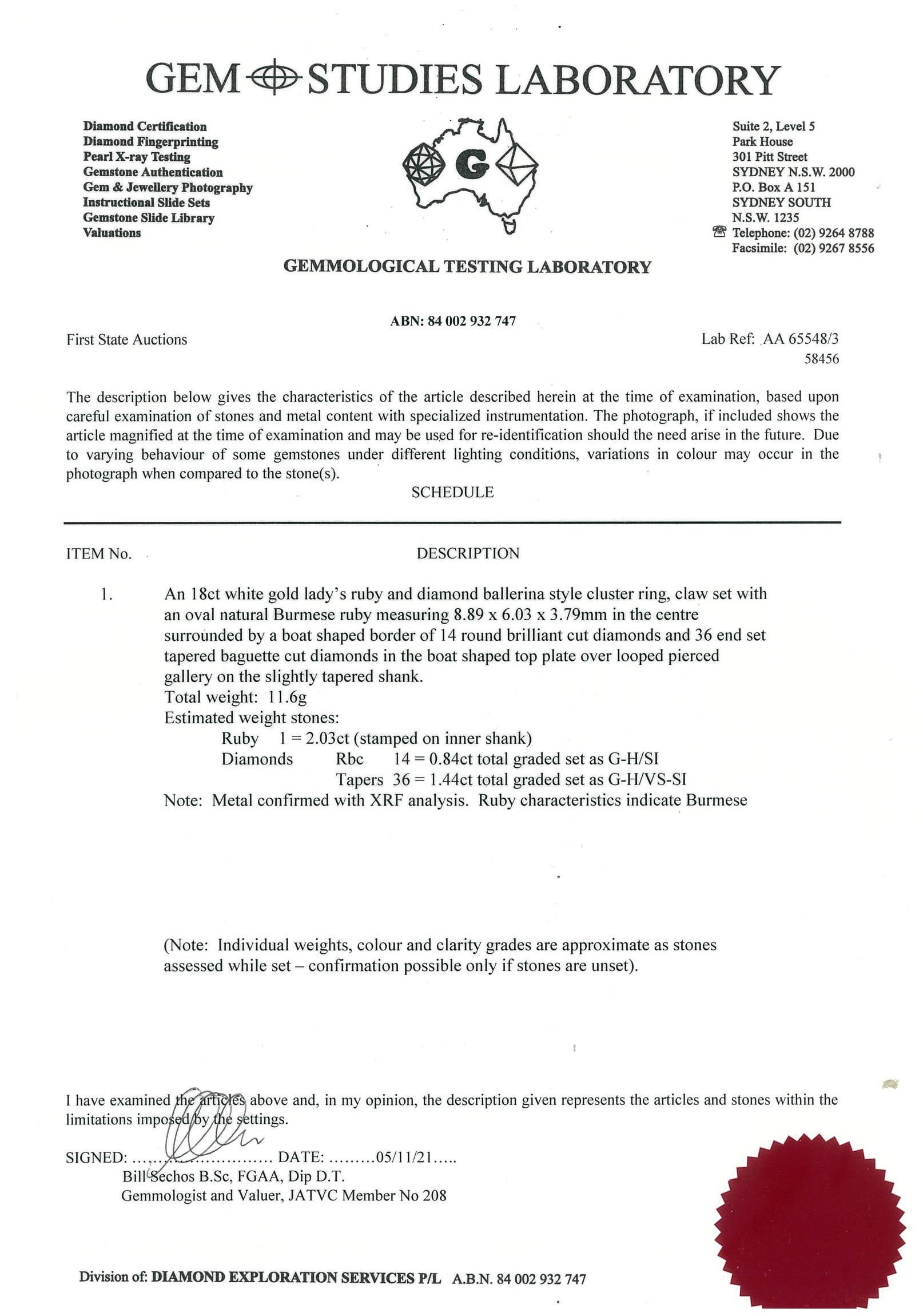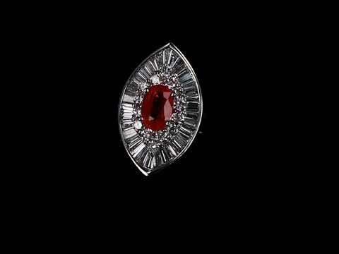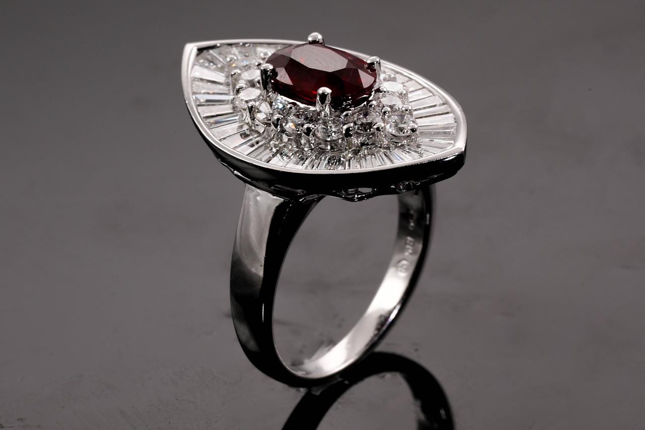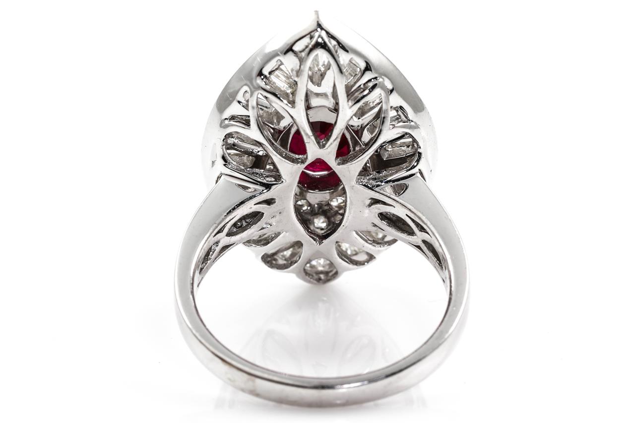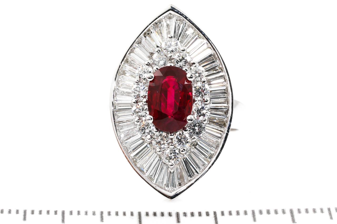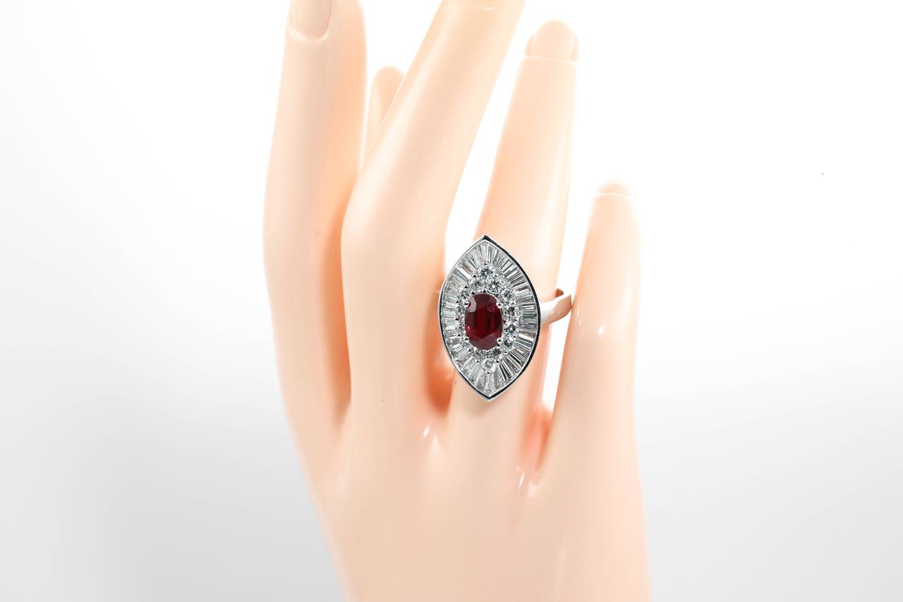 Ruby and Diamond ring with centre oval shape Burmese Ruby of 2.03ct with round and baguette Diamonds totalling approximately 2.28cts (Estimated grading G-H VS-SI). 18ct white gold. Ring size M 1/2. Weight 11.7g. With GSL Report #AA65548/3. (Pre-owned)