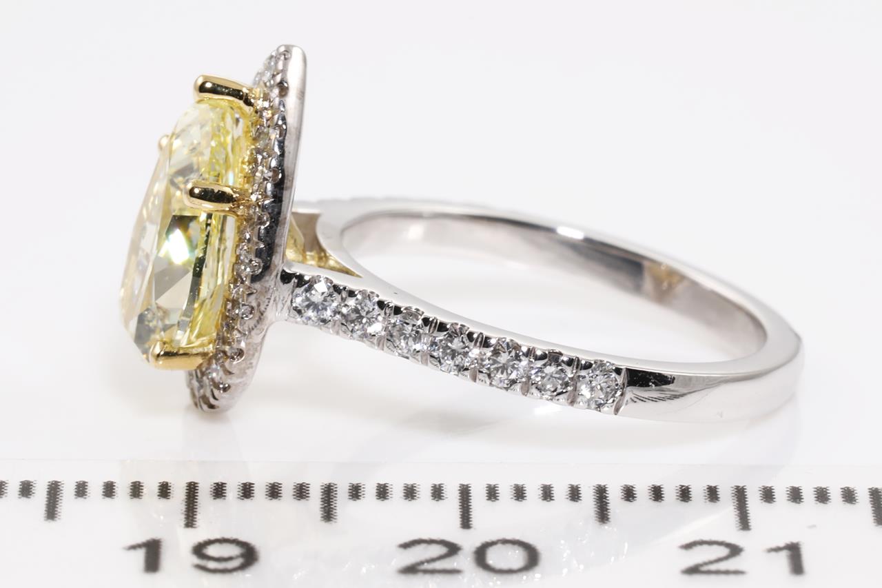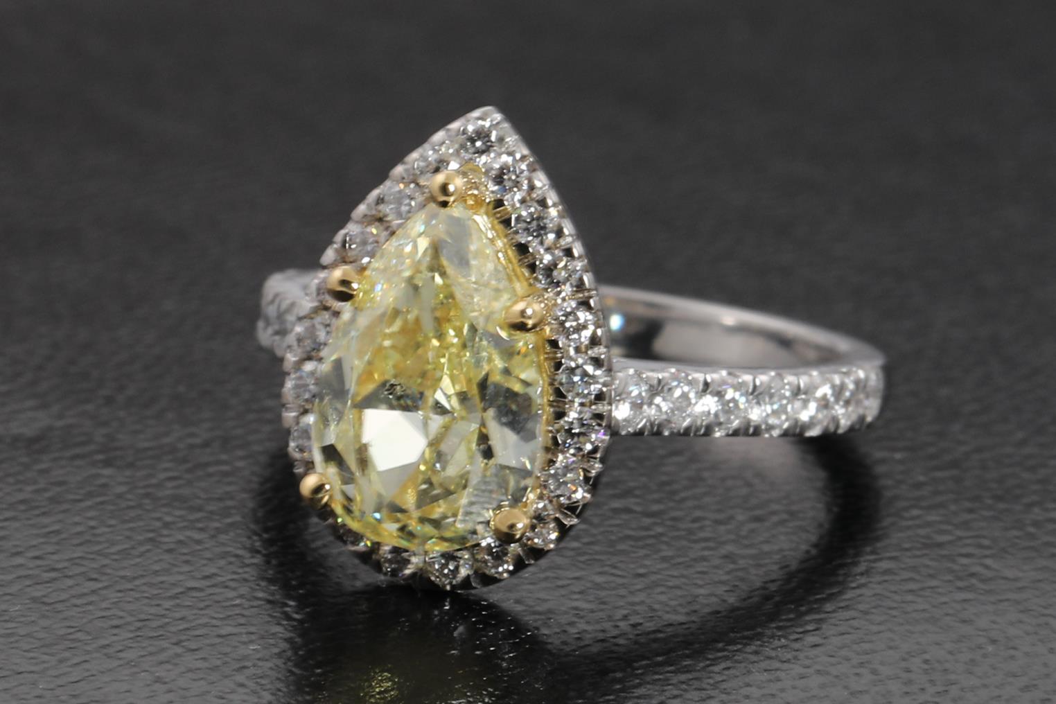 Diamond Halo Ring with centre pear cut Diamond of 2.03ct (With GIA report graded as Natural Fancy Light Yellow Even #6213108901) surrounded by round diamonds totalling 0.46cts (Estimated grading: G SI). 18ct yellow and white gold. Ring size K. Weight 5g. (New)