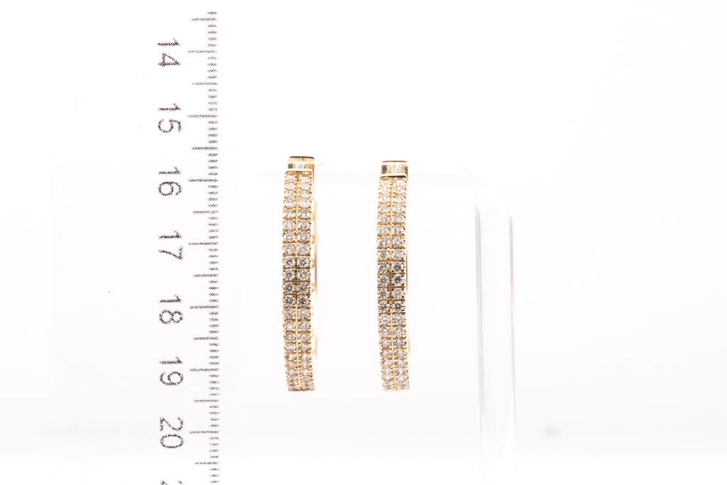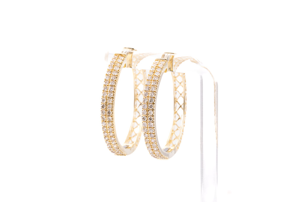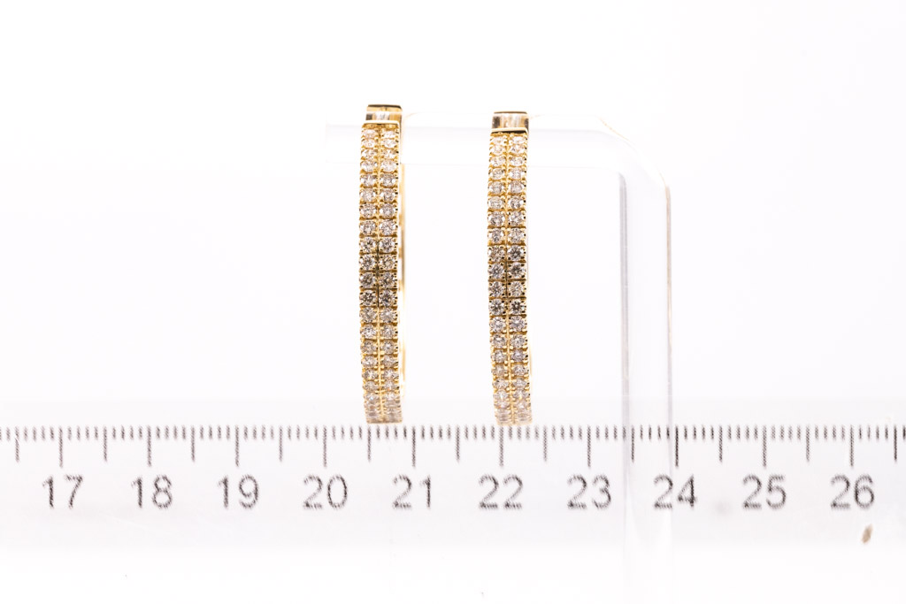 Diamond hoop earrings with 92 round Diamonds totalling 2.03cts (Estimated grading: H SI). 14ct yellow gold. Weight: 11.7g. With certificate #417220. (New)