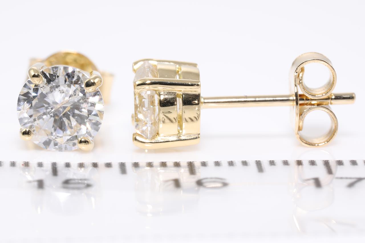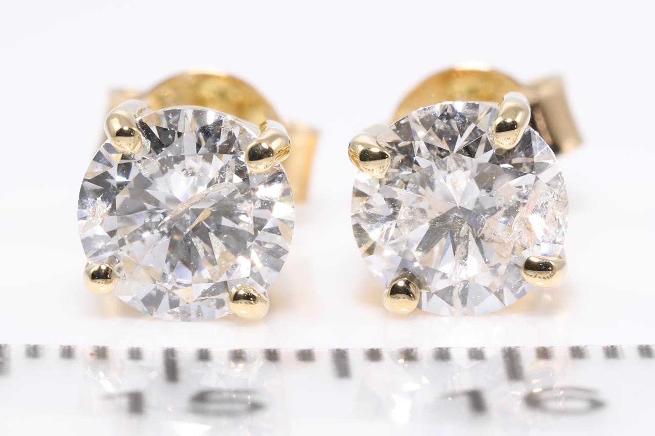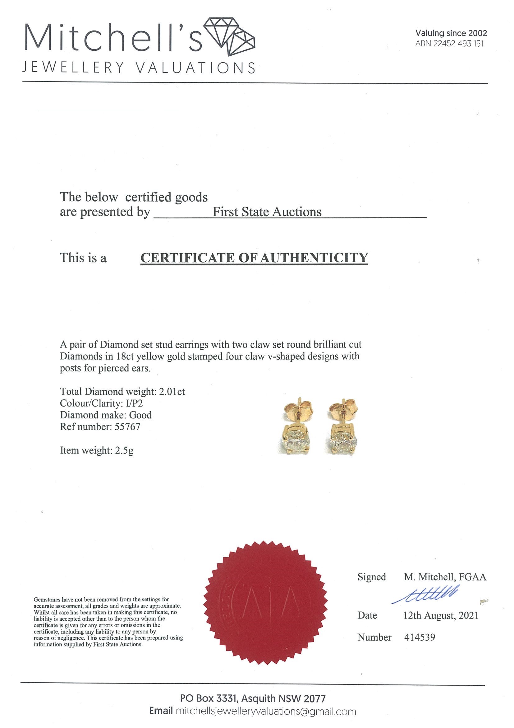 Diamond stud earrings with 2 round brilliant cut Diamonds totalling 2.03cts (Estimated grading: I P2). 18ct white gold. Weight: 2.5g. With certificate #414539 . (New).