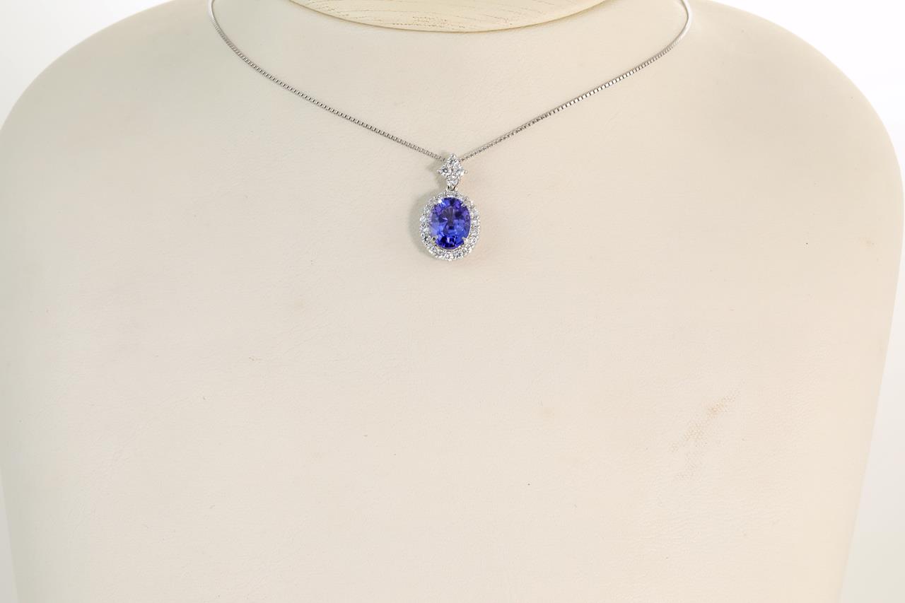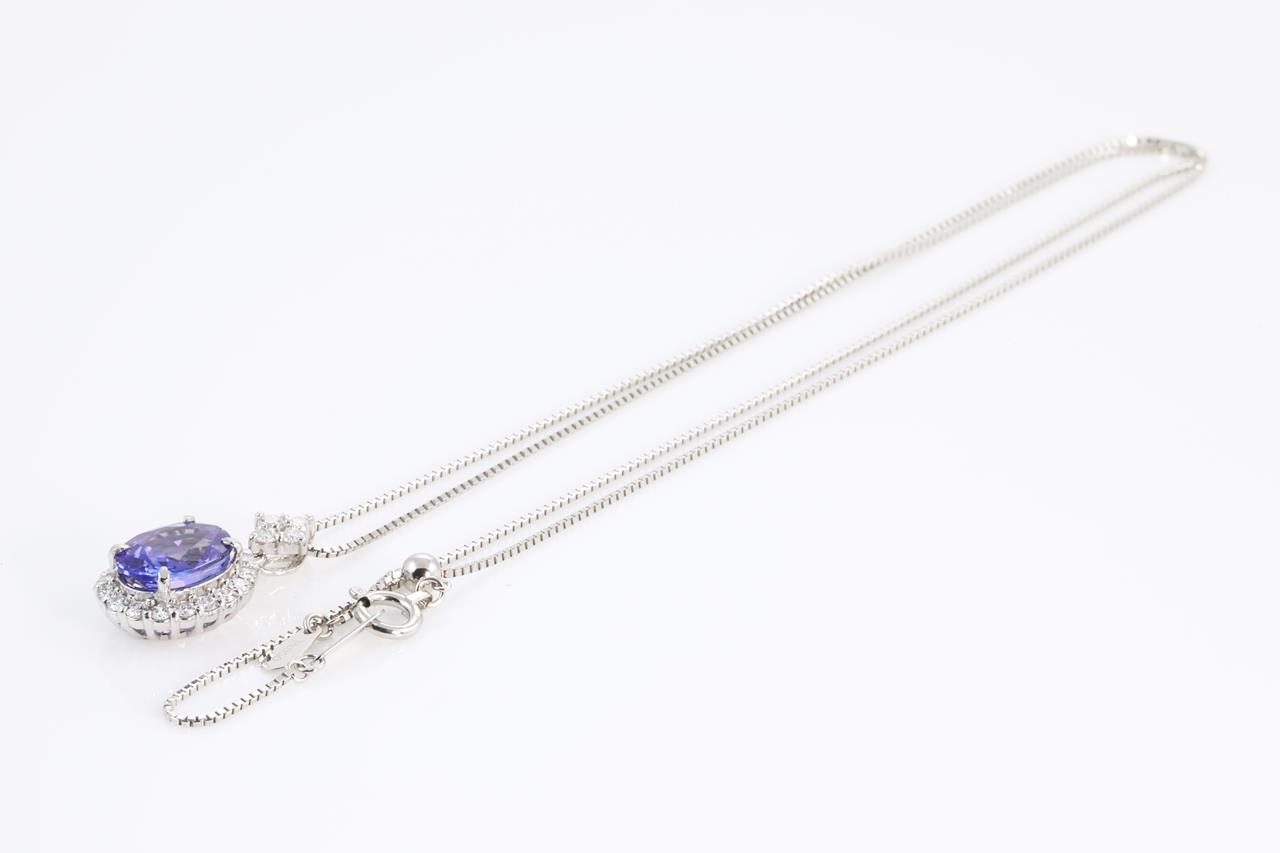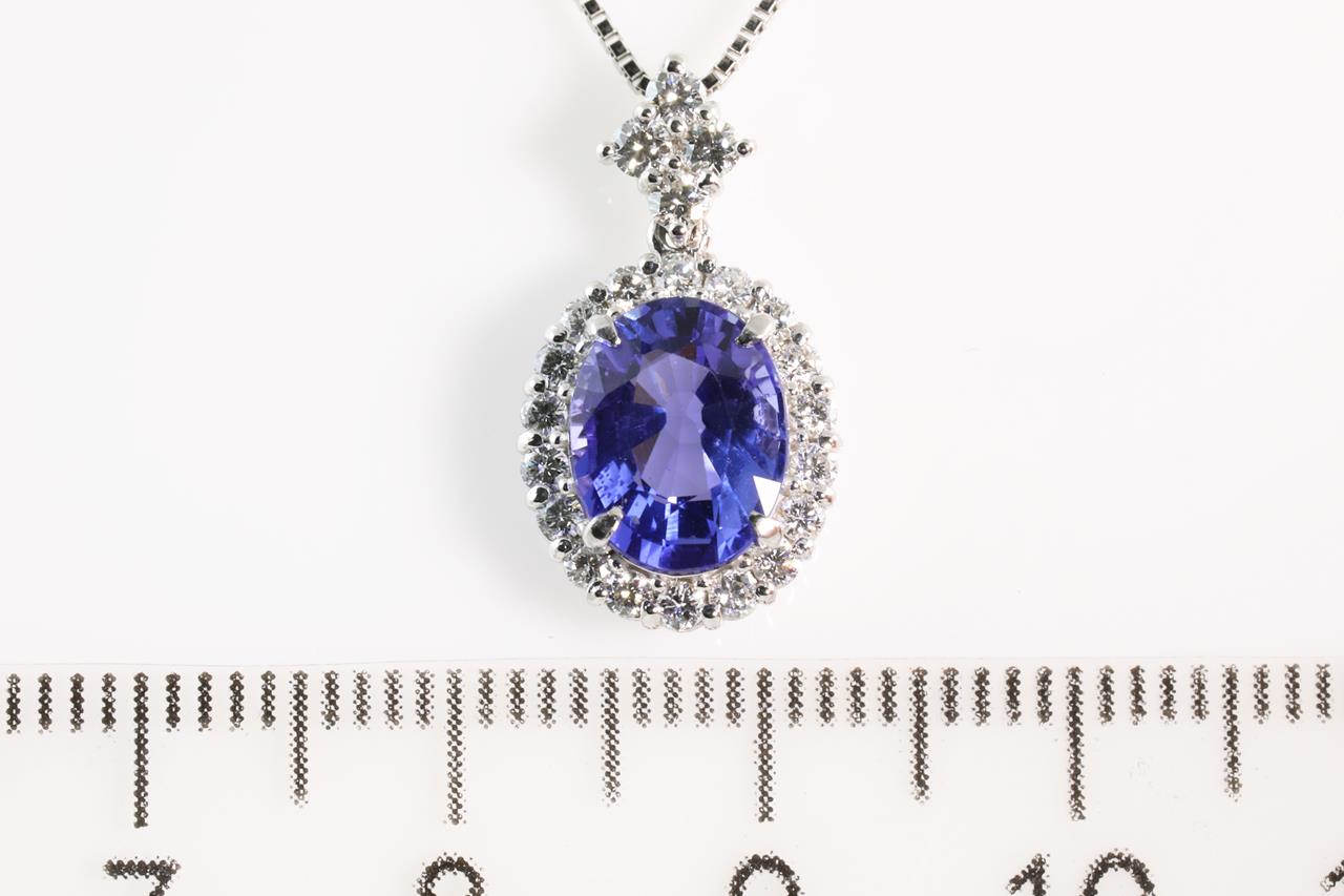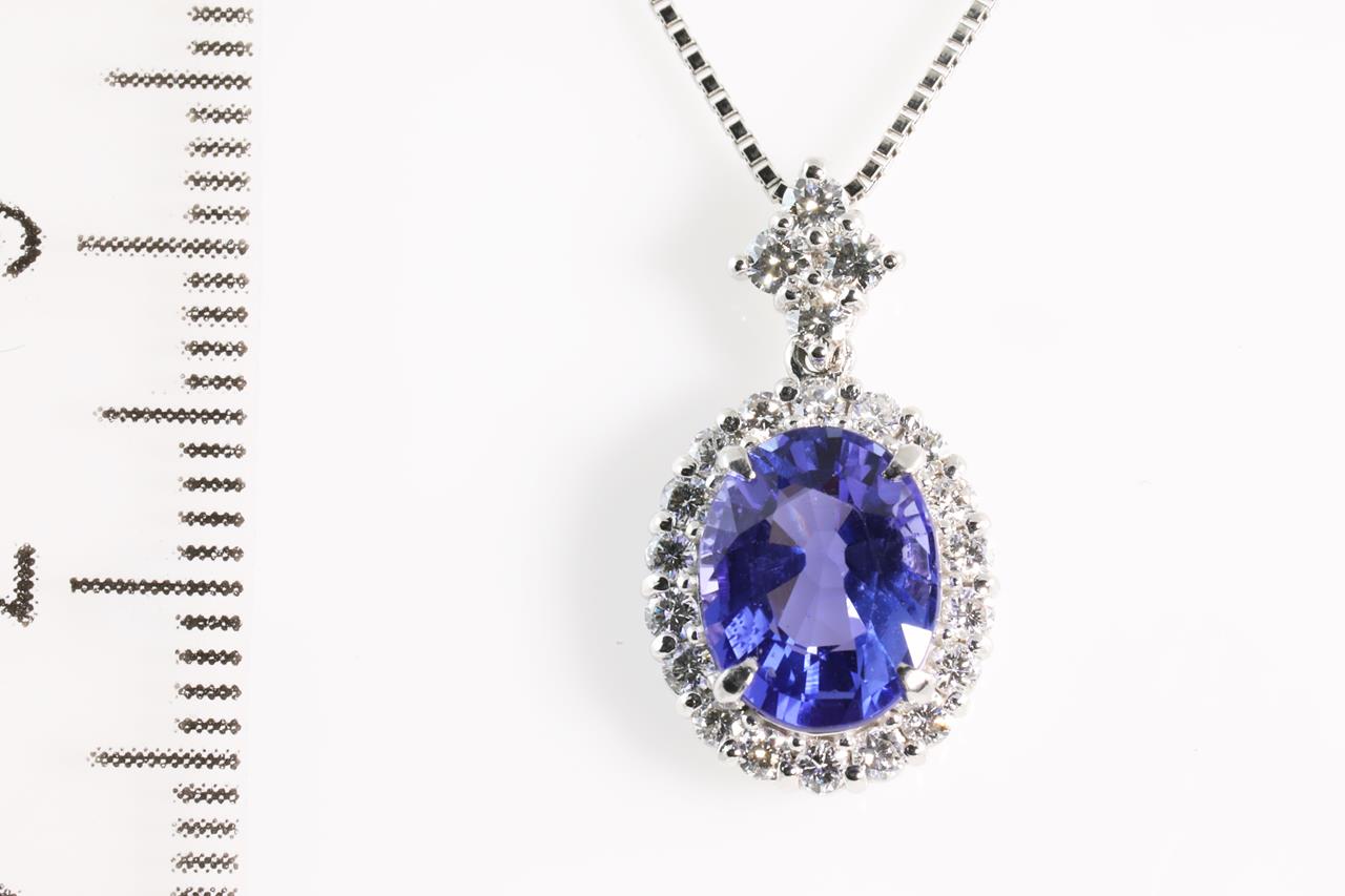 Tanzanite and Diamond pendant with oval Tanzanite of 2.03ct and round Diamonds totalling 0.39cts (Estimated grading: H SI). Platinum with platinum adjustable 45cm chain. Weight: 5.0g (Pre-owned)