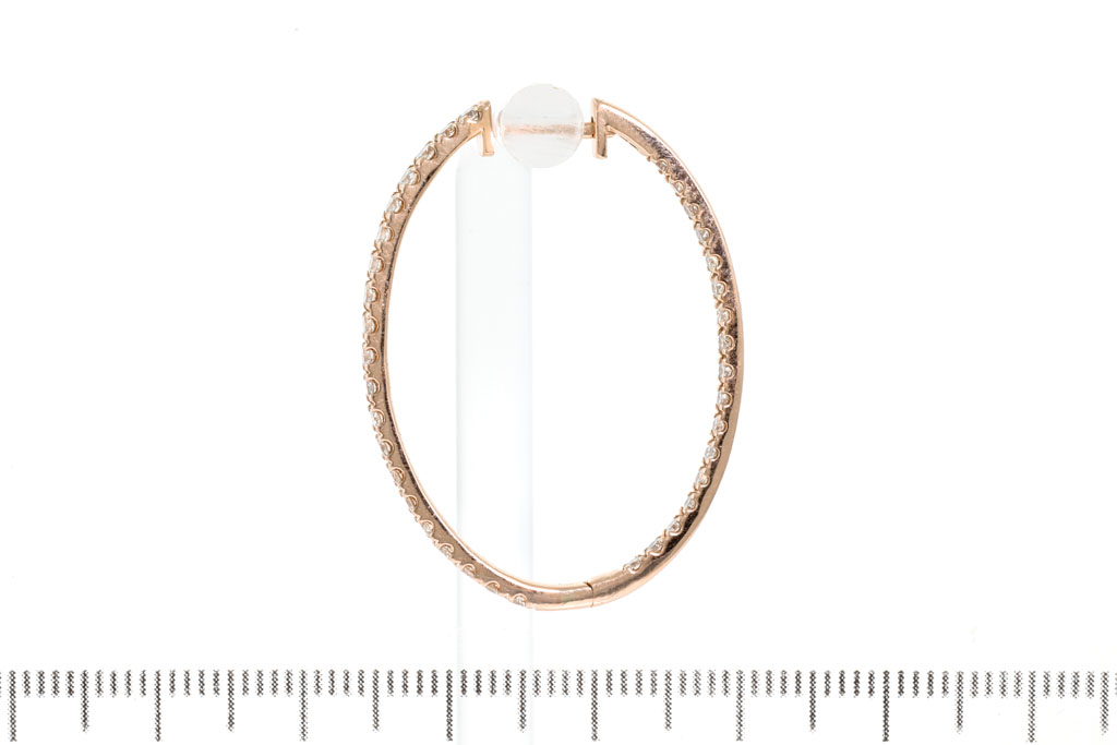 Diamond hoop earrings with 74 round Diamonds totalling 2.04cts (Estimated grading: H SI). Back of the hoop has the Diamonds set inside the hoop. 14ct rose gold. Weight: 7.2g. (New)