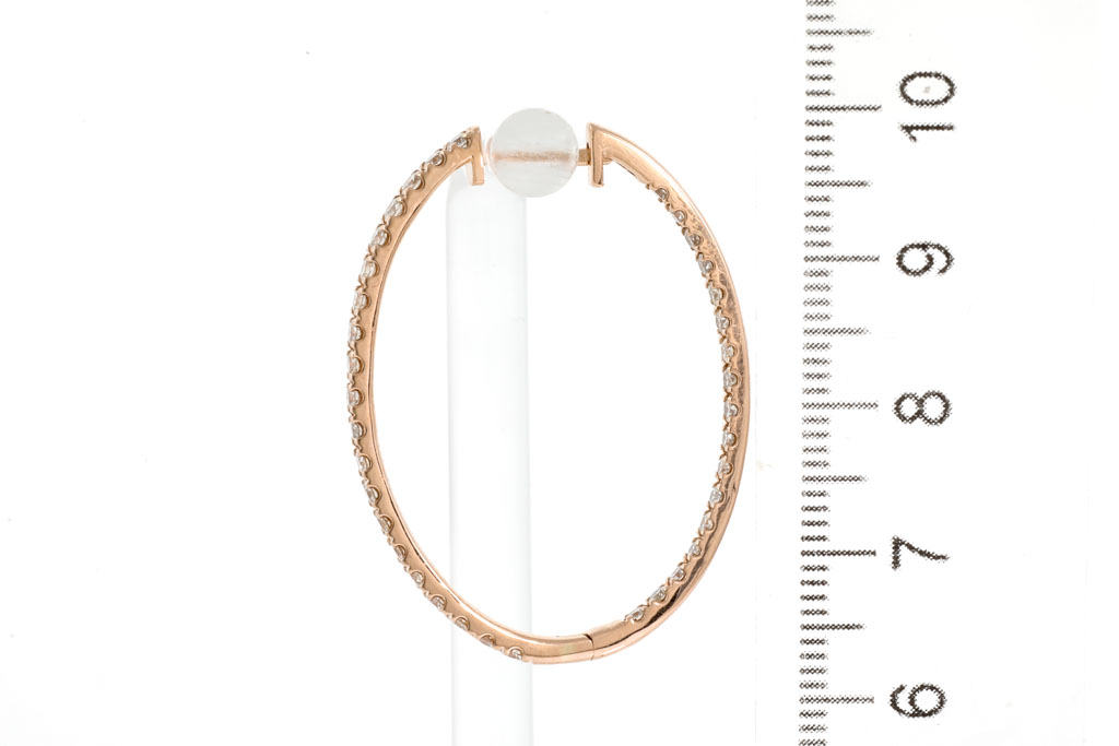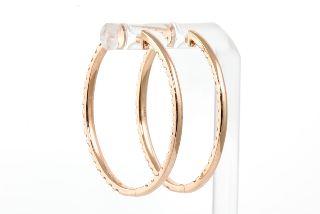 Diamond hoop earrings with 74 round Diamonds totalling 2.04cts (Estimated grading: H SI). Back of the hoop has the Diamonds set inside the hoop. 14ct rose gold. Weight: 6.9g. (New)