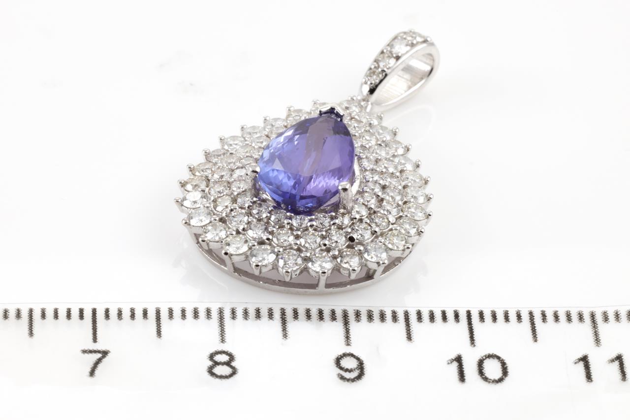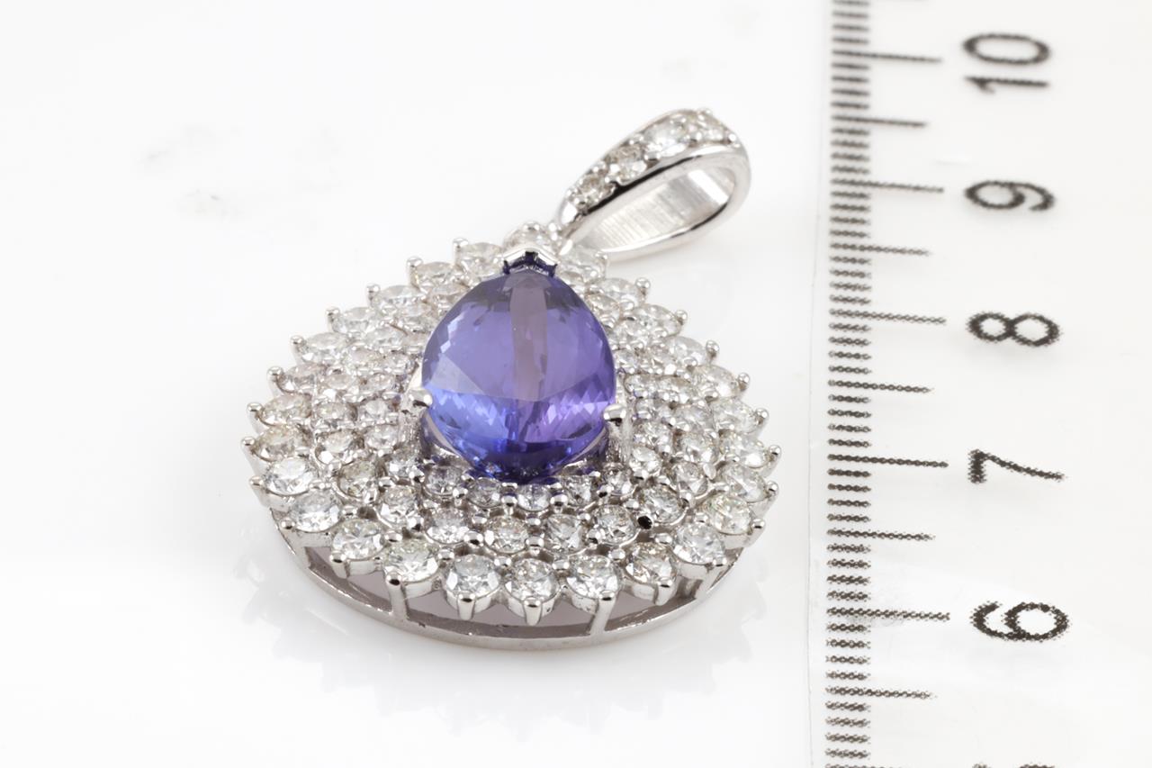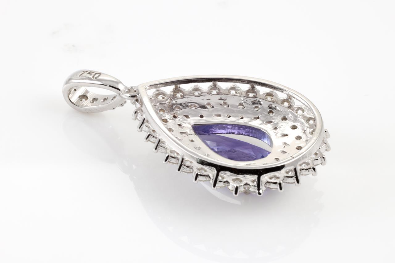 Tanzanite and Diamond pendant with a pear shape Tanzanite of 2.04ct and Diamonds totalling 3.05cts (Estimated grading: G VS-SI). 18ct white gold. No chain provided. Weight: 6.4g (As New).